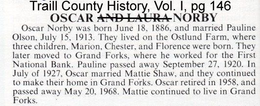 This family history folder has a copy of a brief article published on page 146 in Vol. I in the Traill County History book on the life of Oscar Norby, Ole and Marie's oldest of four children [see article, below]. Oscar was born on 18 June 1886 in Bloomfield Township in Traill County, where he was then raised and schooled until his parents, Ole and Marie Norby, moved to the City of Hillsboro [see TCHS Family History Catalogit entry 2023.429.1].