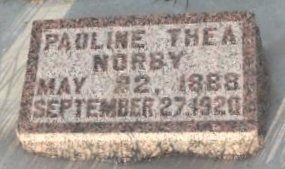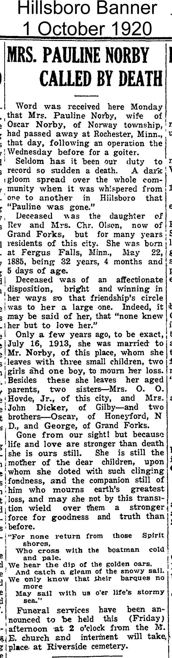 As noted earlier, Oscar Norby's wife, Pauline Thea Norby, died at the age of only 32 on 27 September 1920 at the Mayo Clinic in Rochester, MN, after a goiter operation [Obit, Hillsboro Banner, 1 October 1920]. After a funeral service in Hillsboro, Pauline (Olsen) Norby was interred at Hillsboro's Riverside Cemetery.