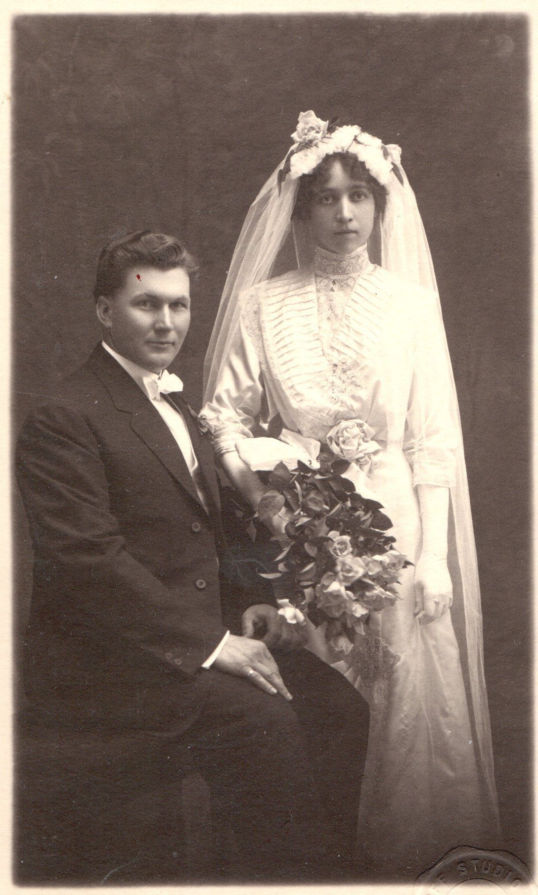 On 15 July 1913, Oscar Norby, 27, married Pauline Thea Olsen, 25, of Hillsboro [wedding photo, left]. Pauline was born on 22 May 1888 in Minnesota, and in the 1900 US Census lived with her parents, Chris and Martha Olsen, and six siblings on Sargeant Street in Hillsboro.