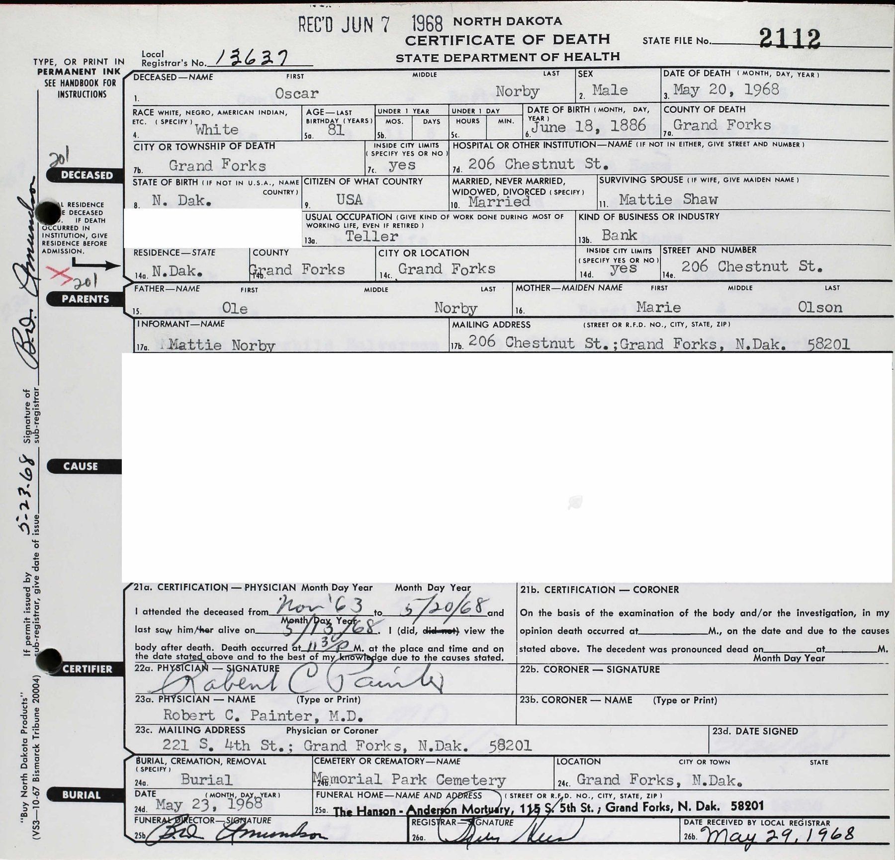 Oscar Norby passed away, age 81, on 20 May 1968 in Grand Forks [ND Death Certif., below]. Oscar was interred at Memorial Park Cemetery in Grand Forks [Grave-marker photo, below]. Mattie (Shaw) Norby lived to the grand age of 99, passing away on 31 January 1992 in St. Paul [MN Death Index]. Mattie was also interred at Memorial Park Cemetery in Grand Forks [US Find-a-Grave info].Acquisition