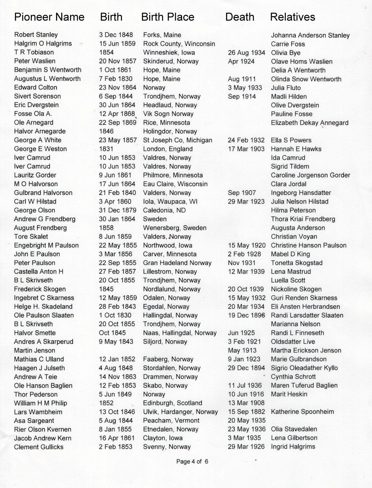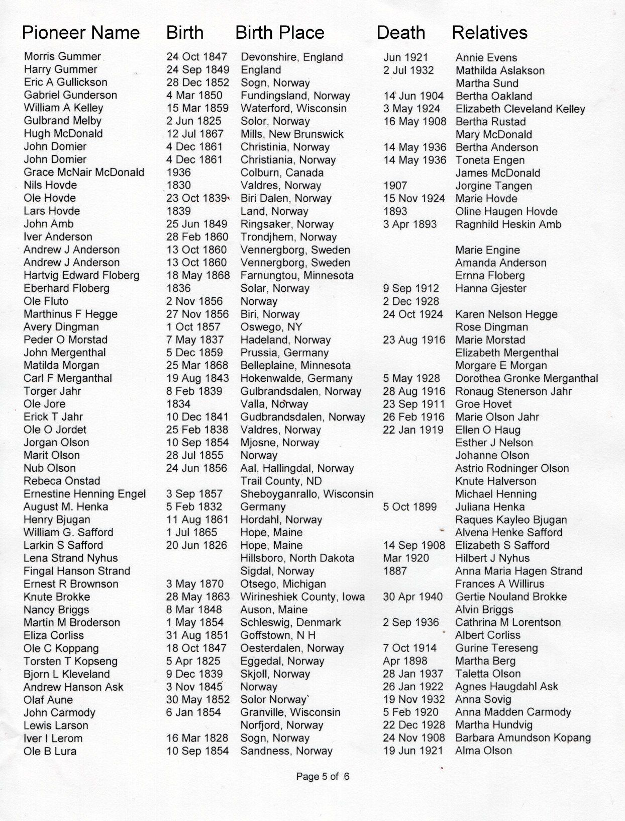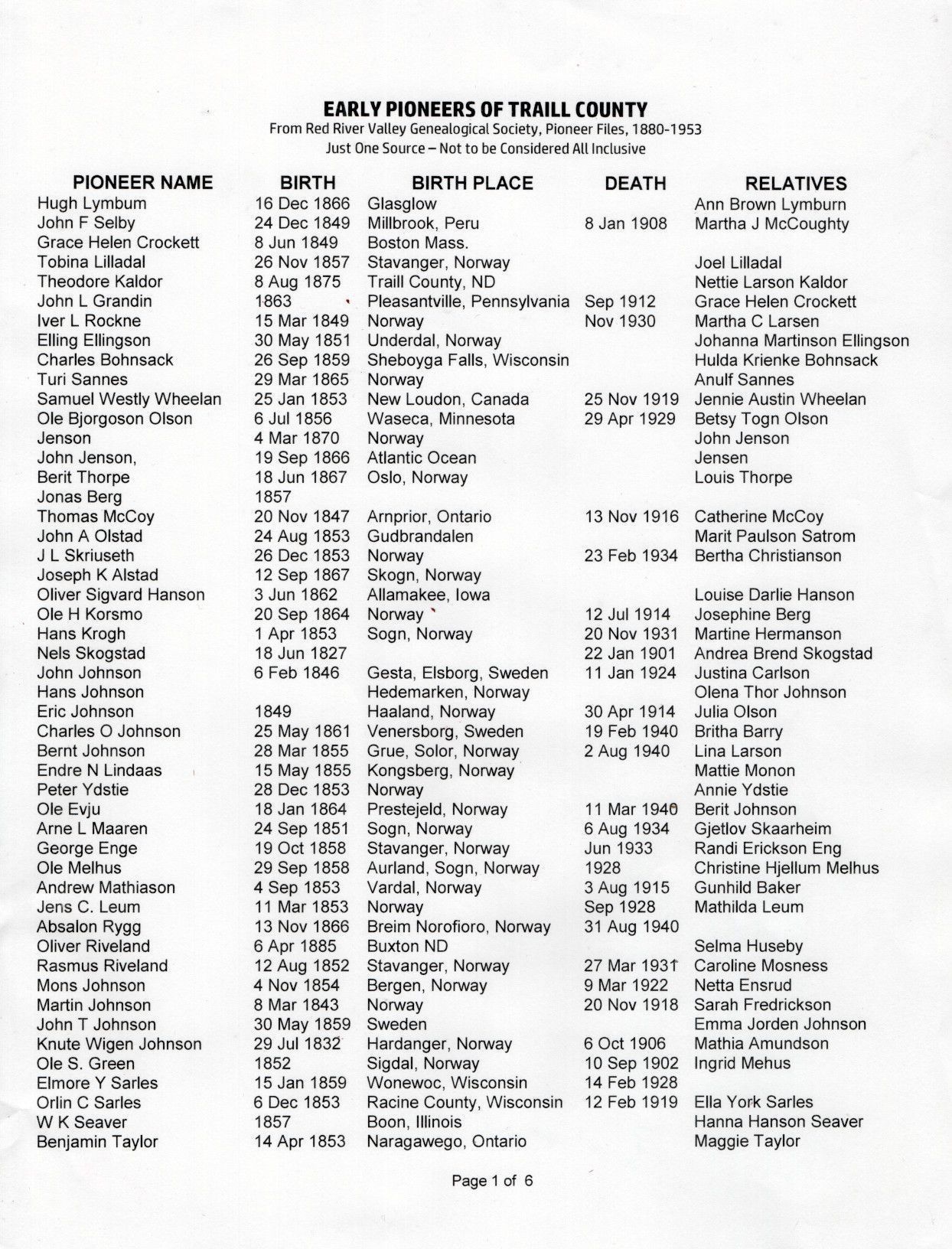 This Catalogit entry is a six-page document listing the names of Early Pioneers of Traill County, North Dakota. This list was compiled by Red River Genealogical Society from Pioneer Files, 1880 - 1953, for Terry Bachmeier of Mesa, AZ, who donated this list to the TCHS Plummer House Museum in Hillsboro. When known, the list includes the dates of birth and death of the Traill County pioneer, their place of birth, and the name of a relative.