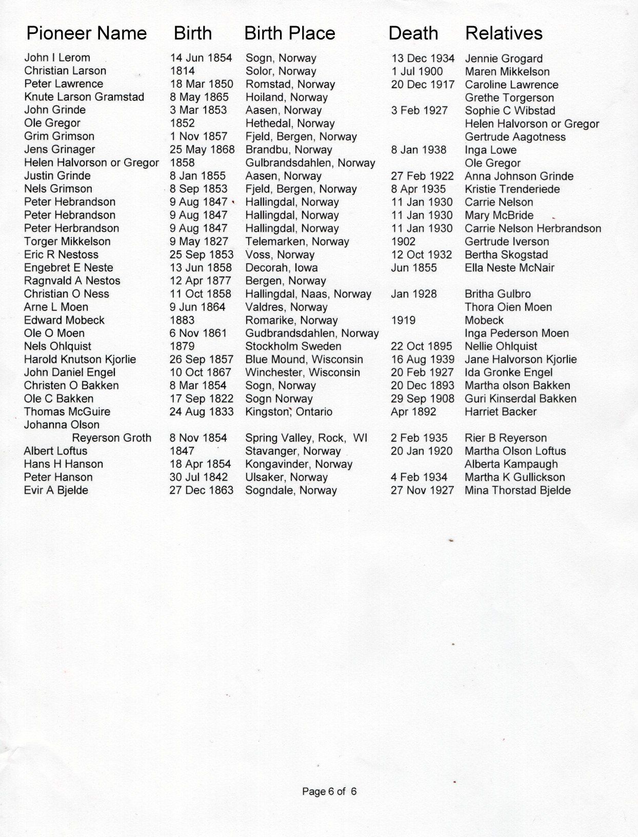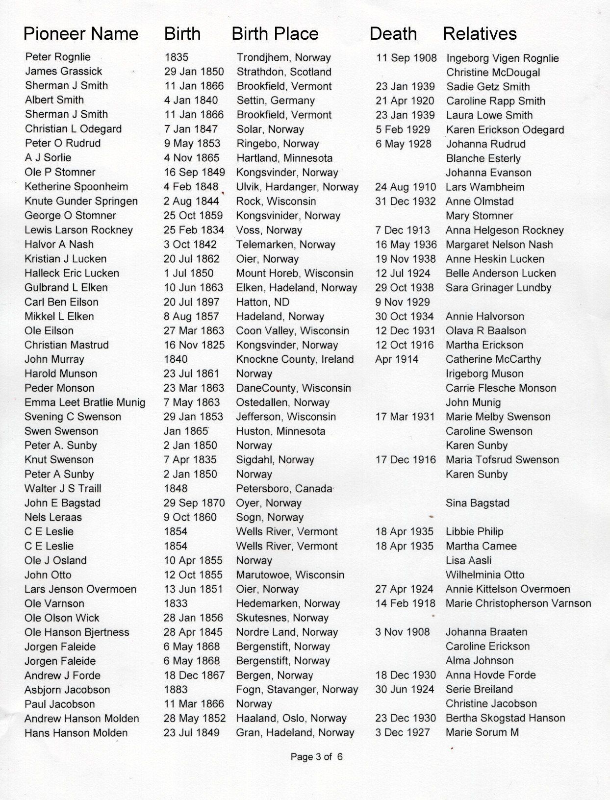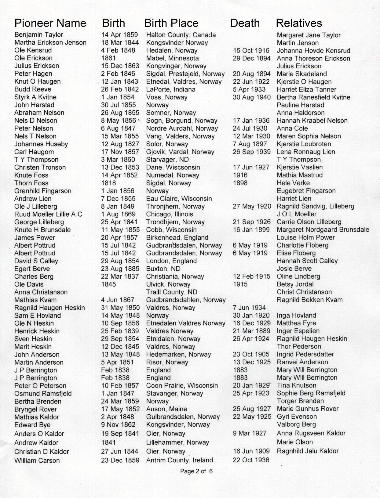 This Catalogit entry is a six-page document listing the names of Early Pioneers of Traill County, North Dakota. This list was compiled by Red River Genealogical Society from Pioneer Files, 1880 - 1953, for Terry Bachmeier of Mesa, AZ, who donated this list to the TCHS Plummer House Museum in Hillsboro. When known, the list includes the dates of birth and death of the Traill County pioneer, their place of birth, and the name of a relative.