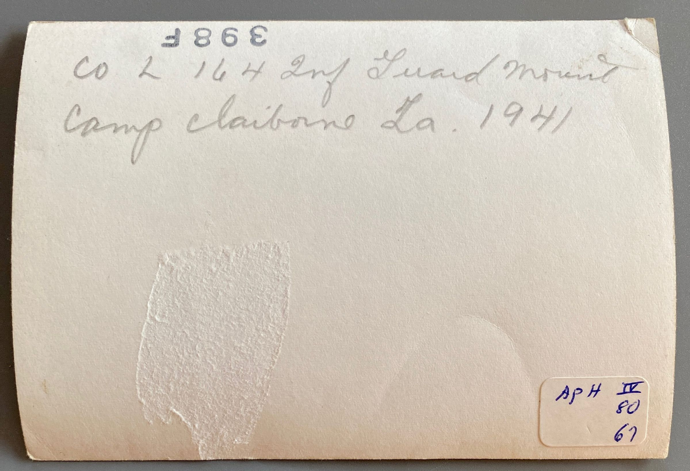 A 1941 photograph of ND National Guard, Company L Infantry troops in formation while training during WWII Camp Claiborne, LA.Cataloged By