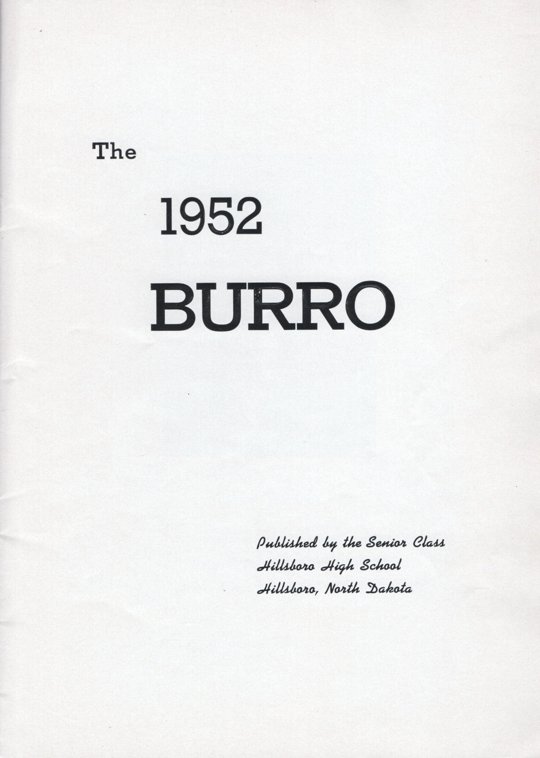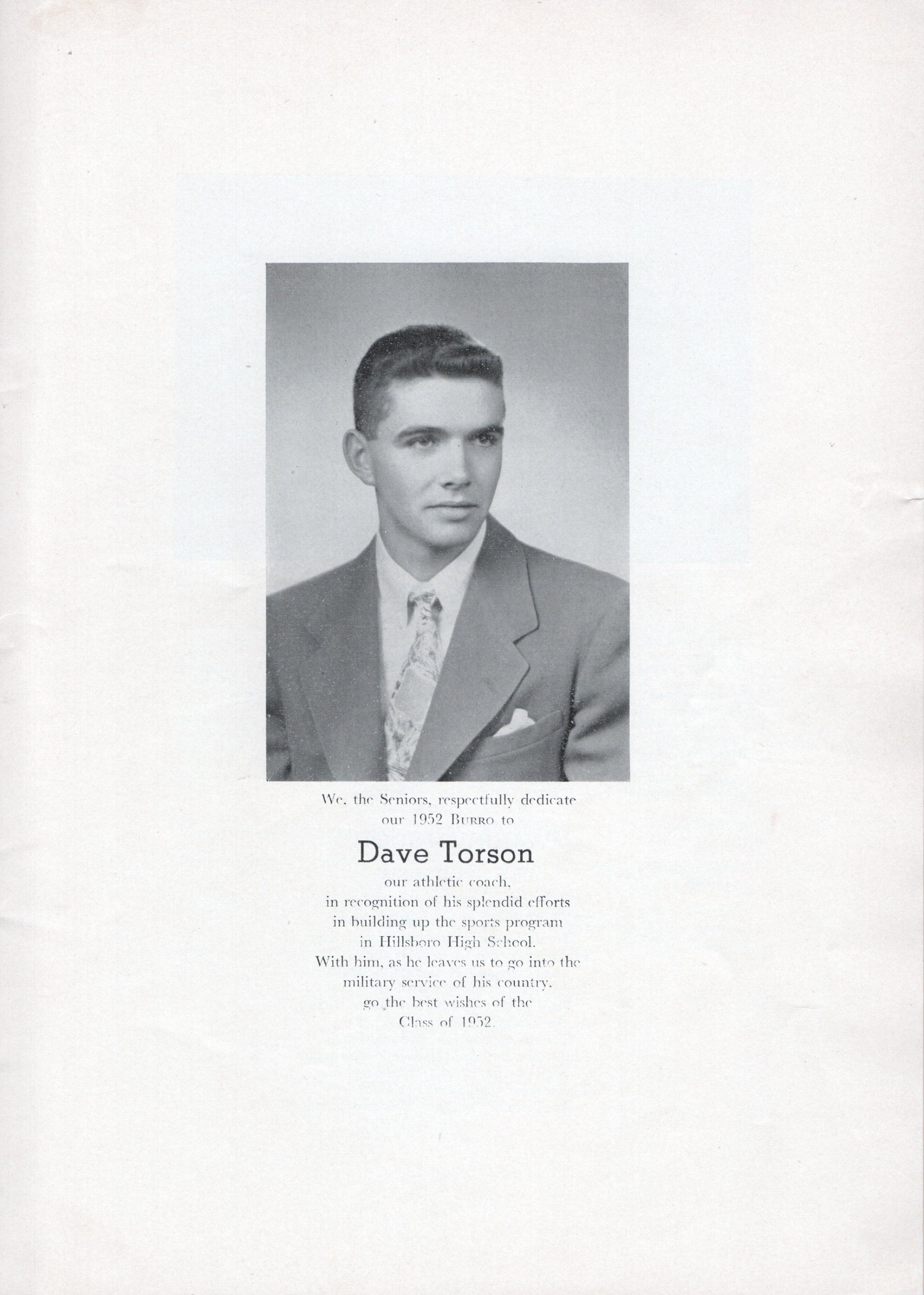 The Class of 1952 Hillsboro High School Yearbook, titled The 1952 Burro, was dedicated to athletic coach, Dave Torson.