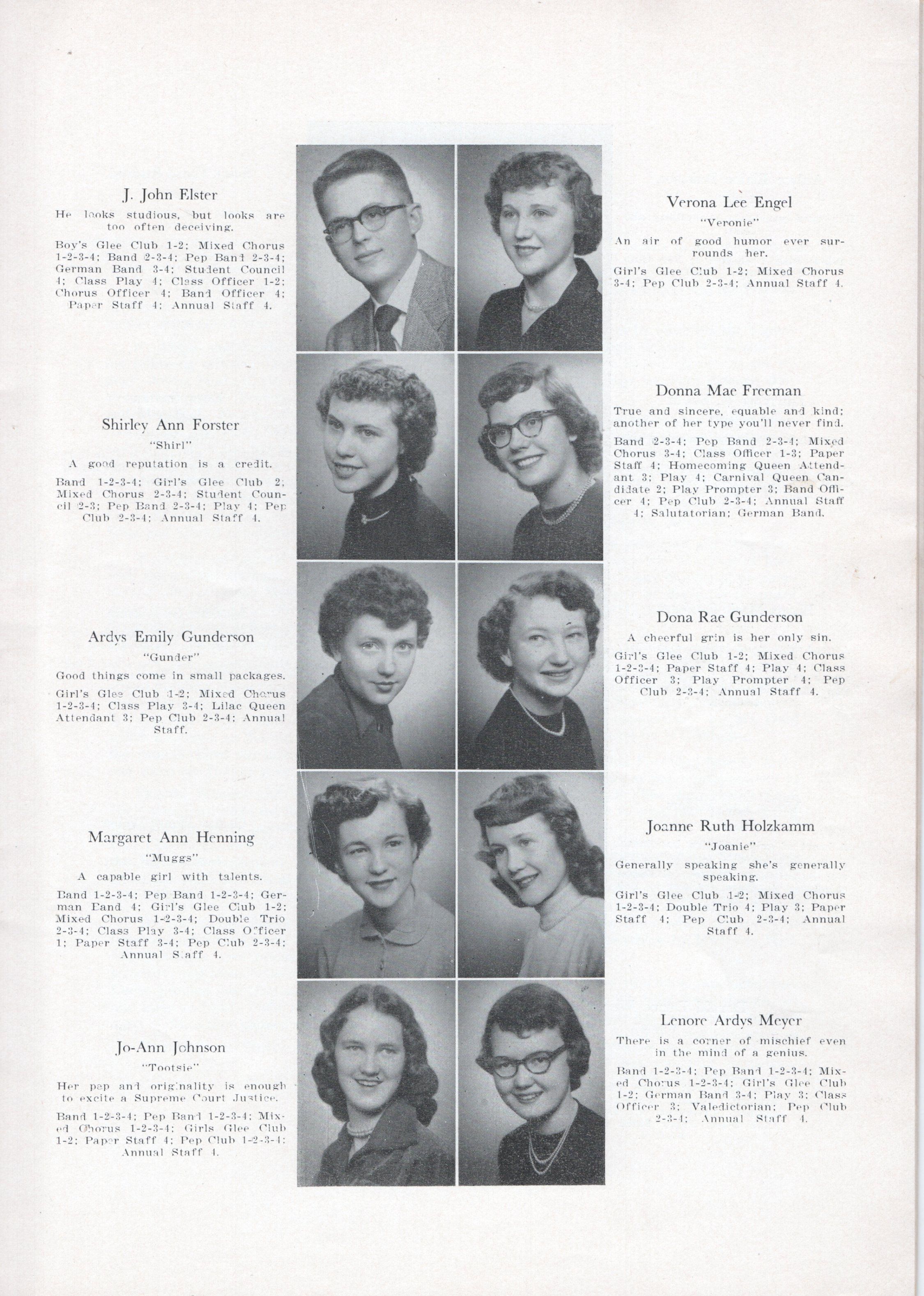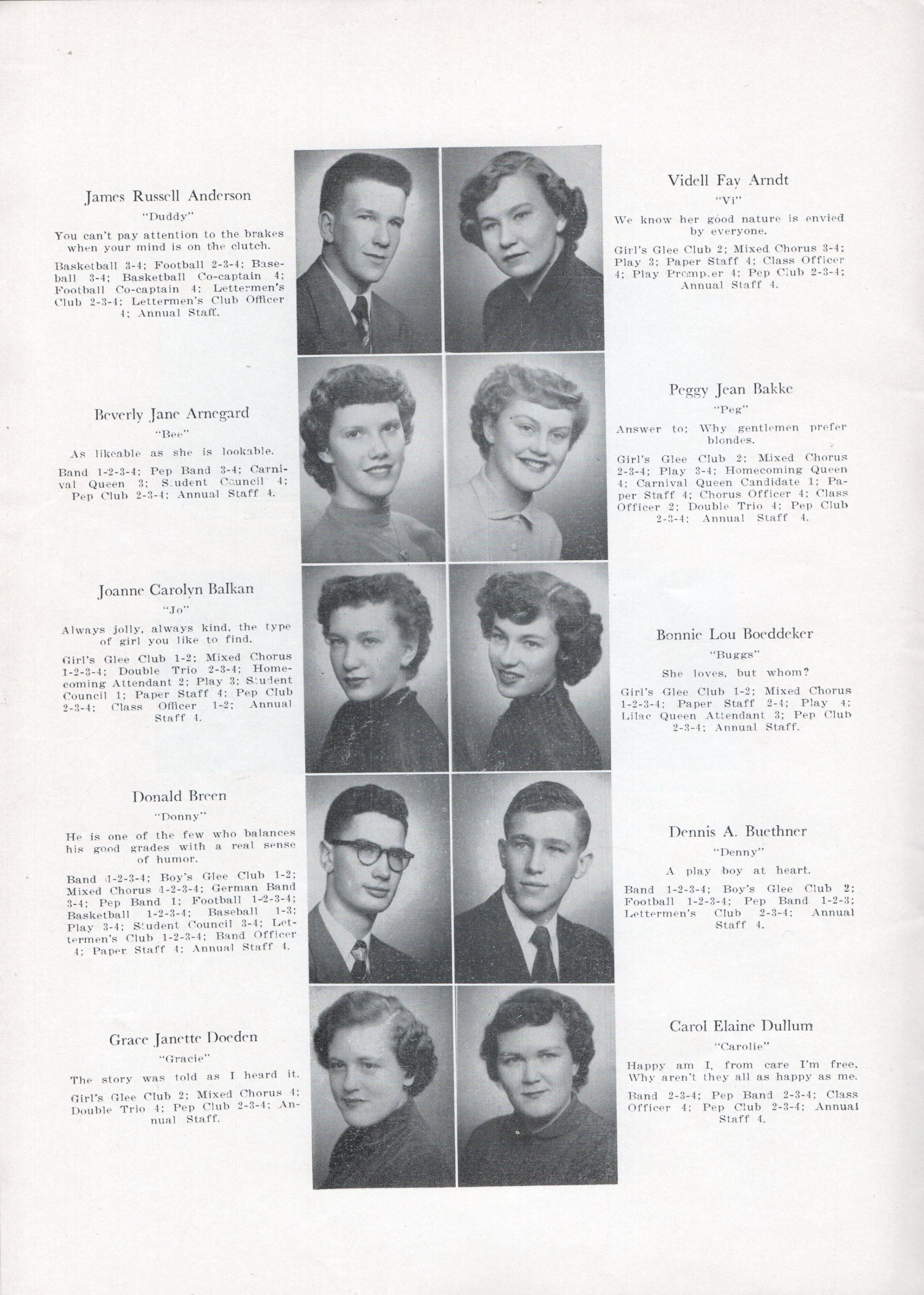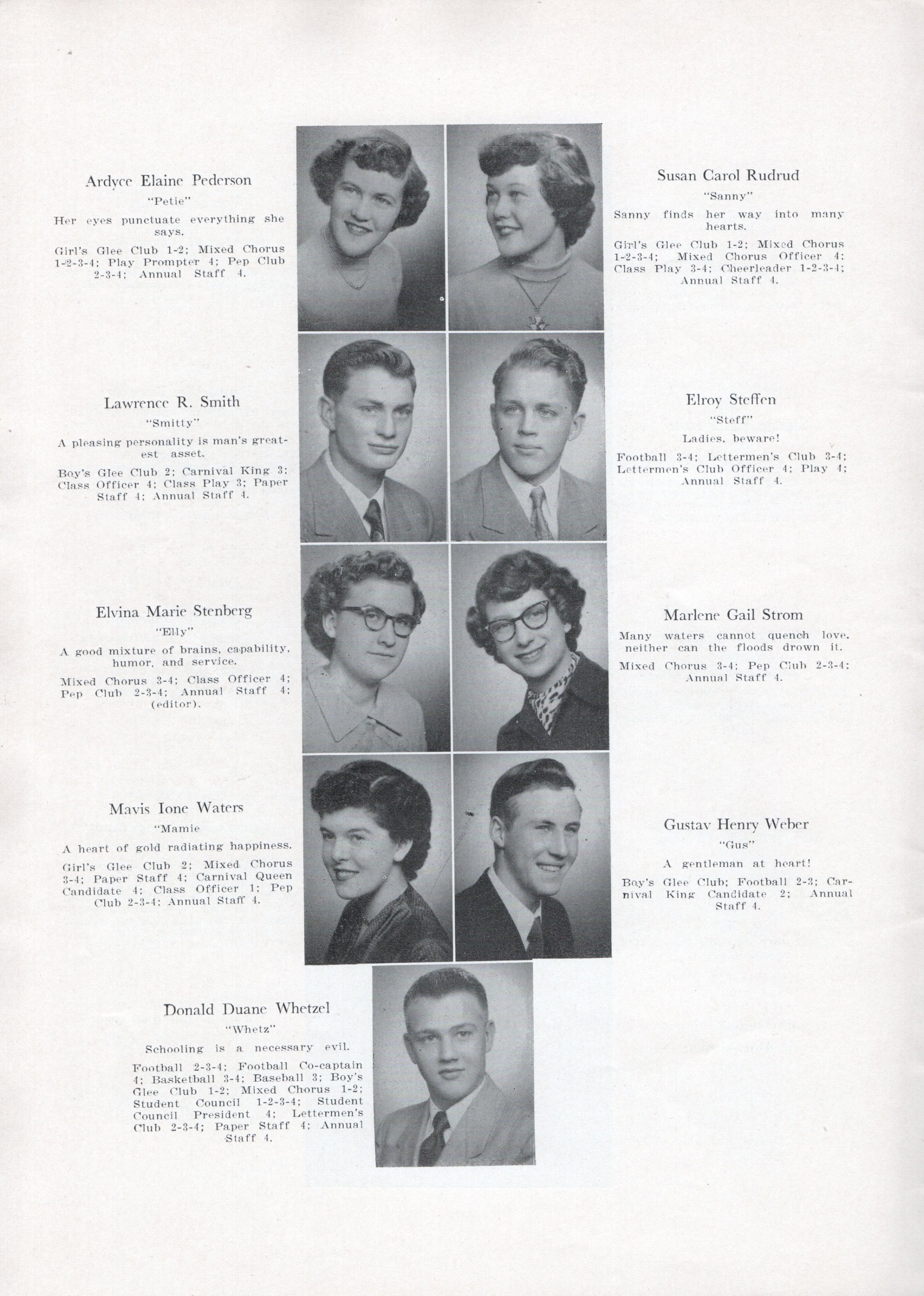 This 1952 yearbook includes three pages of Class of 1952 Senior student photographs for: James Anderson, Videll Fay Arndt, Beverley Jane Arnegard, Peggy Jean Bakke, Joanne Carolyn Balkan, Bonnie Lou Boeddeker, Donald Breen, Dannis Buethner, Grace Janette Doeden, Carol Elaine Dullum, J. John Elster, Verona Lee Engel, Shirley Ann Forster, Donna Mae Freeman, Ardys Emily Gunderson, Dona Rae Gunderson, Margaret Ann Henning, Joanne Ruth Holzkamm, Jo-Ann Johnson, Lenore Ardys Meyer, Ardyce Elaine Pederson, Susan Carol Rudrud, Lawrence Smith, Elroy Steffen, Elvina Marie Stenberg, Marlene Gail Strom, Mavis Ione Waters, Gustav Henry Weber, and Donald Whetzel.
