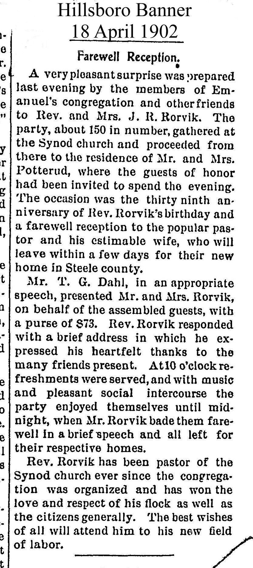 Rev. J. R. Rorvik - First Pastor of Synod Lutheran Church (now Our Savior's Lutheran Church, Hillsboro, ND). Rev. Rorvik served until 1902, when he and wife moved to serve a church in Steele County, ND.Cataloged By
