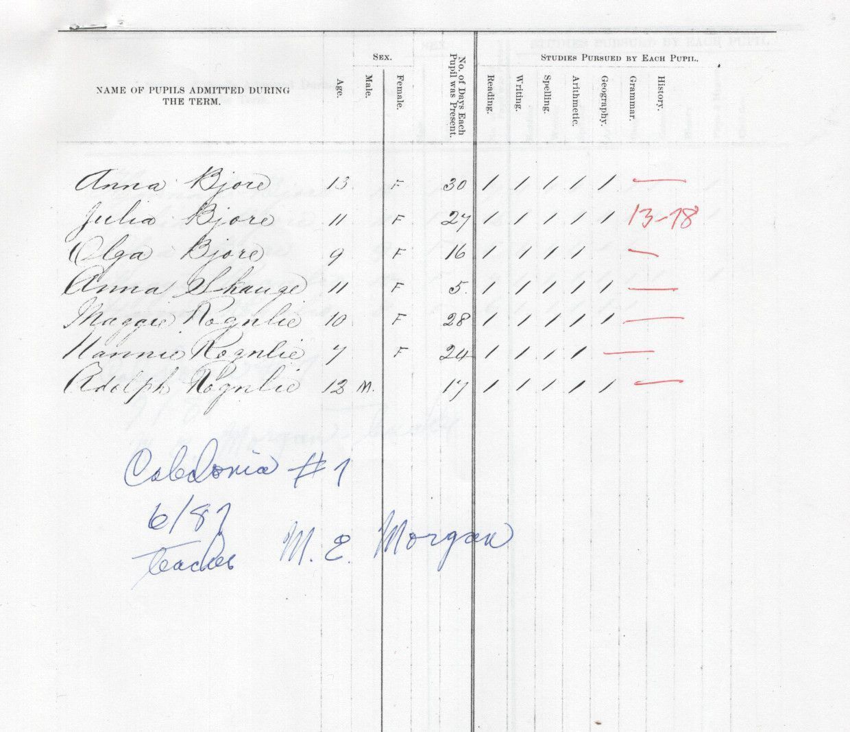 In June 1887, Caledonia School No. 7 teacher M. E. Morgan reported attendances and studies pursued for 7 students, including Anna Bjore, Julia Bjore, Olga Bjore, Anna Shauge, Adolph Rognlie, Maggie Rognlie, and Mannie Rognlie.