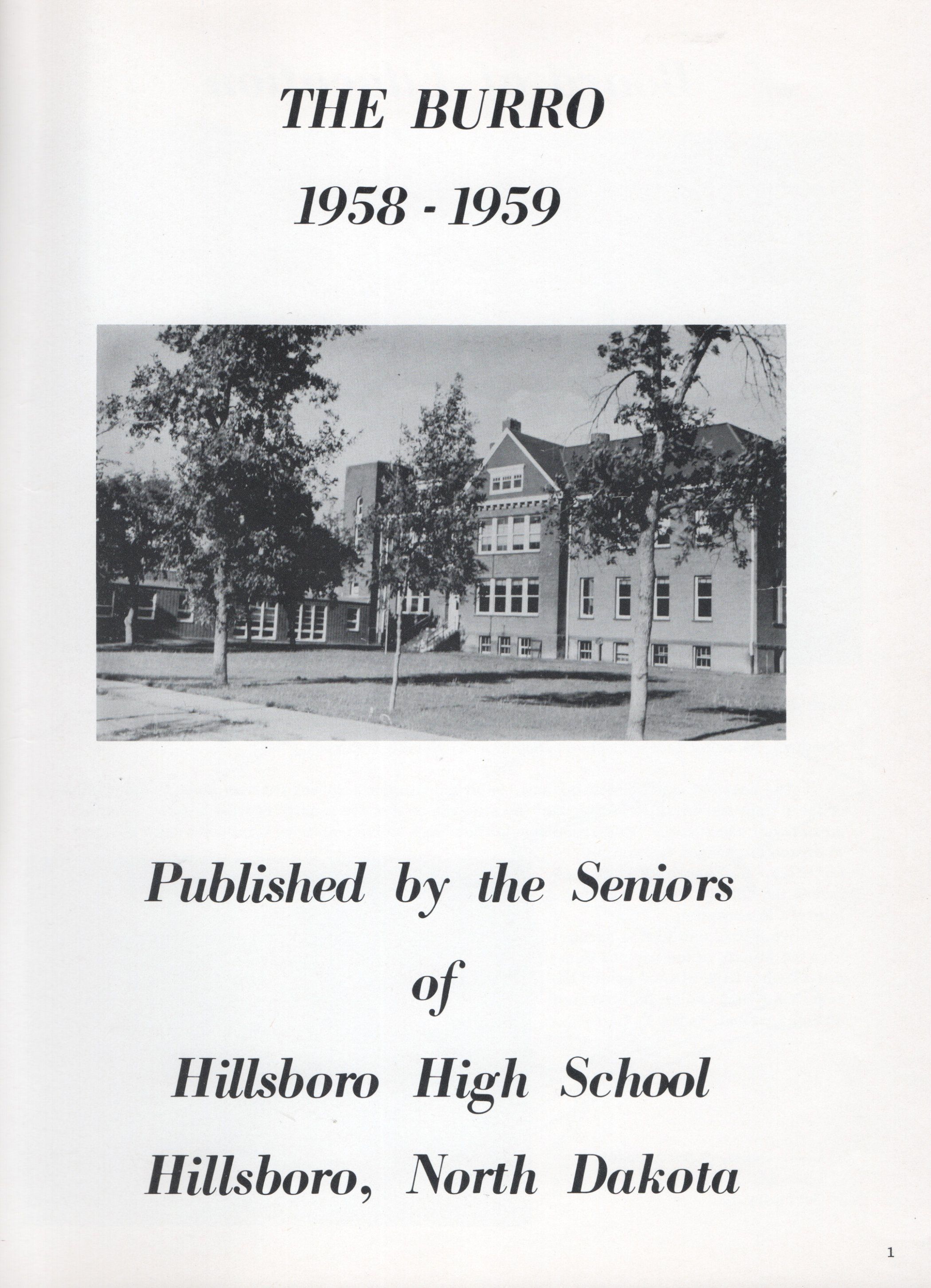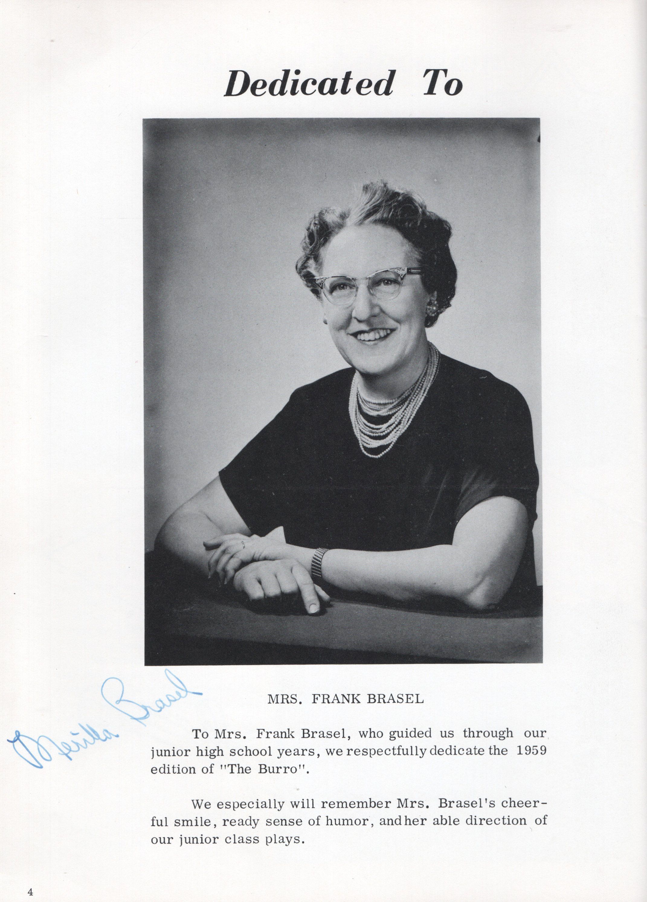 The Class of 1959 Hillsboro High School Yearbook, titled: The Burro 1958 - 1959, was dedicated to Mrs. Frank (Merilla) Brasel, teacher.