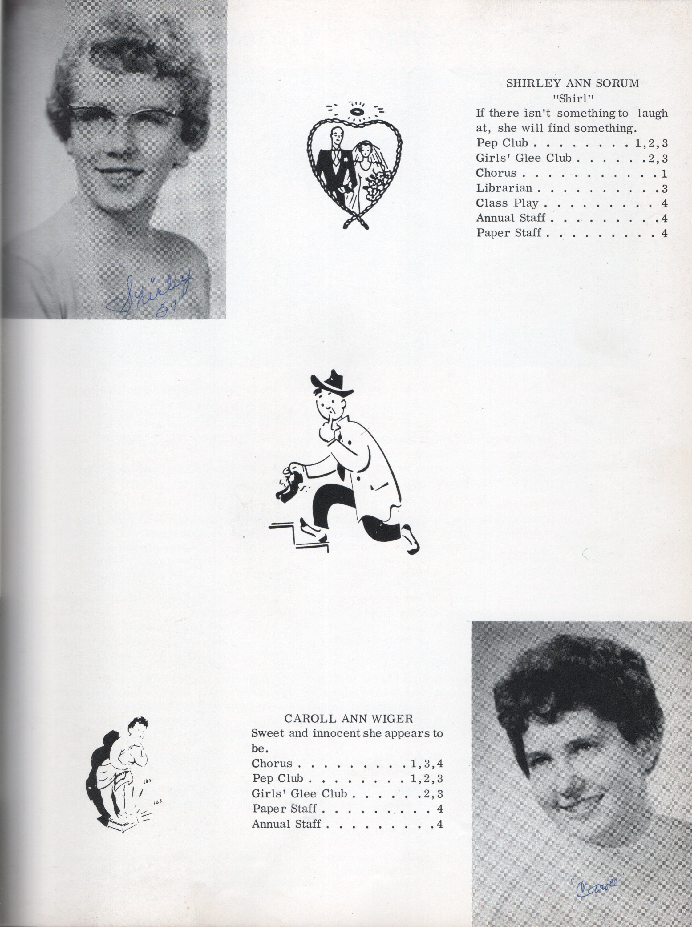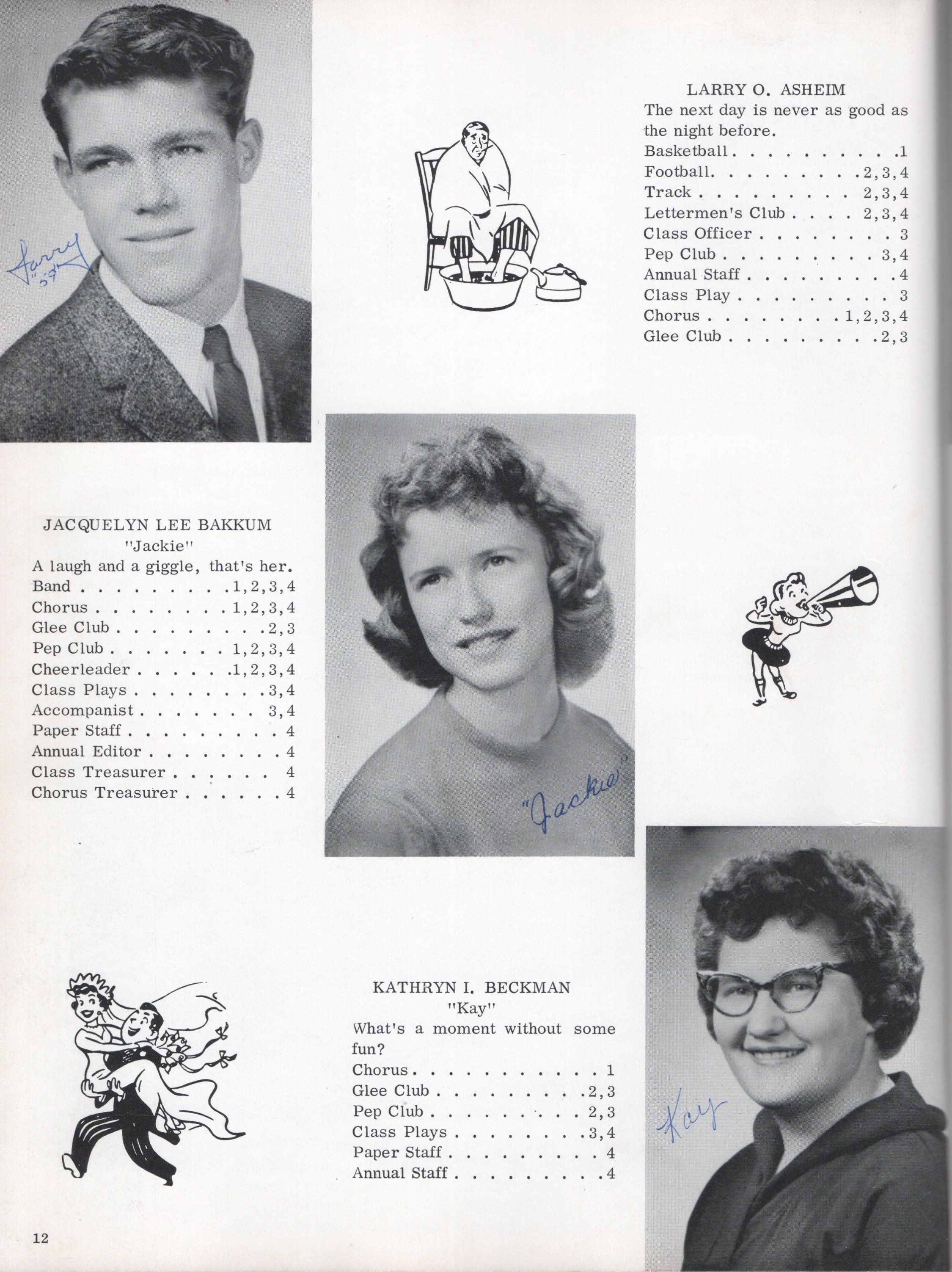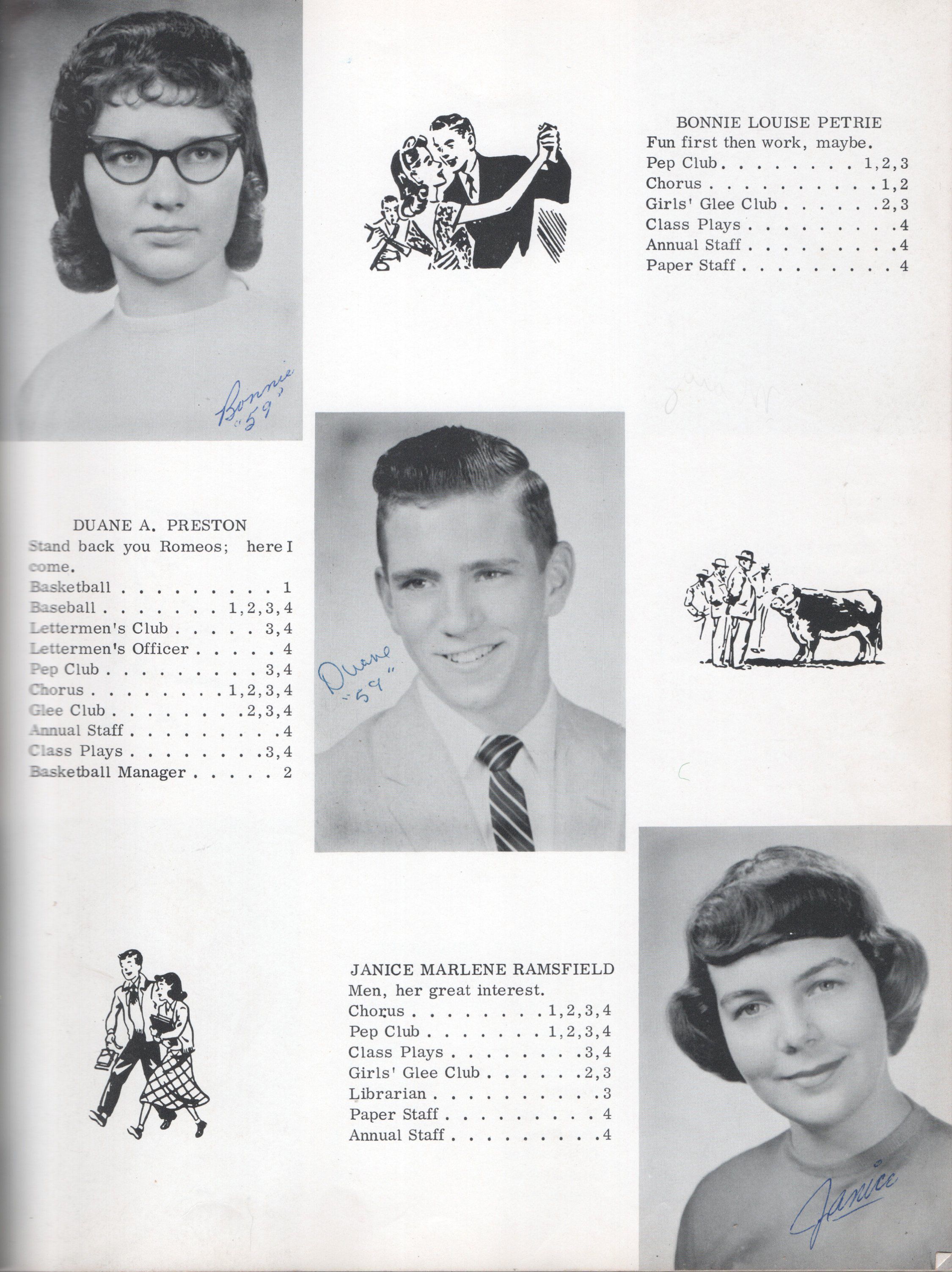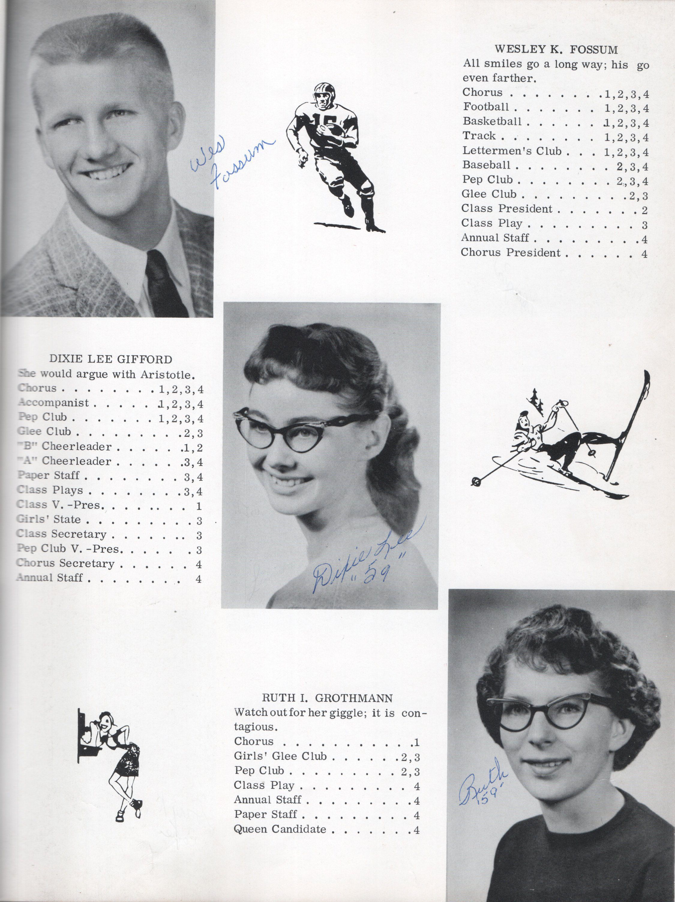 This 1959 yearbook includes ten pages of Class of 1959 Senior student photographs for: Larry Asheim, Jacquelyn Lee Bakkum, Kathryn L. Beckman, Wanda M. Biel, Linda M. Dahlstrom, Norma Louise Dahlstrom, Roger Dahlstrom, Kay Louise Ferguson, Lorraine S. Forster, Wesley Fossum, Dixie Lee Gifford, Ruth I. Grothmann, Georgia Ann Hendricks, Bruce Kaldor, Gary Koering, Jerry Lindgren, John Ludwig, Gary Marsden, Richard Moen, Charles Mueller, Amy Arlene Pederson, Bonnie Louise Petrie, Duane Preston, Janice Marlene Ramsfield, Mary E. Savereide, David Shafer, Gary Schornack, Shirley Ann Sorum, and Caroll Ann Wiger.