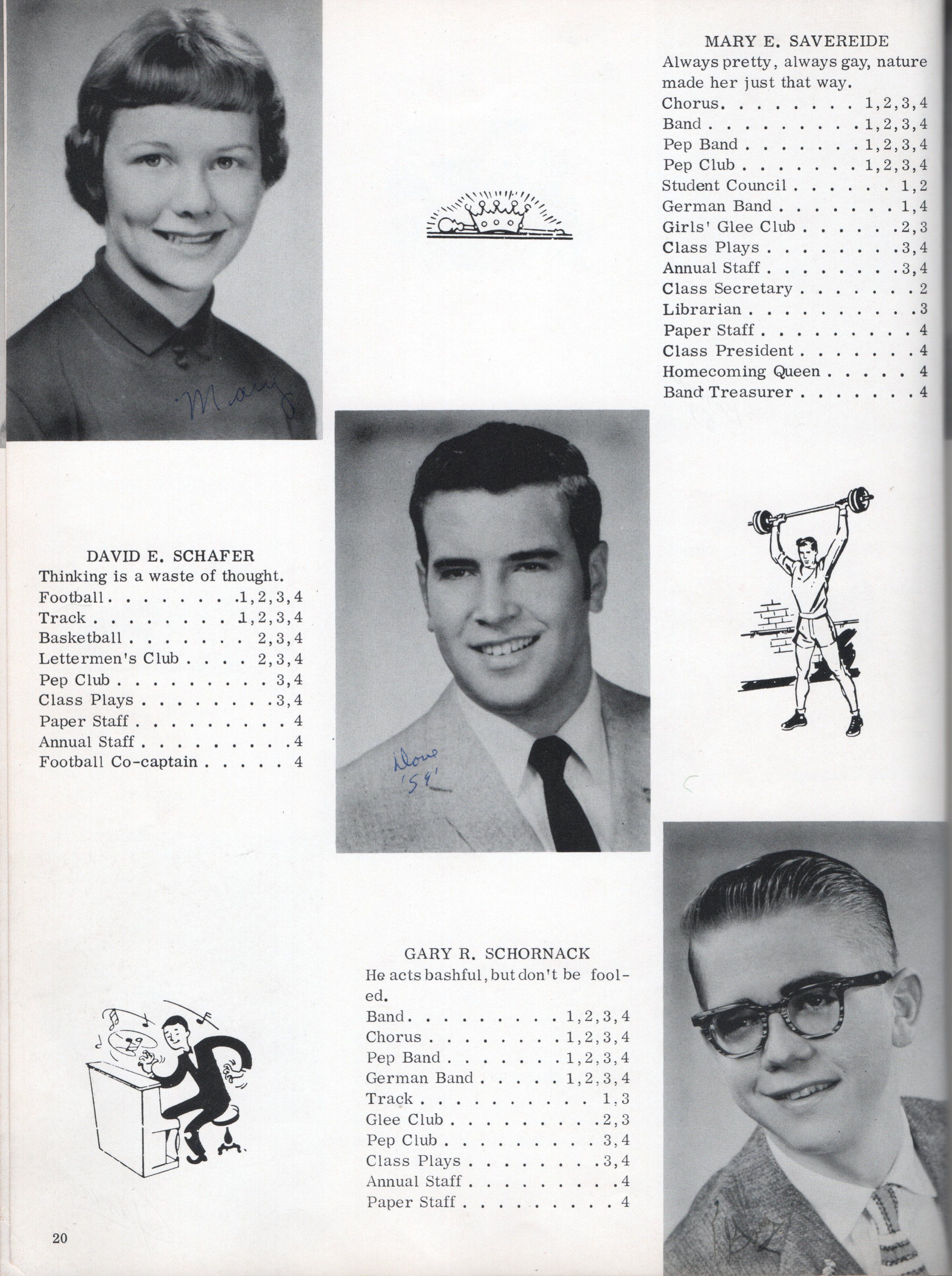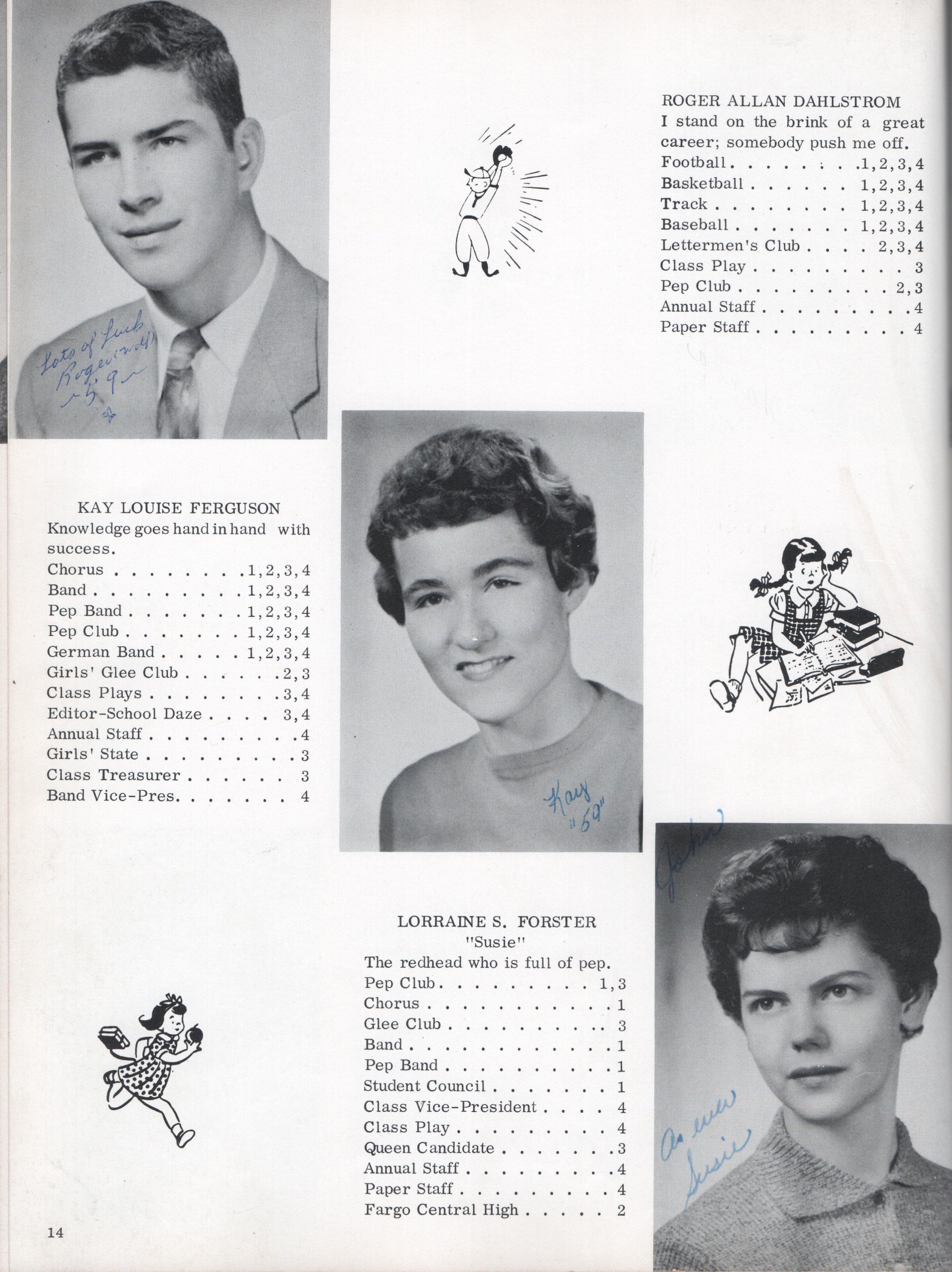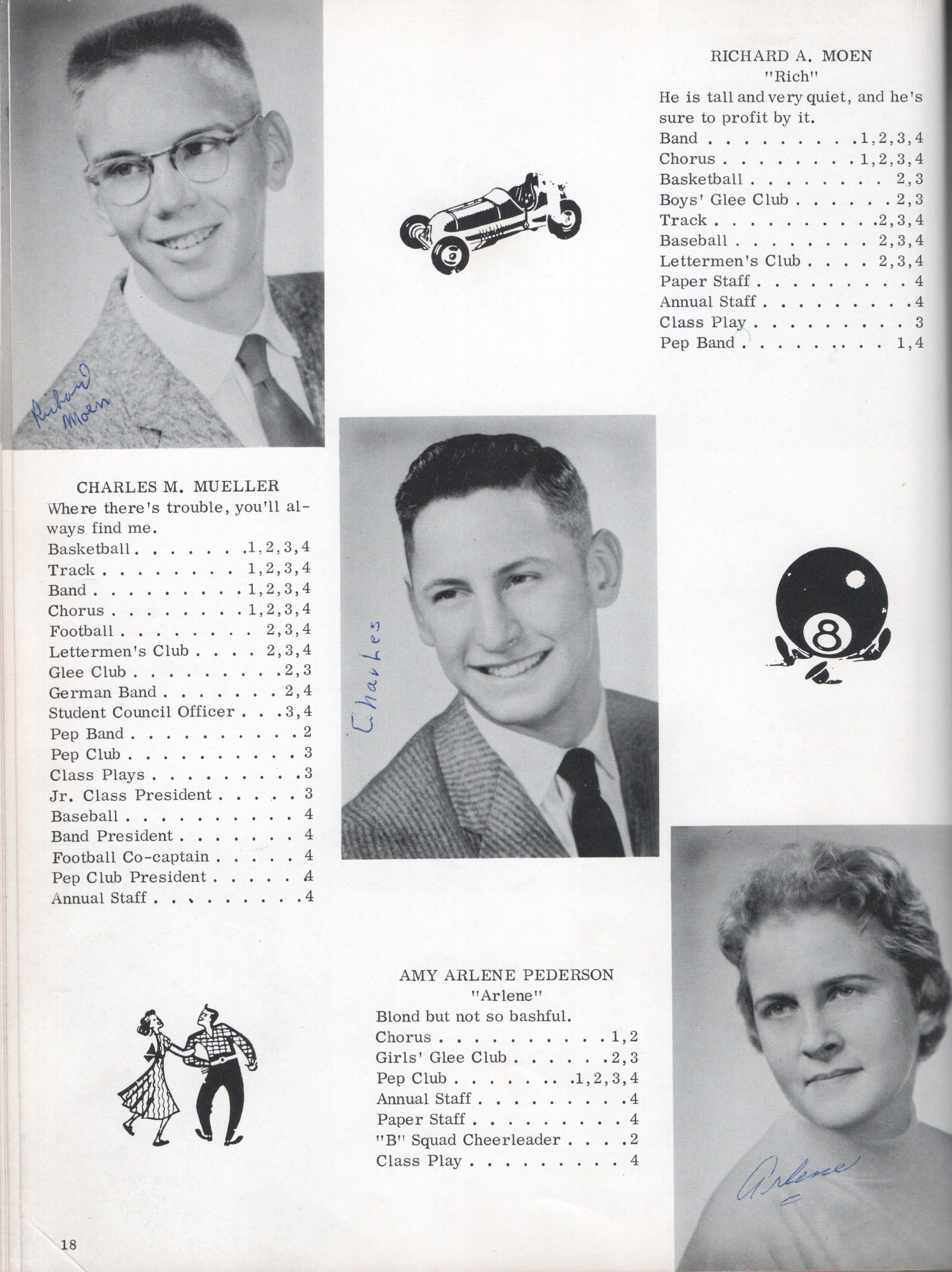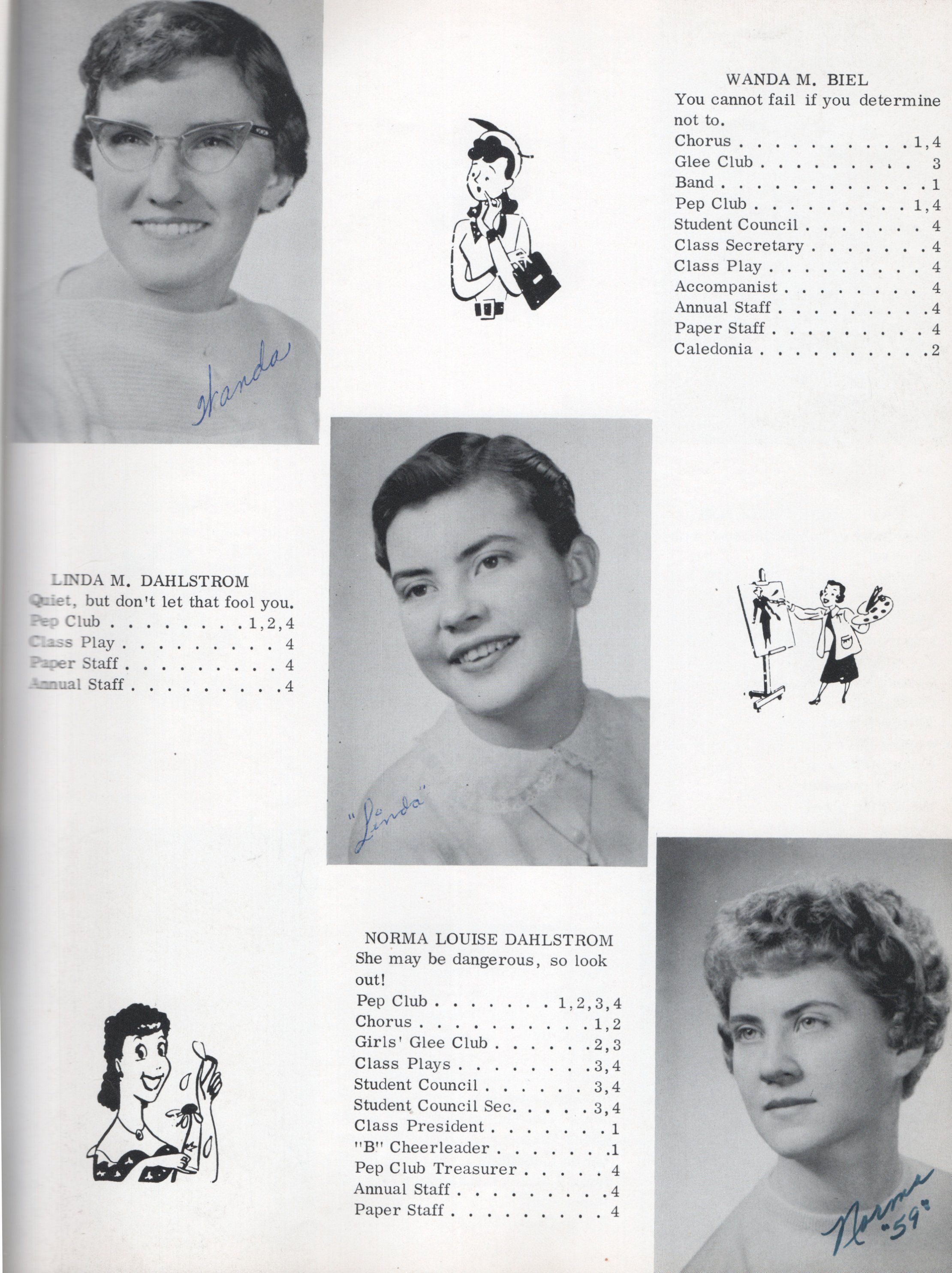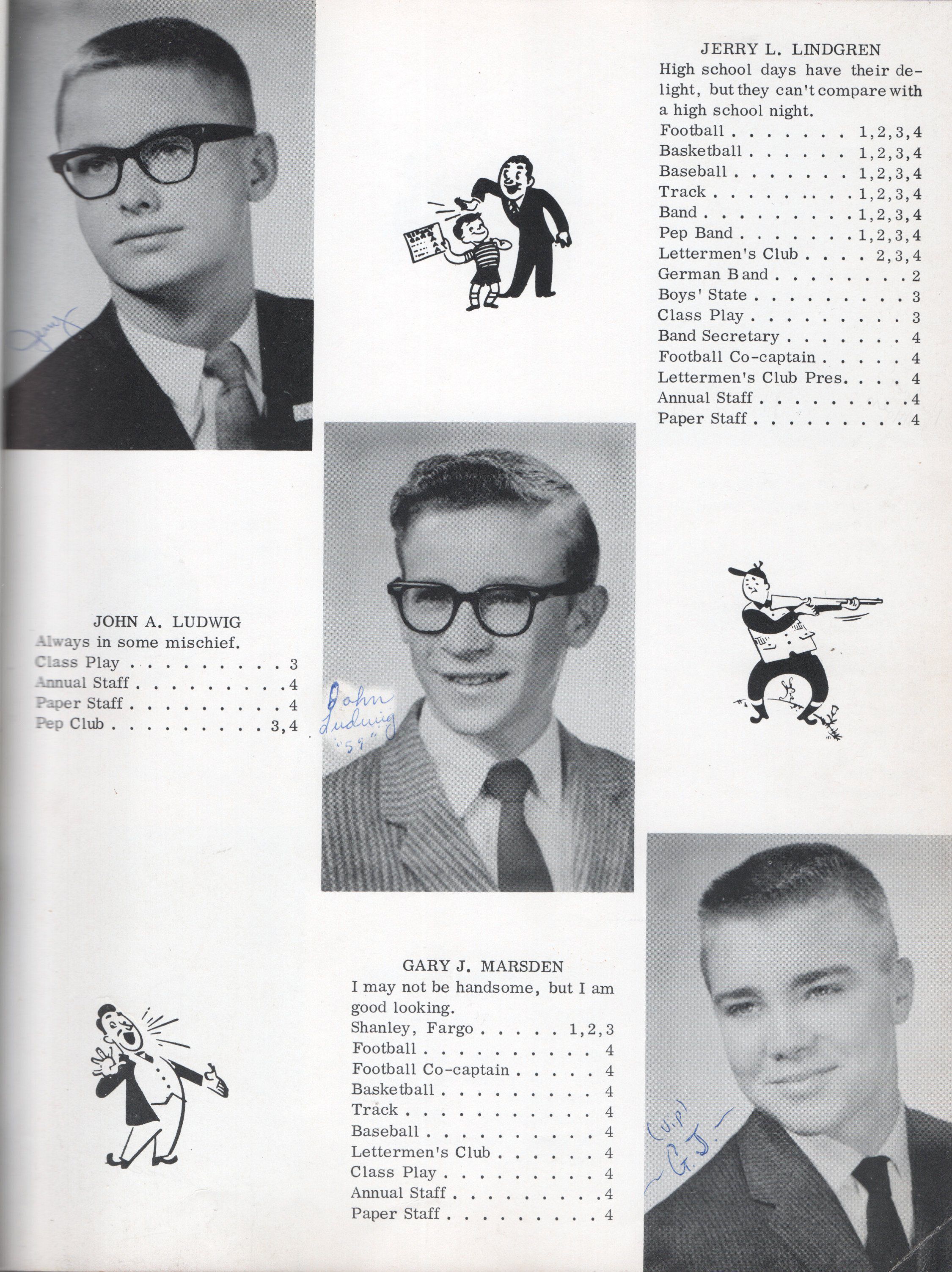 This 1959 yearbook includes ten pages of Class of 1959 Senior student photographs for: Larry Asheim, Jacquelyn Lee Bakkum, Kathryn L. Beckman, Wanda M. Biel, Linda M. Dahlstrom, Norma Louise Dahlstrom, Roger Dahlstrom, Kay Louise Ferguson, Lorraine S. Forster, Wesley Fossum, Dixie Lee Gifford, Ruth I. Grothmann, Georgia Ann Hendricks, Bruce Kaldor, Gary Koering, Jerry Lindgren, John Ludwig, Gary Marsden, Richard Moen, Charles Mueller, Amy Arlene Pederson, Bonnie Louise Petrie, Duane Preston, Janice Marlene Ramsfield, Mary E. Savereide, David Shafer, Gary Schornack, Shirley Ann Sorum, and Caroll Ann Wiger.