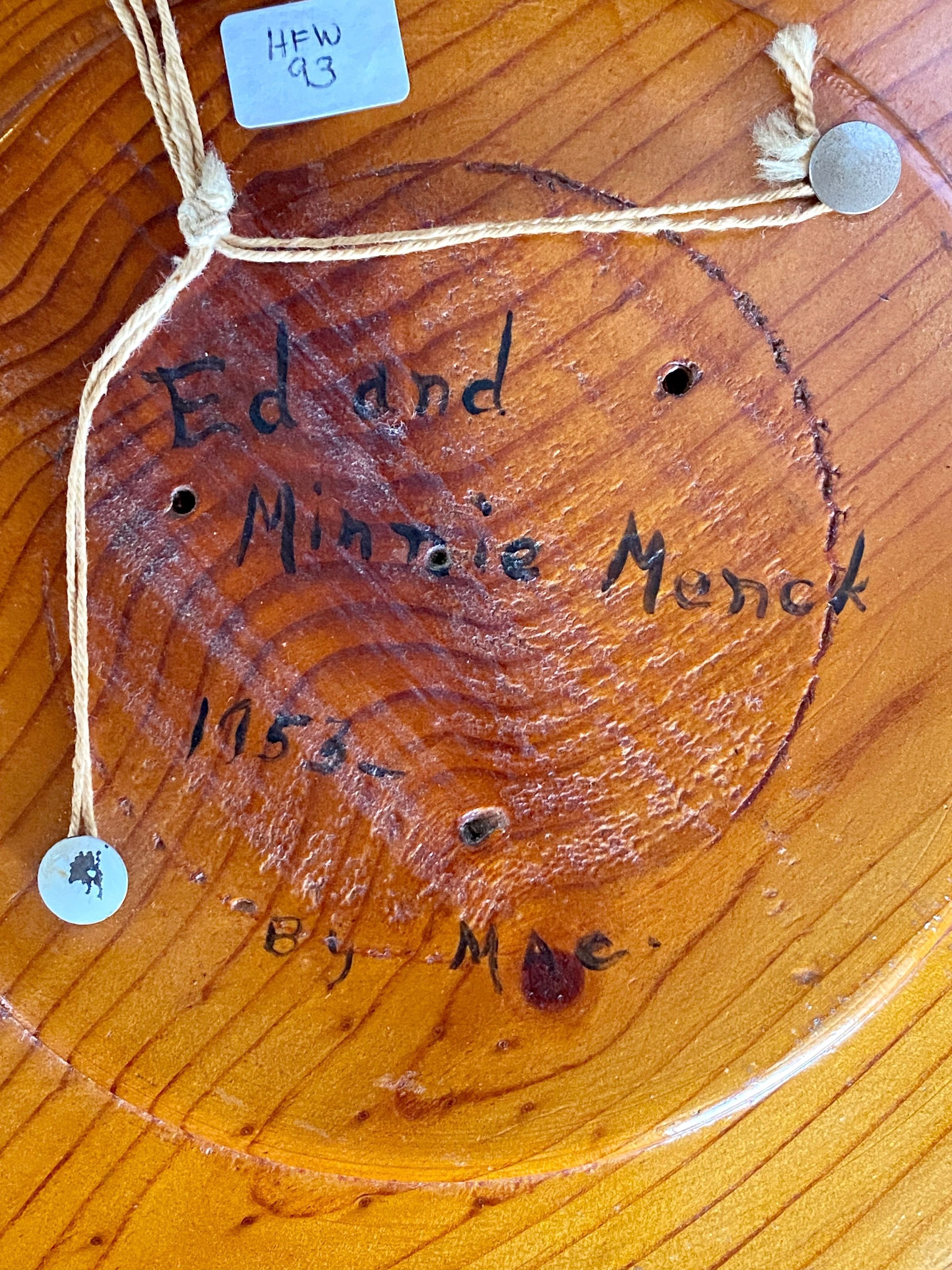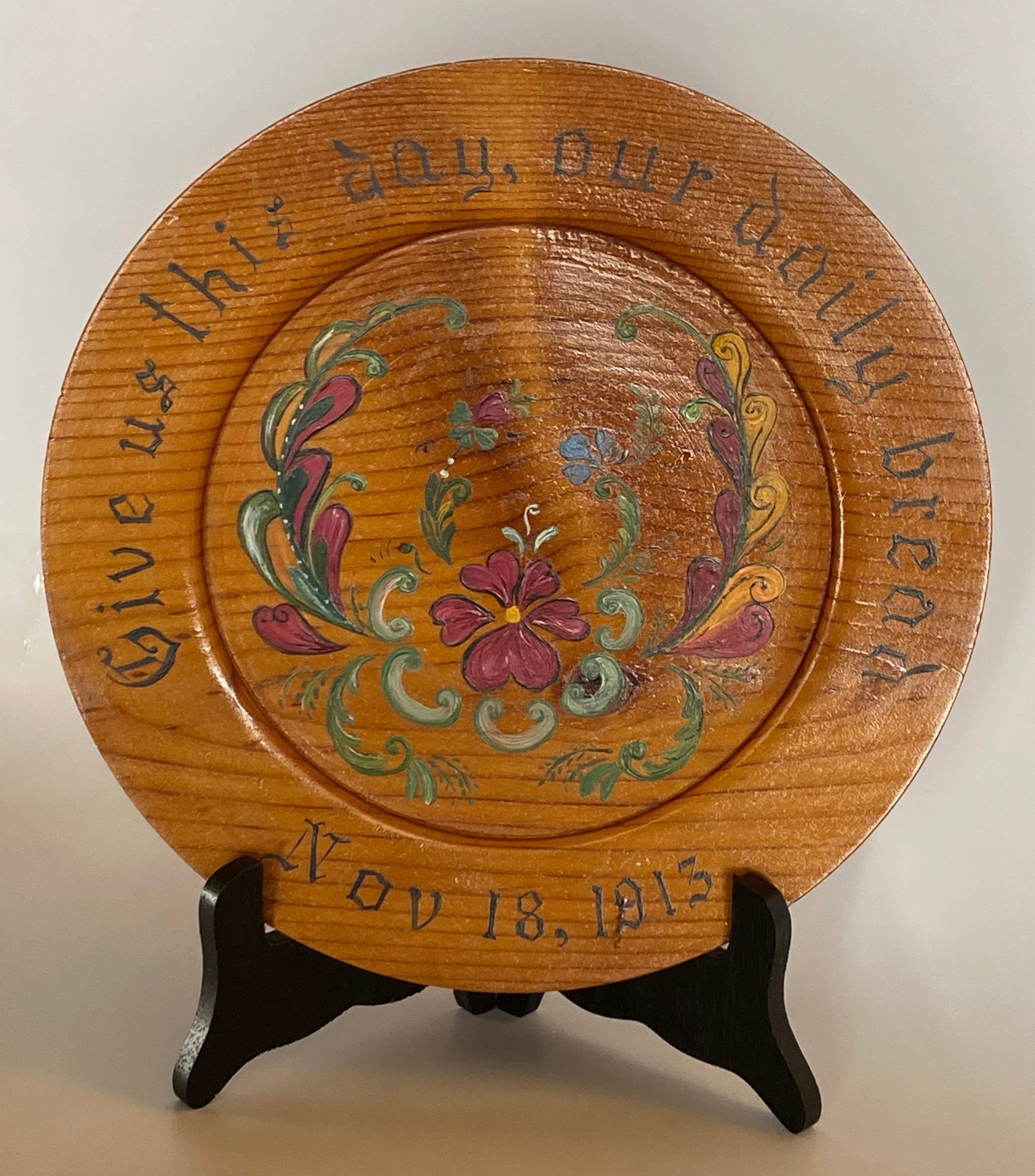 A decorative Wooden Plate with the saying "give us this day , our daily bread" and the date of Nov. 18, 1915. This painted and inscribed wooden plate was given to Ed & Minie Mench. On the back of the plate is written "by Mae".Cataloged By