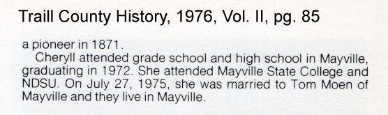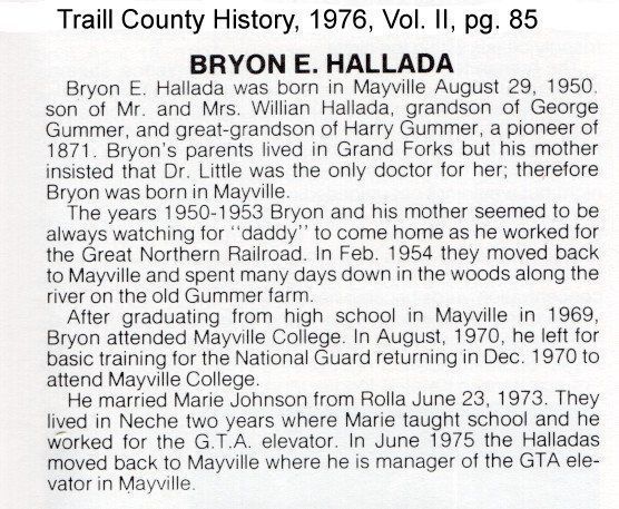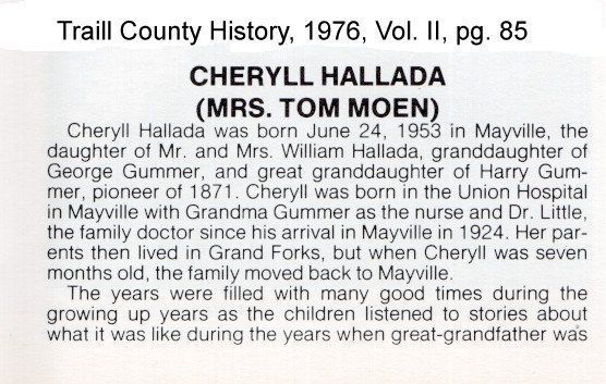 We know from page 85 of Vol. II of the Traill County History books (below) that Bryon Hallada was born on 29 August 1950 in Mayville. On 23 June 1973 Bryon Hallada married Marie Johnson of Rolla, ND. They lived in Neche, ND, and then moved to Mayville. Also from page 85, we know that Cheryll Hallada was born on 24 June 1953 in Mayville. On 27 July 1975, Cheryll Hallada married Tom Moen and they reside in Mayville.