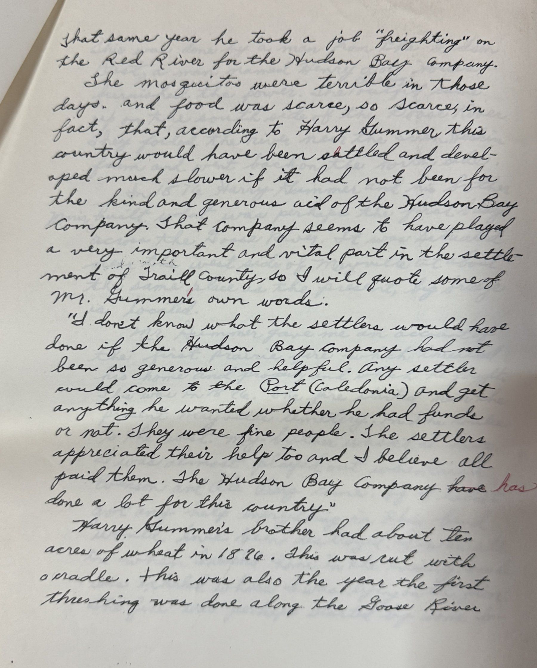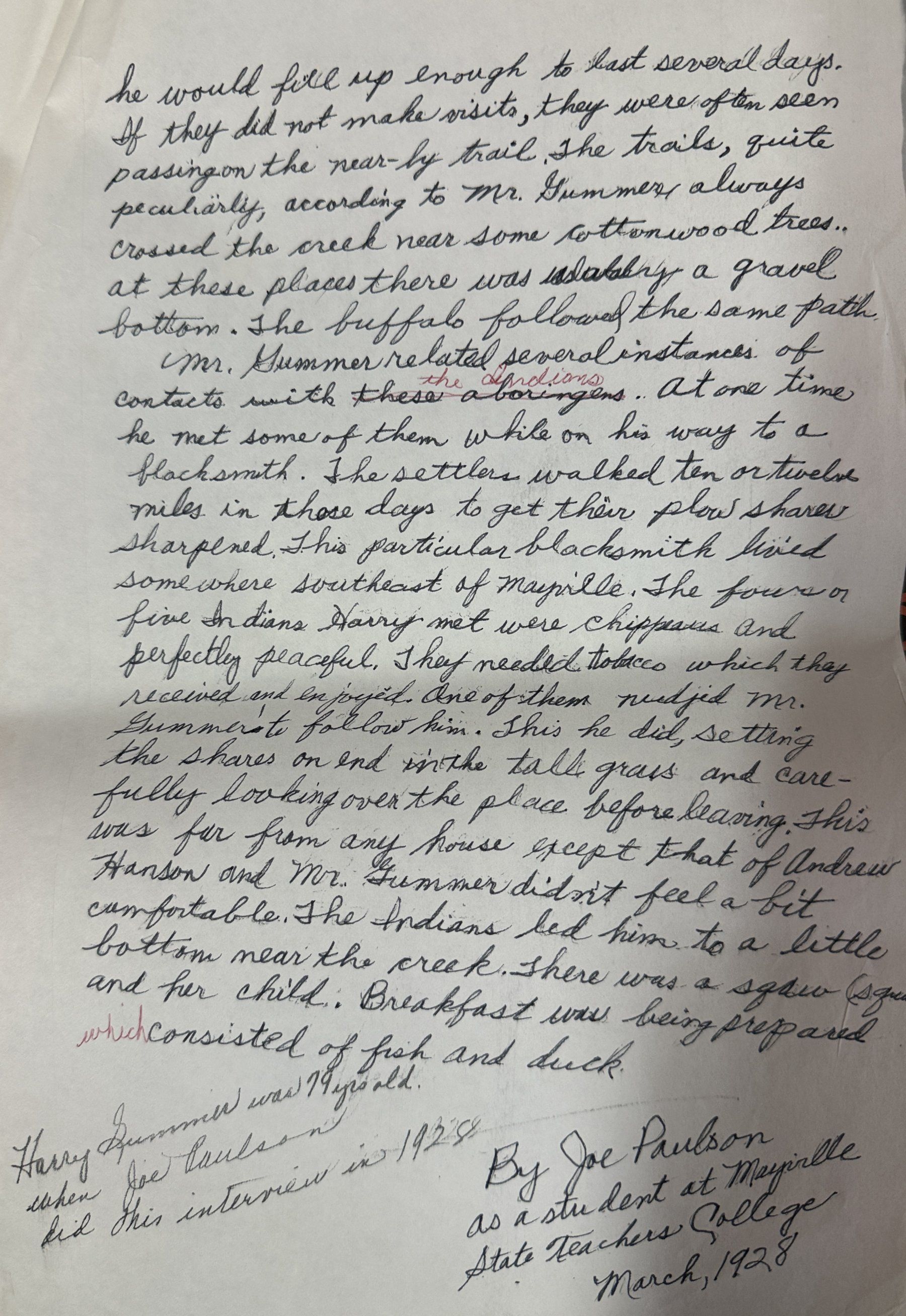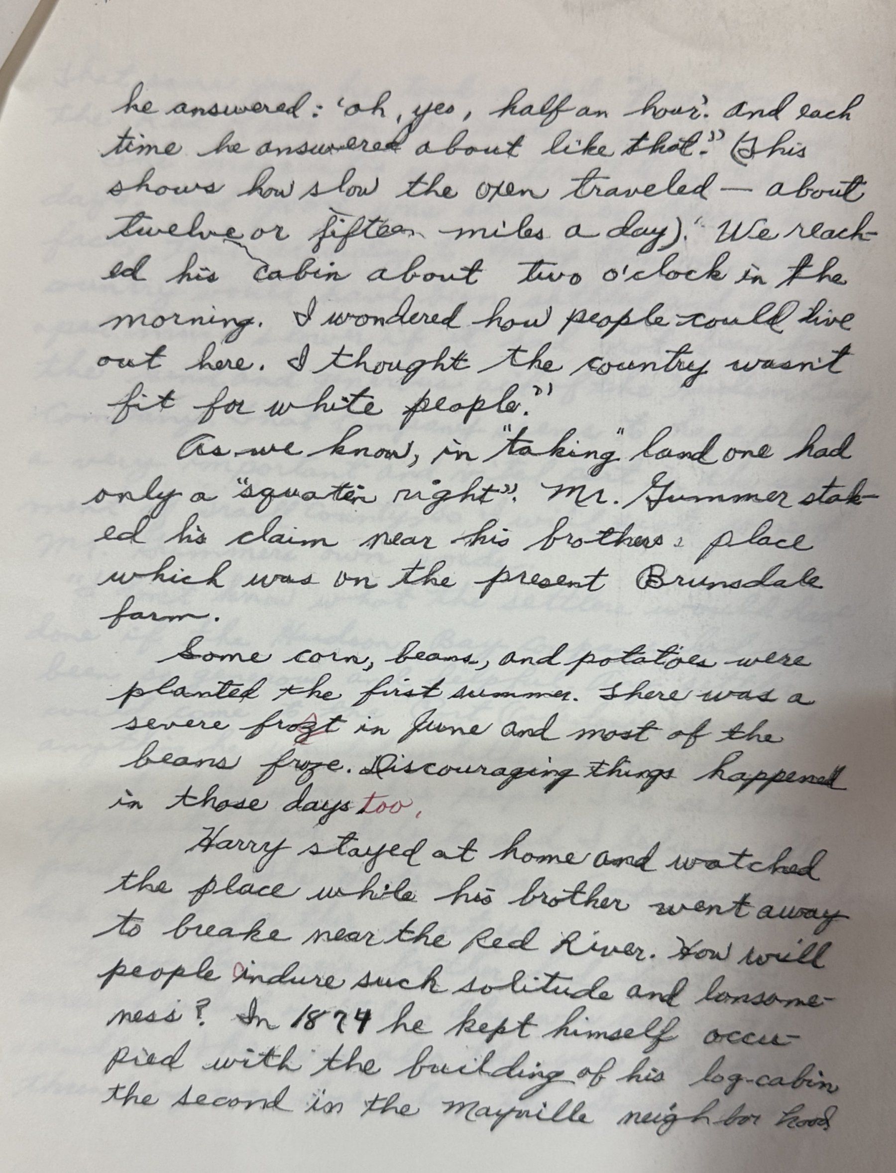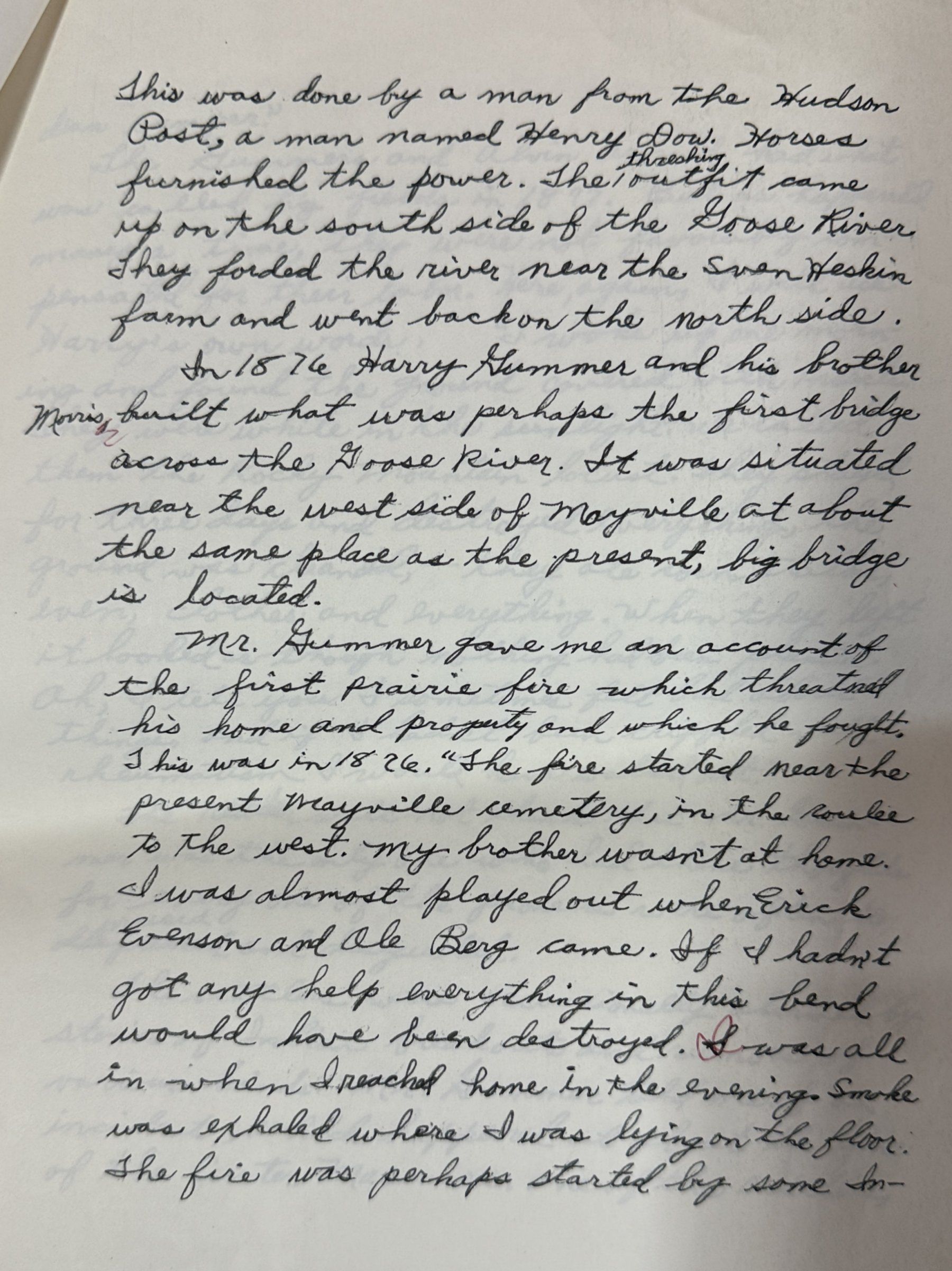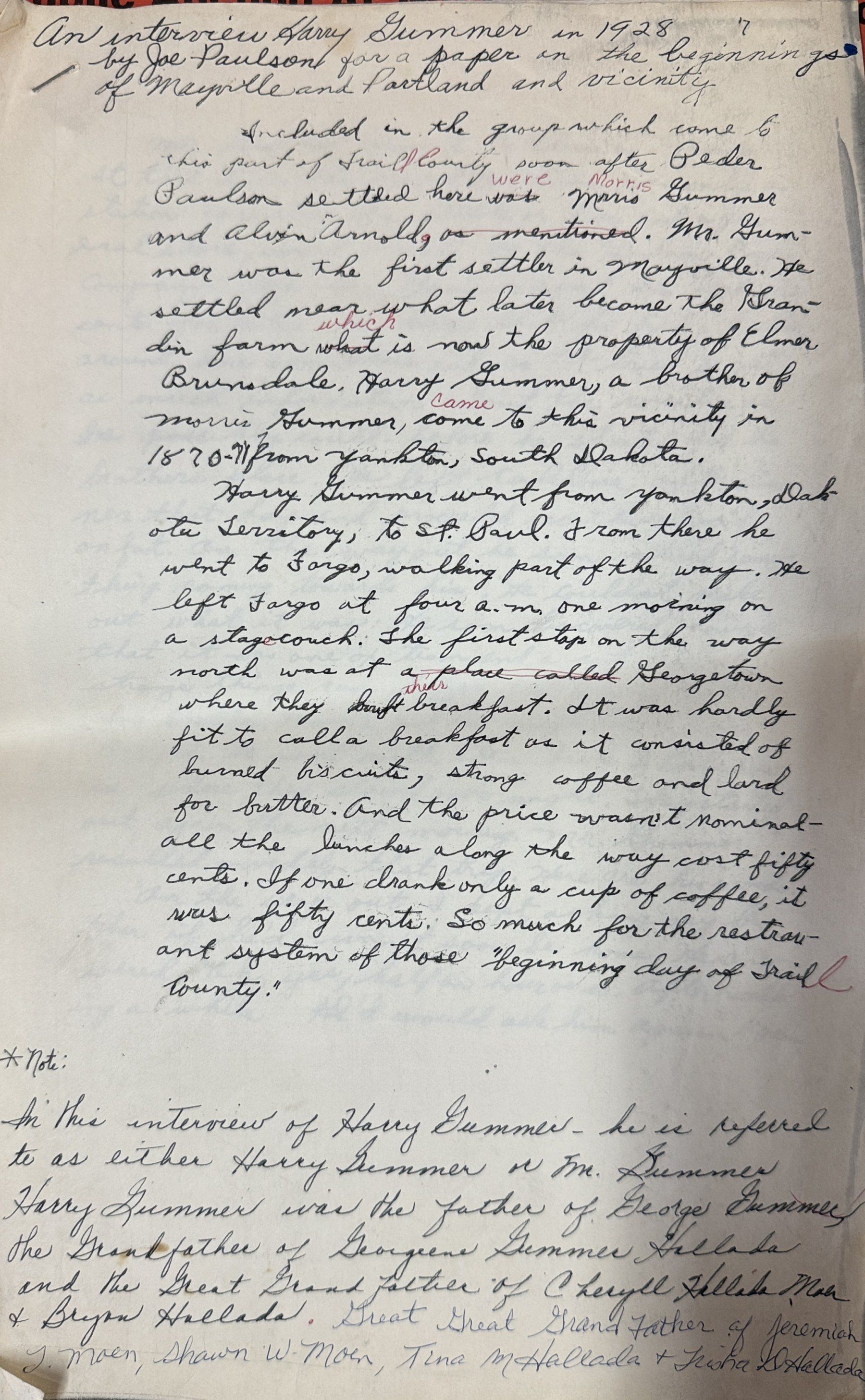 Cheryll (Hallada) Moen has kindly provided a 10-page handwritten document (below) of an interview of her great grandfather, Harry A. Gummer, that was conducted in March 1928 by Joe Paulson, a student at Mayville State Teachers College. Harry tells Joe about some of his experiences during the early days of settlement in Traill County. Harry was 79 years old at the time of the interview in 1928. Harry passed away four years later in 1932.Acquisition