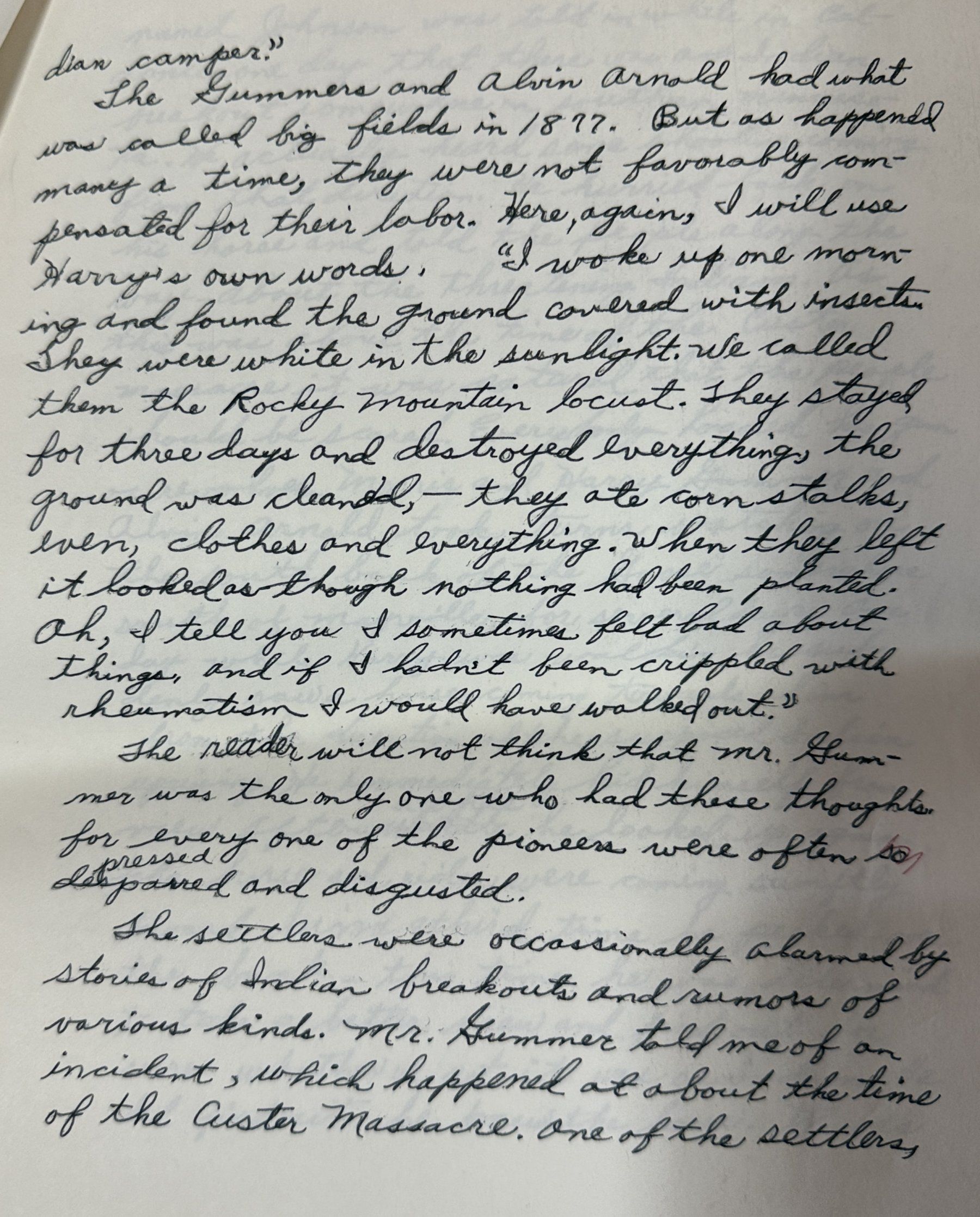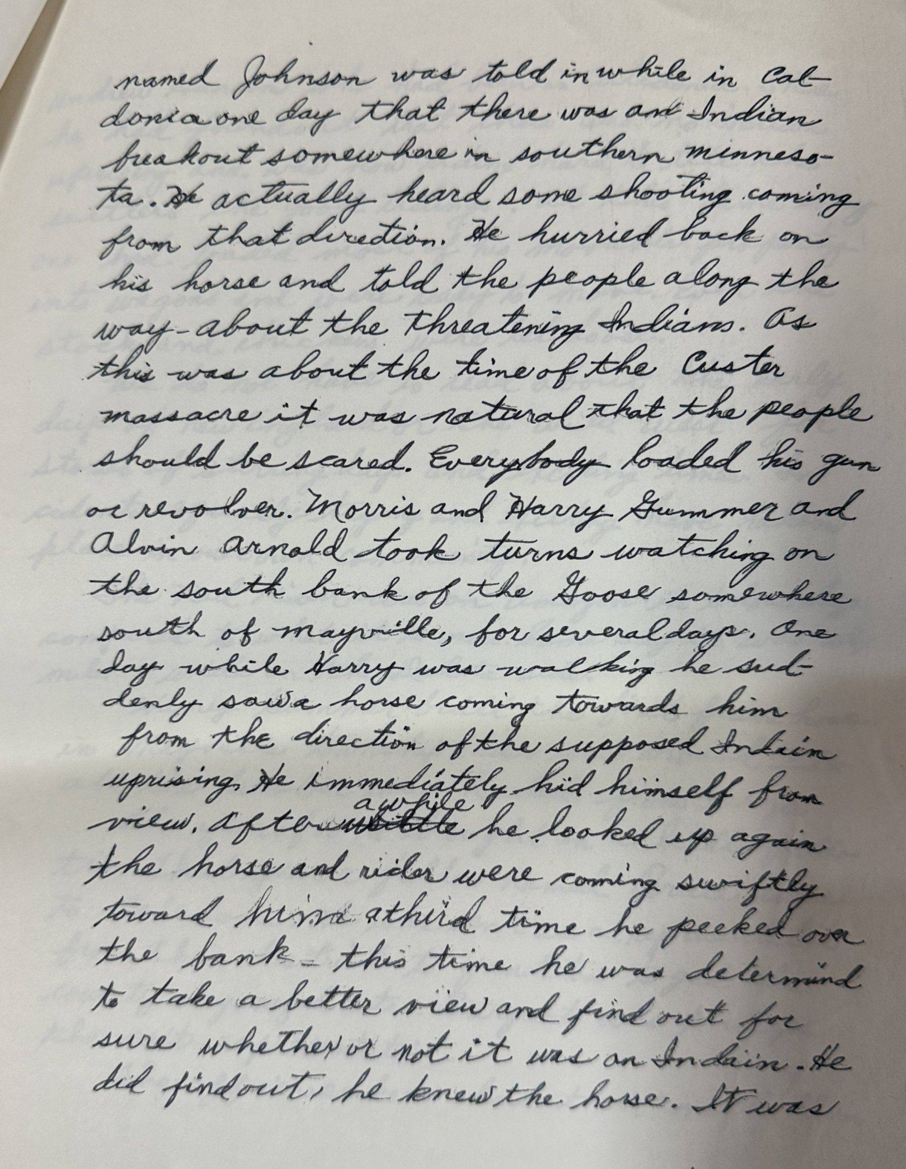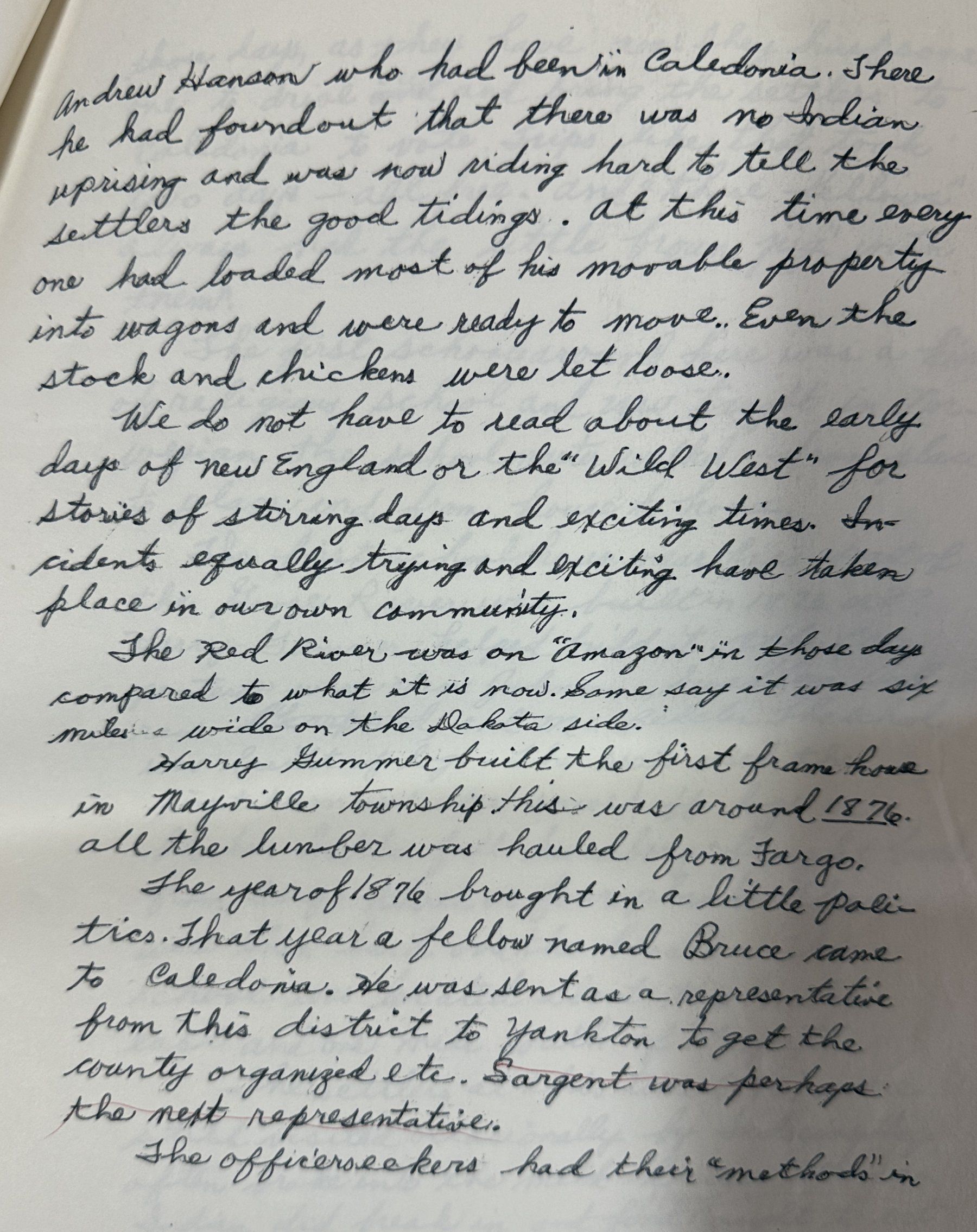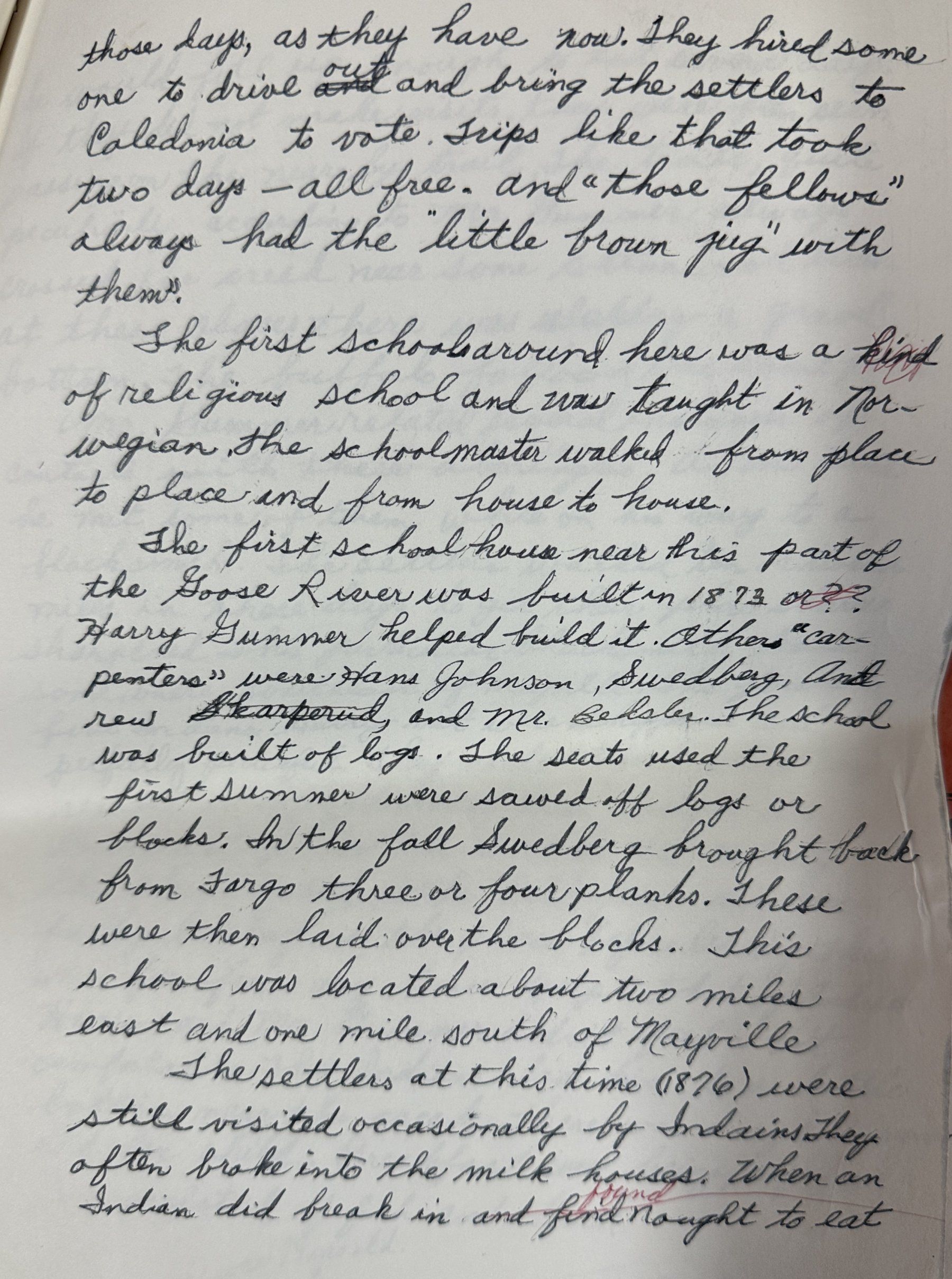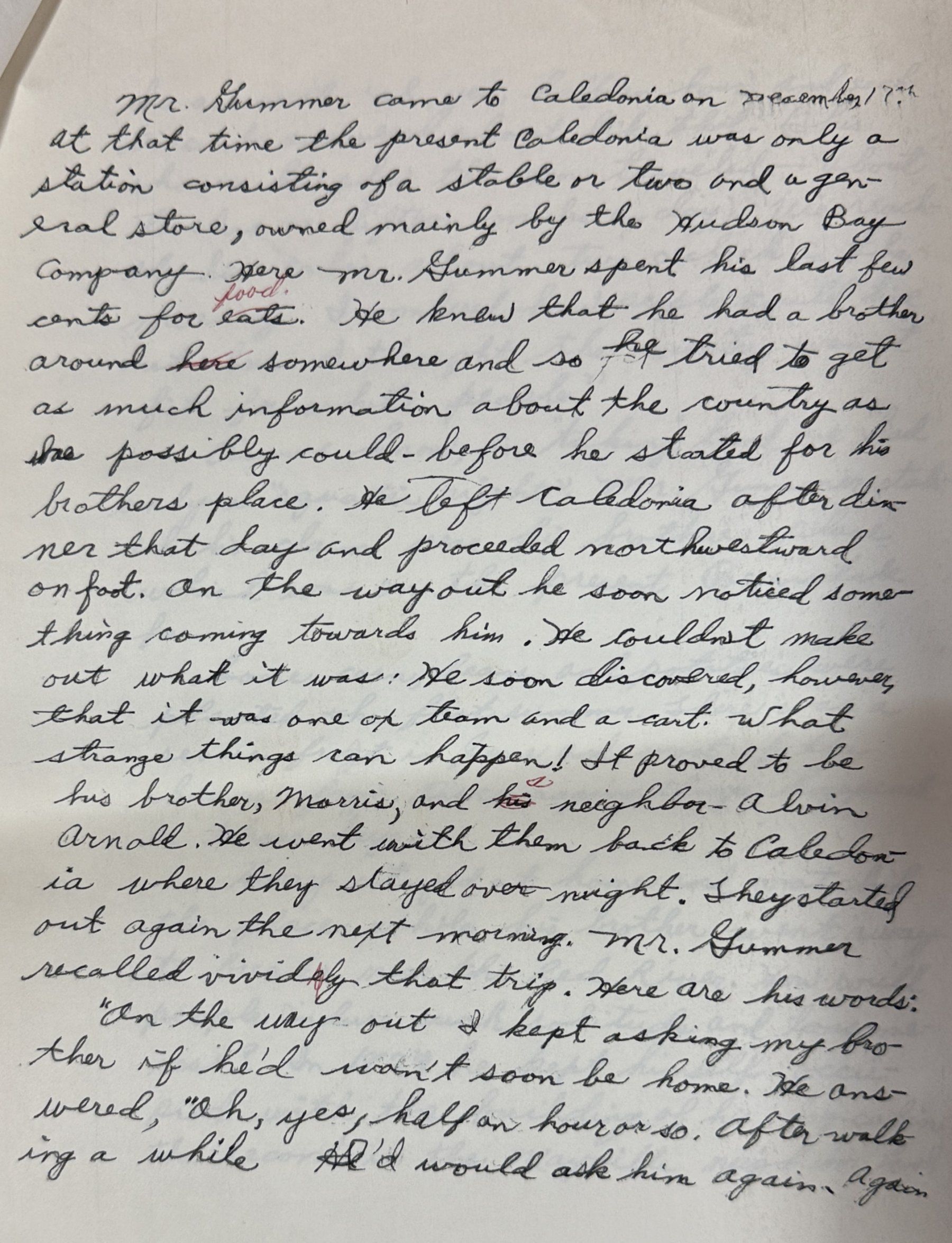 Cheryll (Hallada) Moen has kindly provided a 10-page handwritten document (below) of an interview of her great grandfather, Harry A. Gummer, that was conducted in March 1928 by Joe Paulson, a student at Mayville State Teachers College. Harry tells Joe about some of his experiences during the early days of settlement in Traill County. Harry was 79 years old at the time of the interview in 1928. Harry passed away four years later in 1932.Acquisition