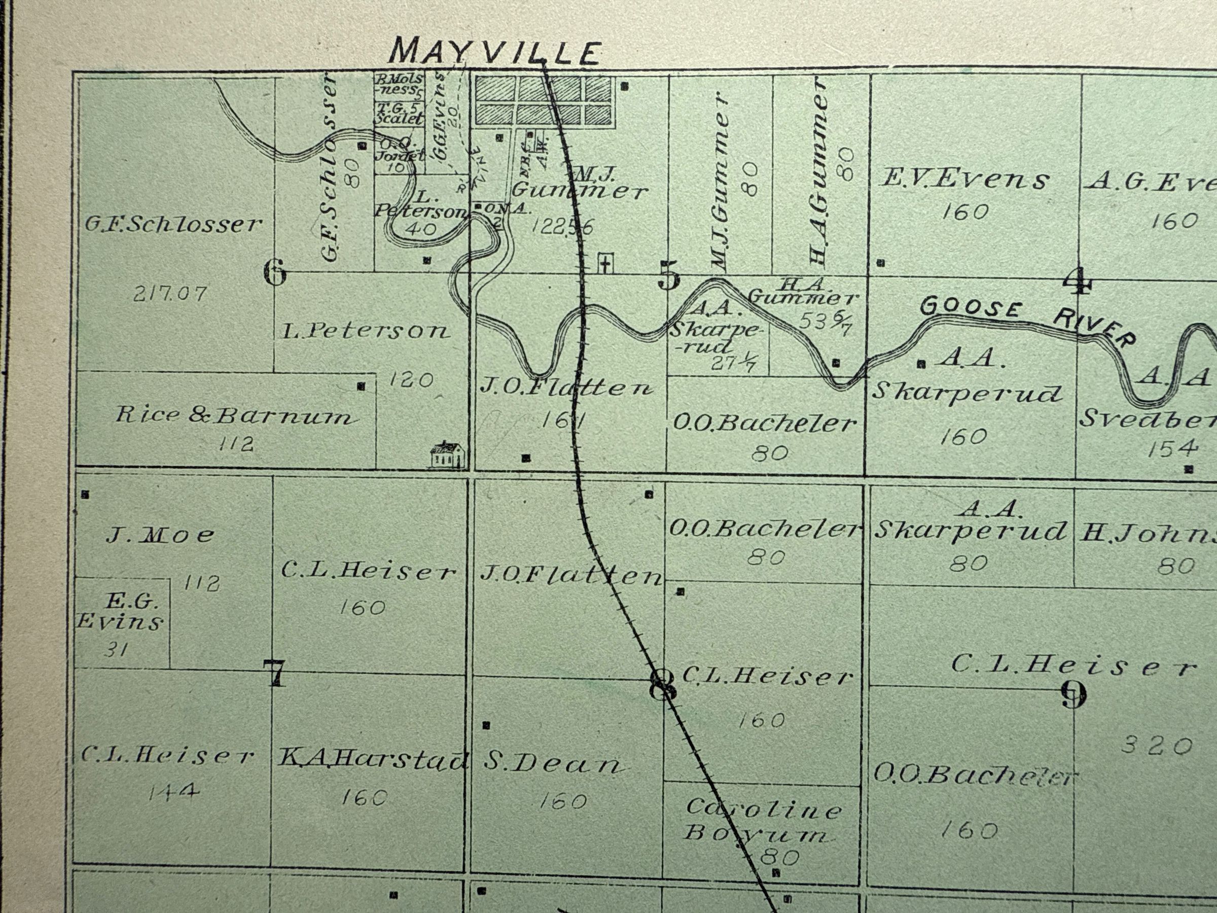 From page 70 of Vol. I of the Traill County History book, we know that Harry Gummer was born in 1849 in England and came to America in 1871. In 1872, Harry staked a land claim along the Goose River in section 5 in what became Mayville Township (see 1892 map; location of residence noted as a black square). On 17 November 1881, Harry Gummer married Mathilda Aslakson, who came with her family from Wisconsin in 1879. Harry and Mathilda had five children, Alfred, George, Lura, Mildred and Ella.