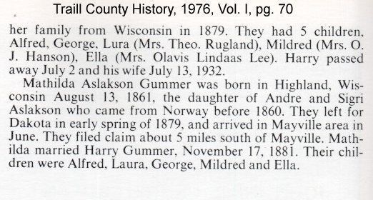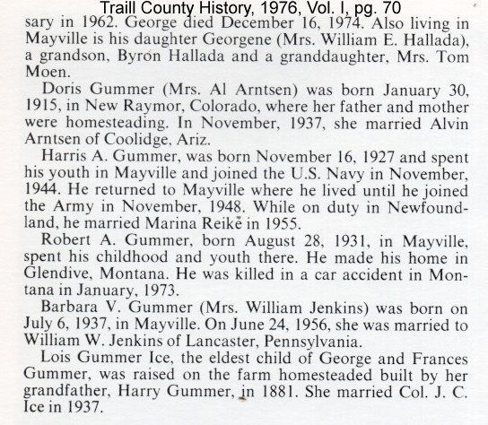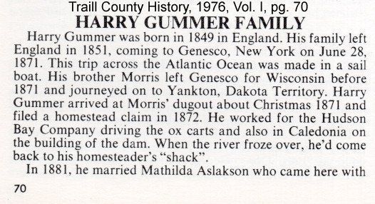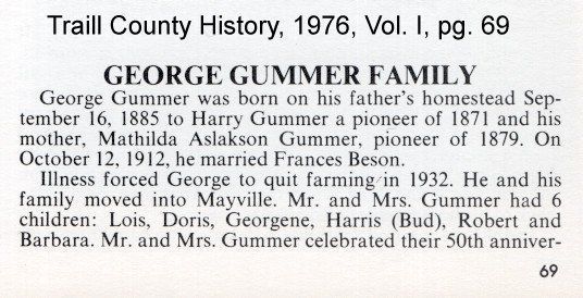 We know from page 69 of Vol. I of the Traill County History book (below), that their son George was born on 16 September 1885. On 12 October 1912, George Gummer married Frances Beson. From page 79, we know they had six children, Doris, Georgene, Harris, Robert and Barbara. Of these six children, only Georgene remained in Mayville.