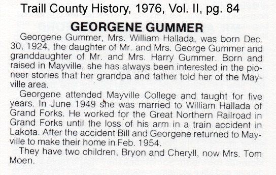 From page 84 in Vol. II of the Traill County History books (below), we know that their daughter Georgene married William E. Hallada of Grand Forks in June 1949. William was employed by the Great Northern Railway in Grand Forks, and after an accident, they made their home in Mayville. William and Georgene had two childre, son Bryon and daughter Cheryll Hallada.