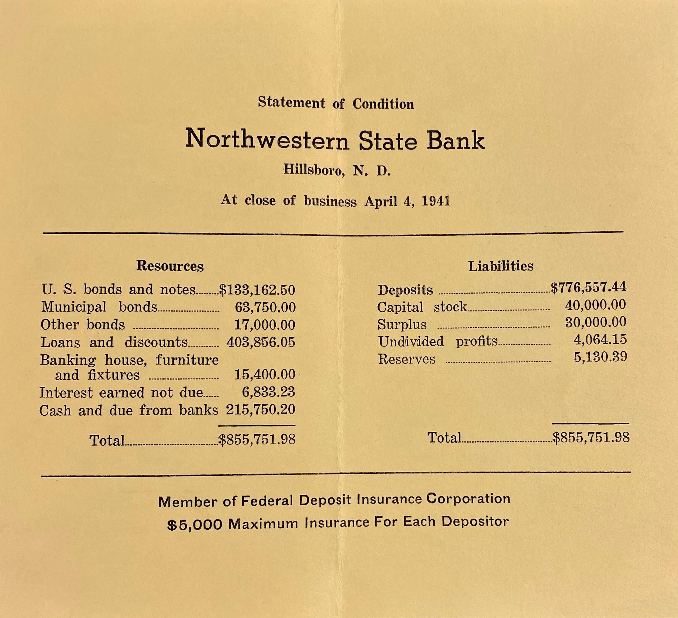 1941 Northwestern State Bank Statement of ConditionCataloged By