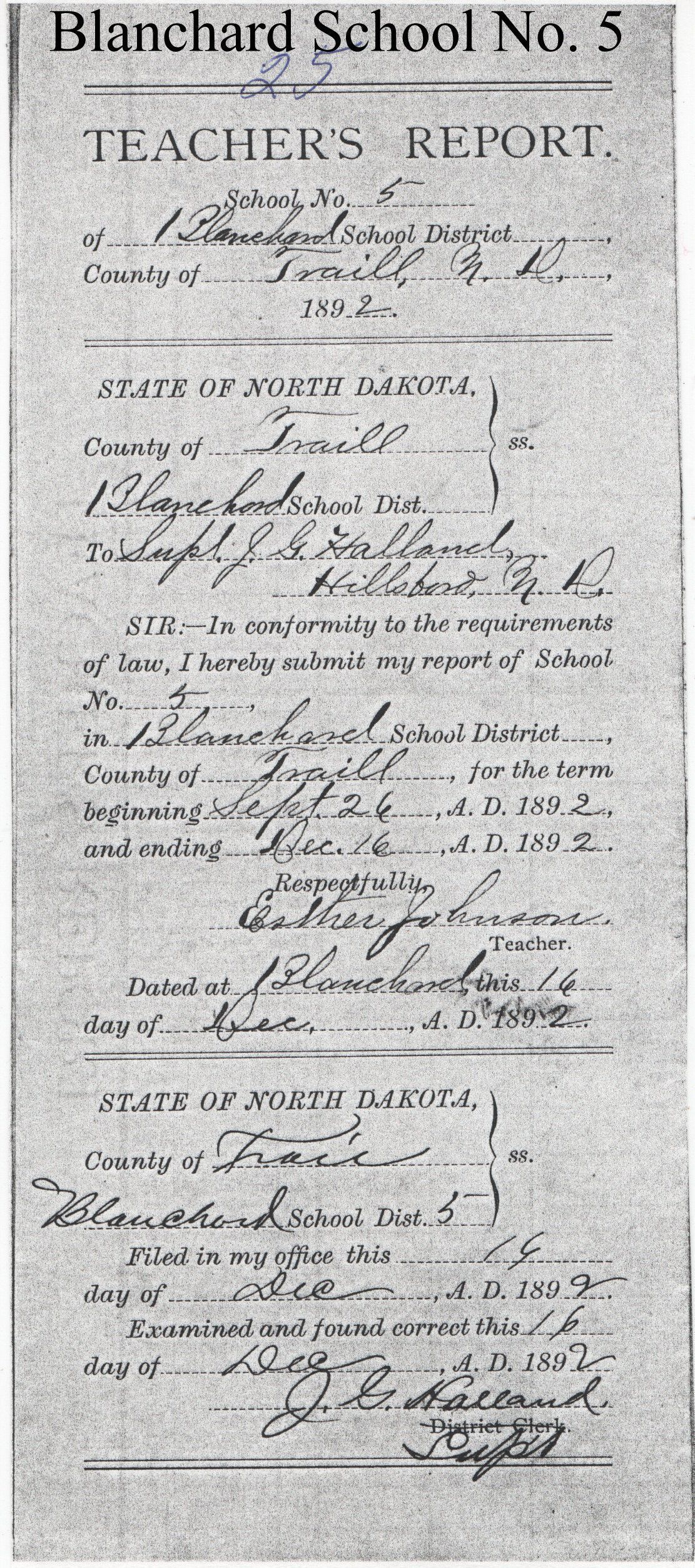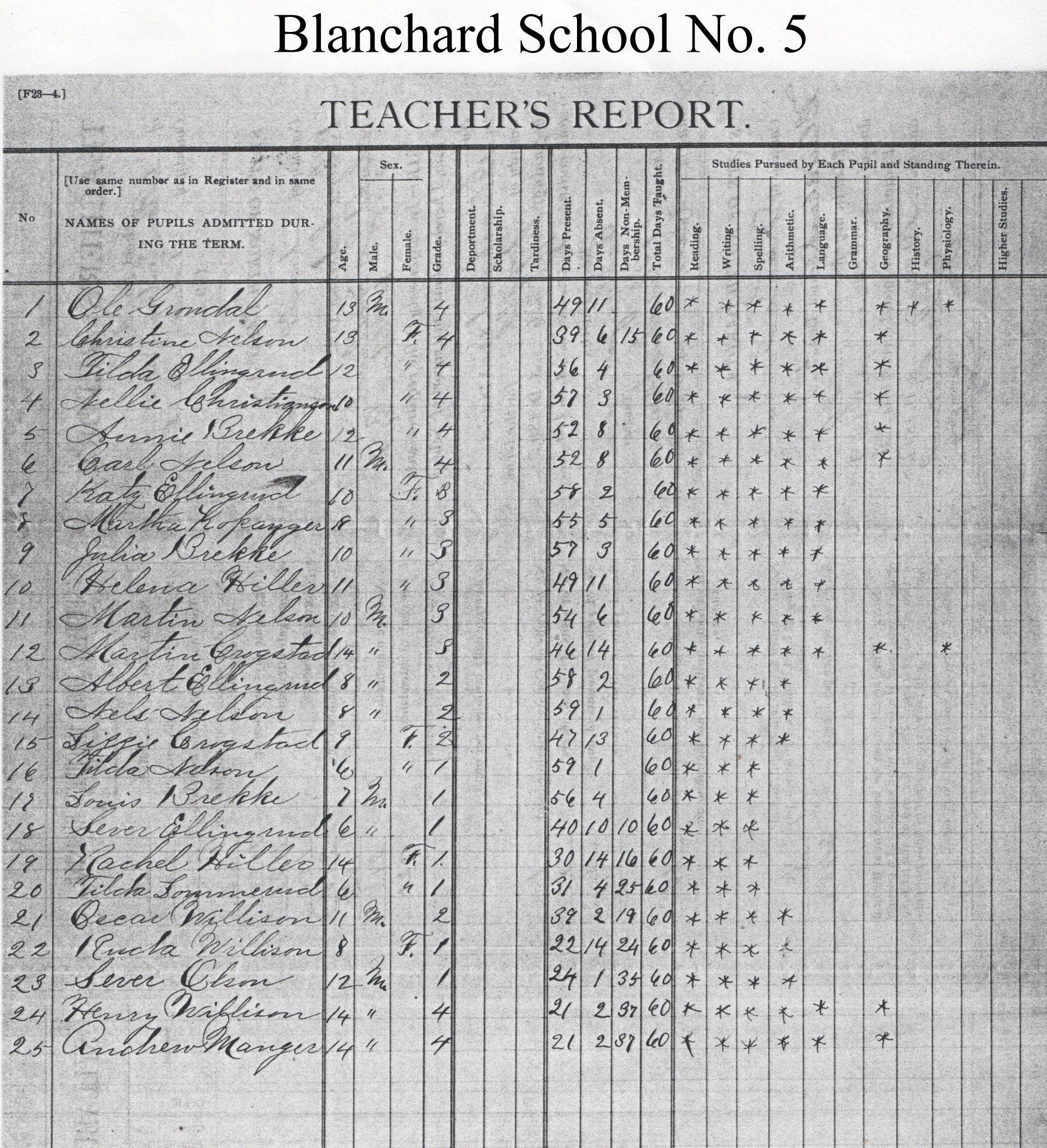 In the Fall Term of 1892 (26 Sep-16 Dec), Blanchard School No. 5 teacher Esther Johnson reported attendances and studies pursued for 25 students, including Annie Brekke, Julia Brekke, Louis Brekke, Nellie Christianson, Albert Ellingrud, Hilda Ellingrud, Katy Ellingrud, Sever Ellingrud, Ole Grondal, Helena Hiller, Rachel Hiller, Lizzie Krogstad, Martin Krogstad, Hilda Lommerud, Andrew Manger, Carl Nelson, Christine Nelson, Hilda Nelson, Martin Nelson, Nels Nelson, Sver Olson, Henry Willison, and Oscar Willison.