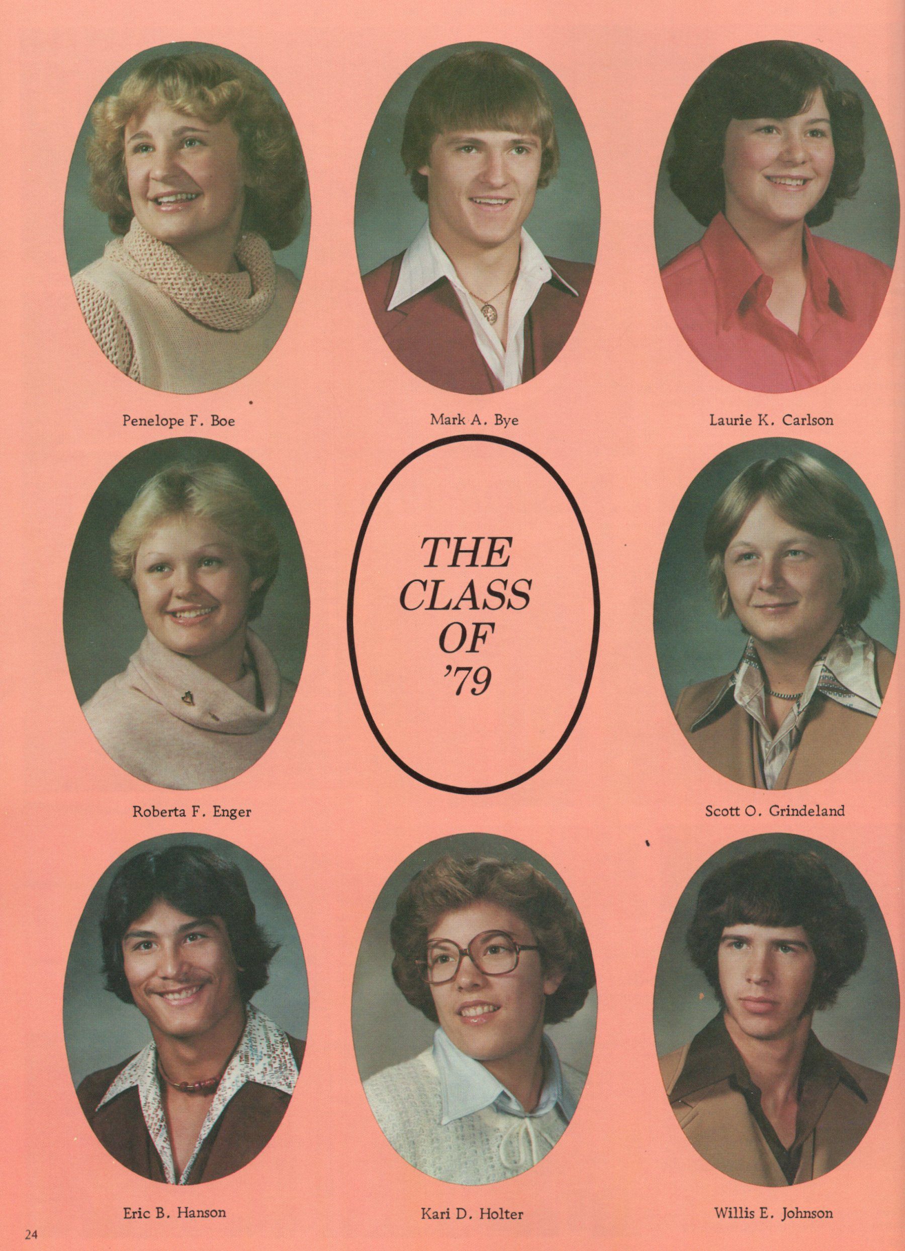 The 1979 yearbook includes two pages of Senior student photographs for: Penelope Boe, Mark Bye, Laurie Carlson, Roberta Enger, Scott Grindeland, Eric Hanson, Kari Holter, Willis Johnson, Jerry McLain, Paul Midtbo, Robin Miller, Debra Ness, Gary Ness, Anthony Smestad, and Clay Whitmore.