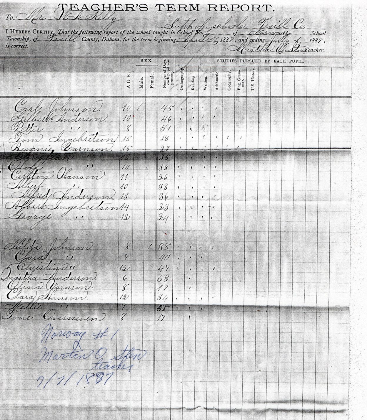 On 7 July 1887, Norway School No. 1 teacher, Martin O. Sten, reported the attendance of 20 students: Alfred Anderson, Gilbert Anderson, Martha Anderson, Petter Anderson, Albert Hanson, Carlton Hanson, Clara Hanson, Nellie Hanson, Albert Ingebretson, George Ingebretson, Tom Ingebretson, Carl Johnson, Clara Johnson, Christina Johnson, Hilda Johnson, Tone Overmoen, Bennie Varnson, Christian Varnson, Olina Varnson, and Oluff Varnson.