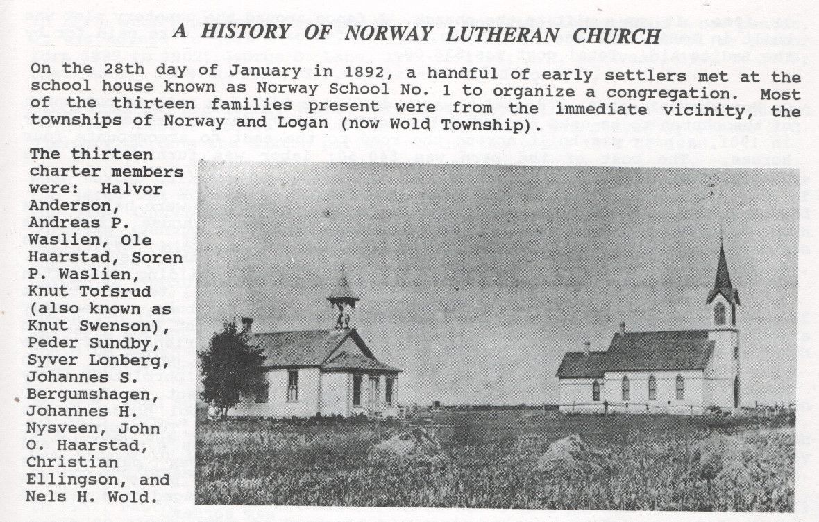 A 44-page book was published to celebrate the centennial of Norway Lutheran Church located in Norway Township in Traill County, North Dakota. This book includes a dedication page, lists and photos of pastors, a history of church buildings, and descriptions and photographs of church organizations and members.Acquisition