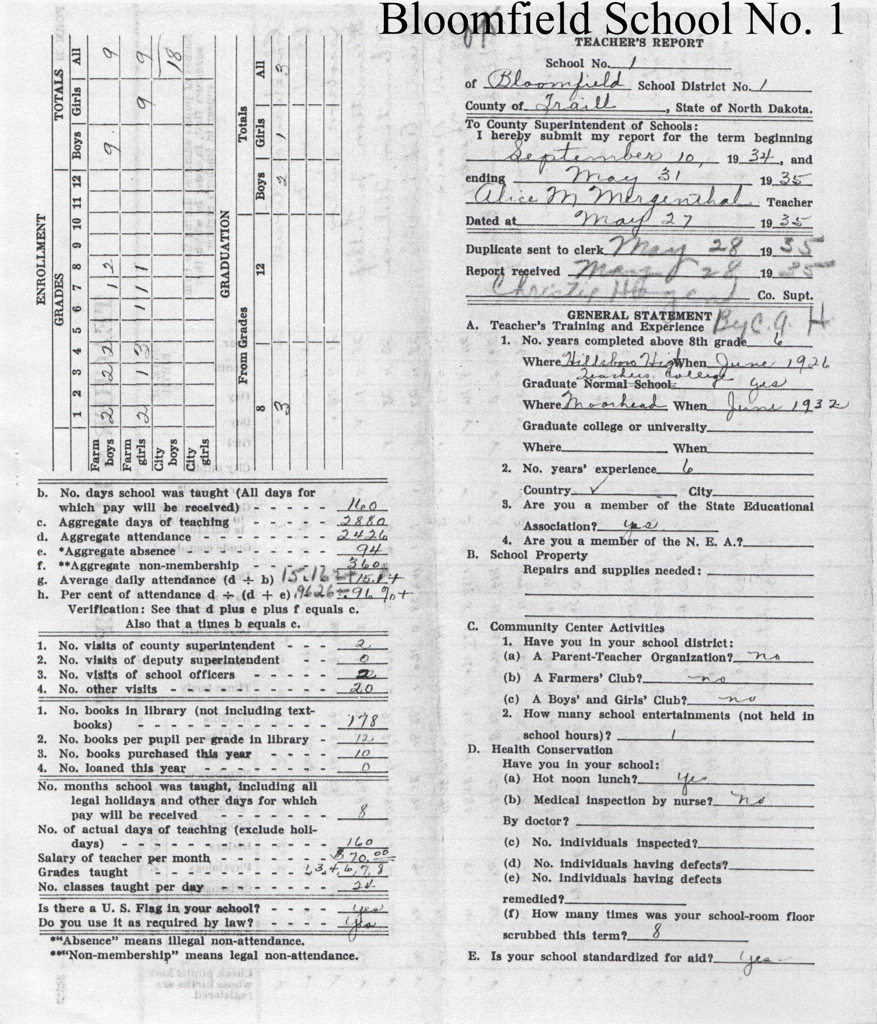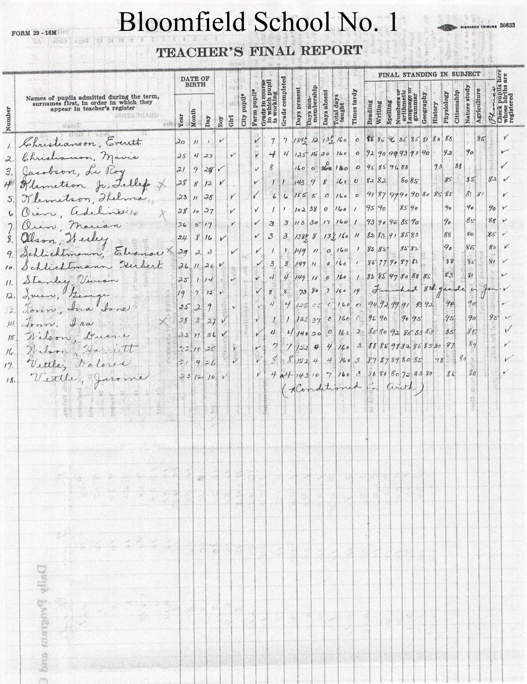 On 27 May 1935, Bloomfield School No. 1 teacher Alice M. Mergenthal reported attendances and standings in studies pursued for 18 students, including Everett Christianson, Mavis Christianson, LeRoy Jacobson, Tellef Klemetson, Thelma Klemetson, Adeline Oien, Marian Oien, Wesley Olson, Eleanor Schlichtmann, Herbert Schlichtmann, Vivian Stanley, George Sveen, Ina Ione Tonn, Ira Tonn, Duane Wilson, Harriet Wilson, Dolores Vettel, and Jerome Vettel.