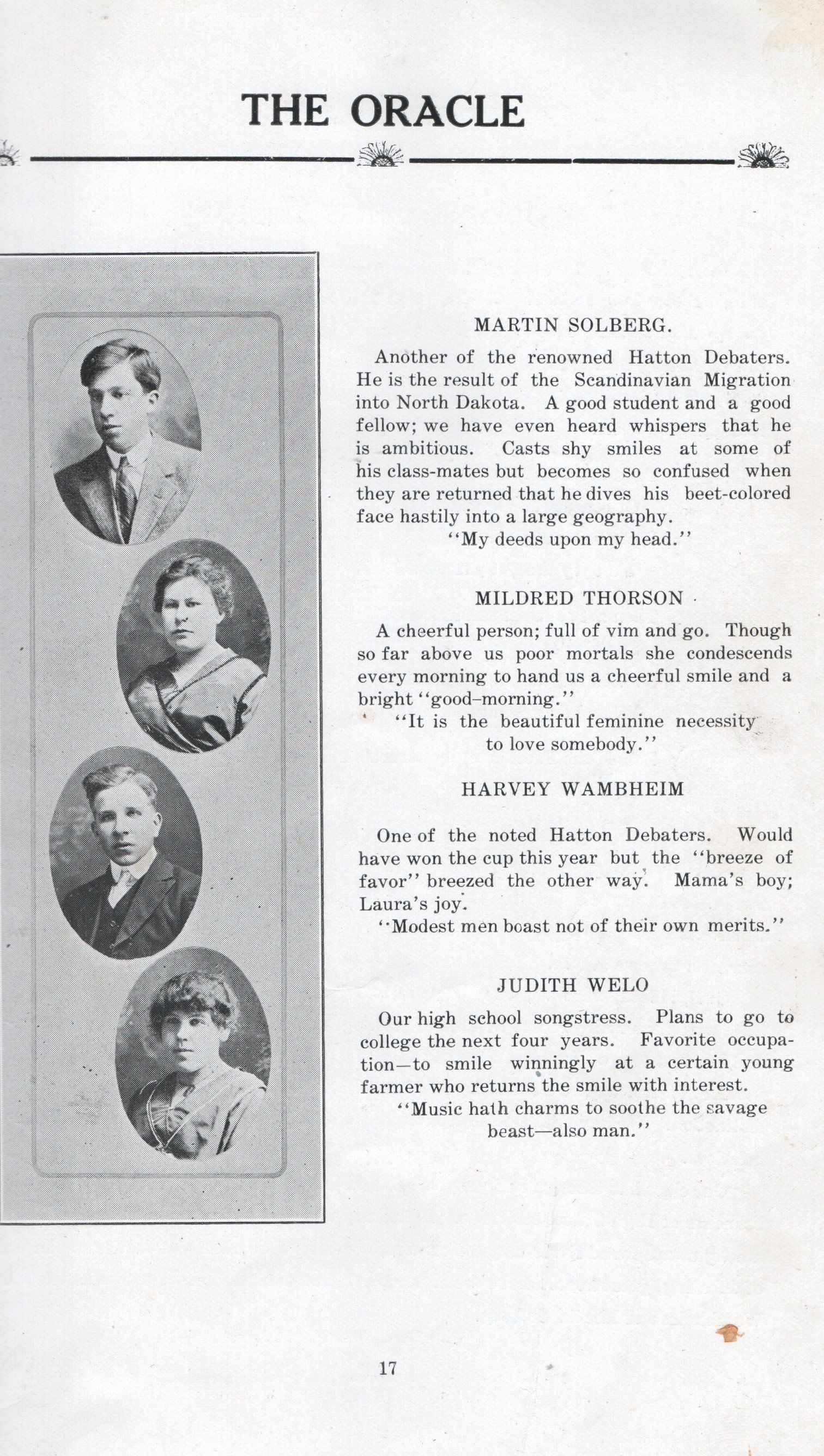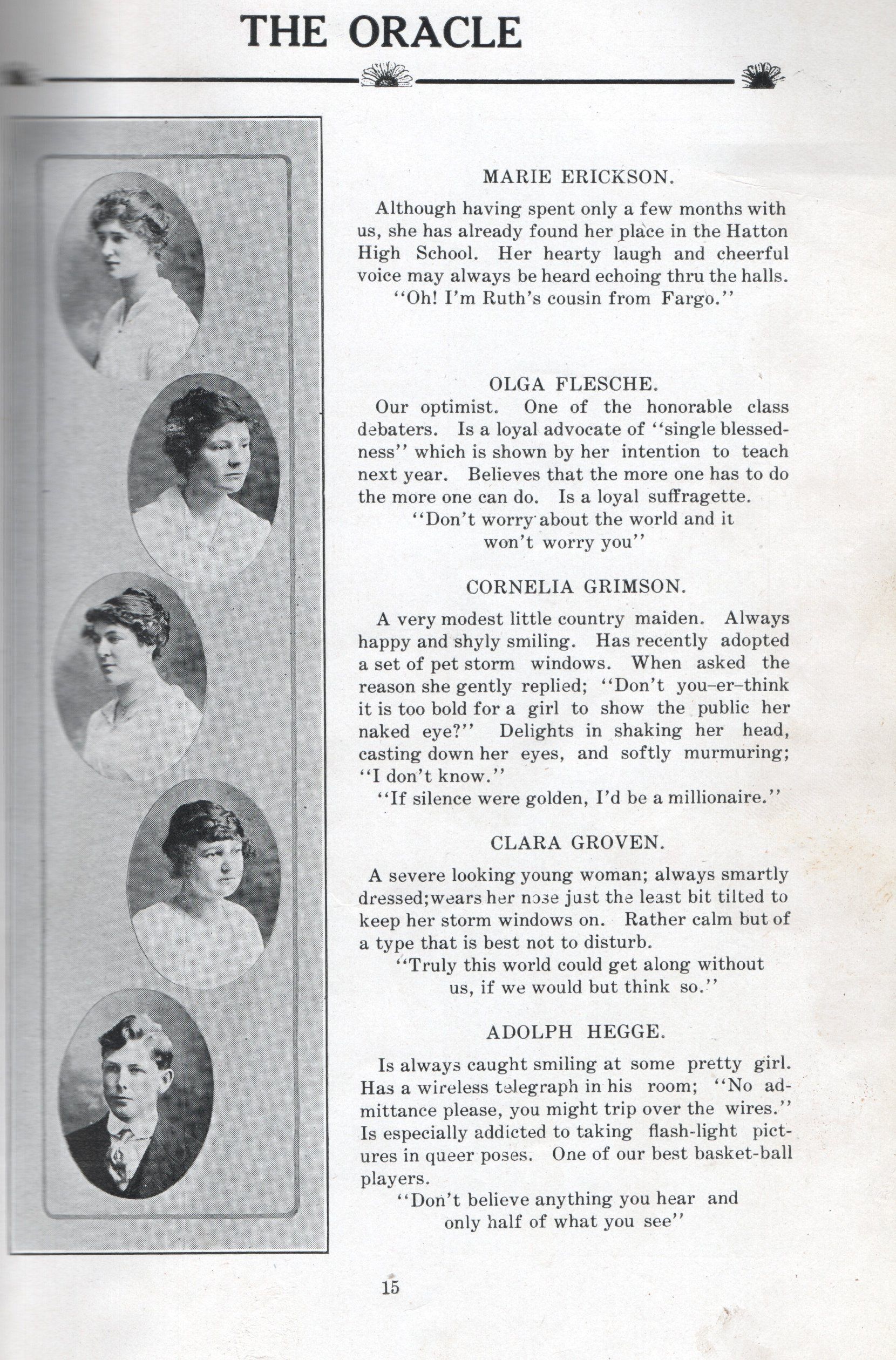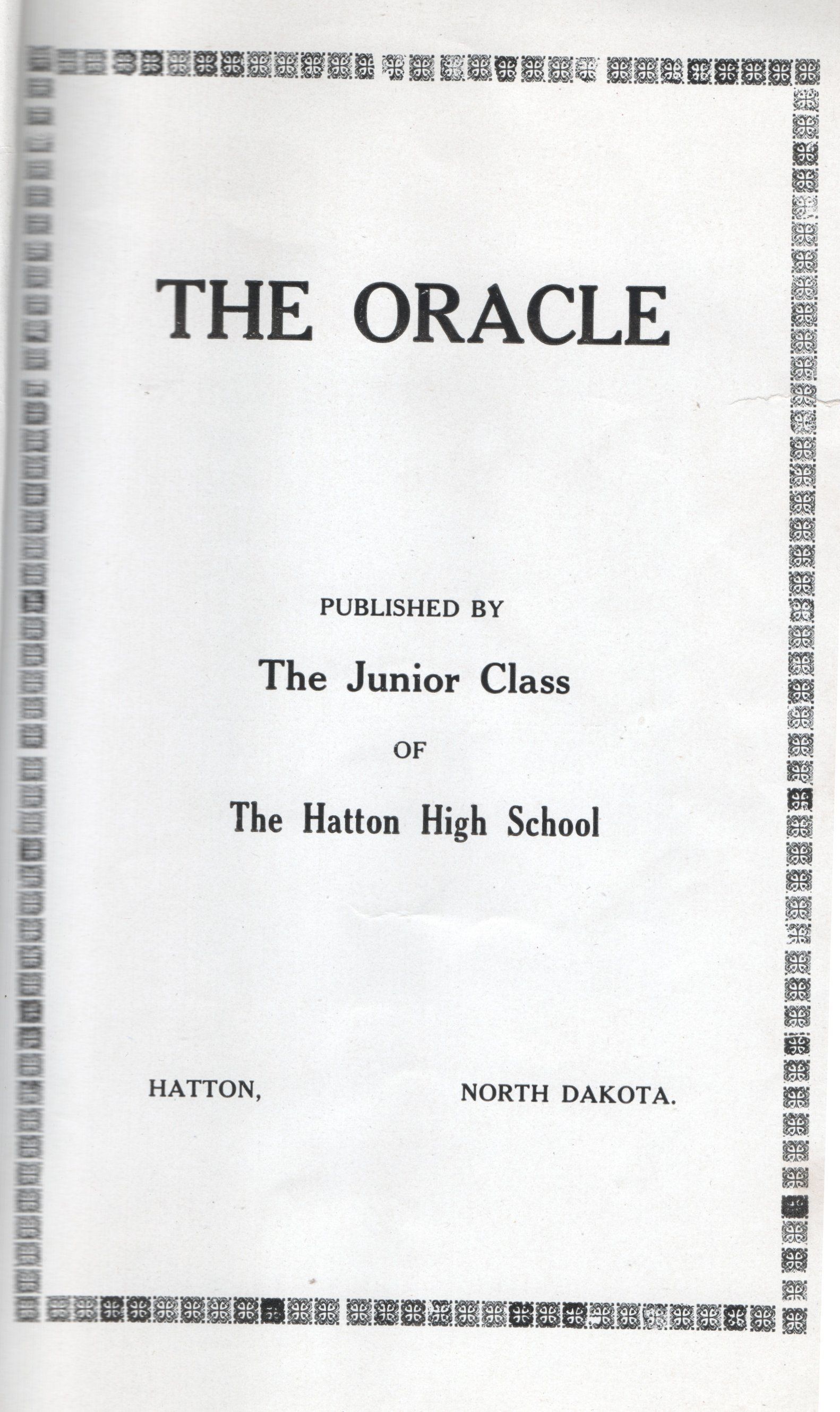 The Class of 1916 Hatton High School Yearbook, titled The Oracle, was produced by the Hatton HS Junior Class. A photograph of the Hatton High School Class of 1916 is included on page 23 in the All School Reunion book, "Hatton Flyers".