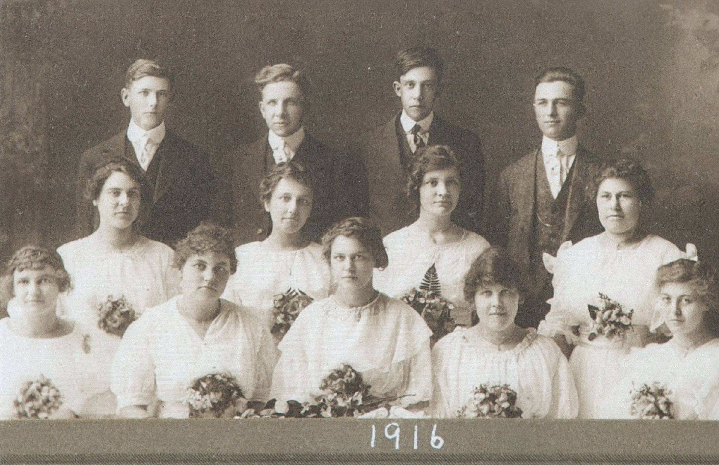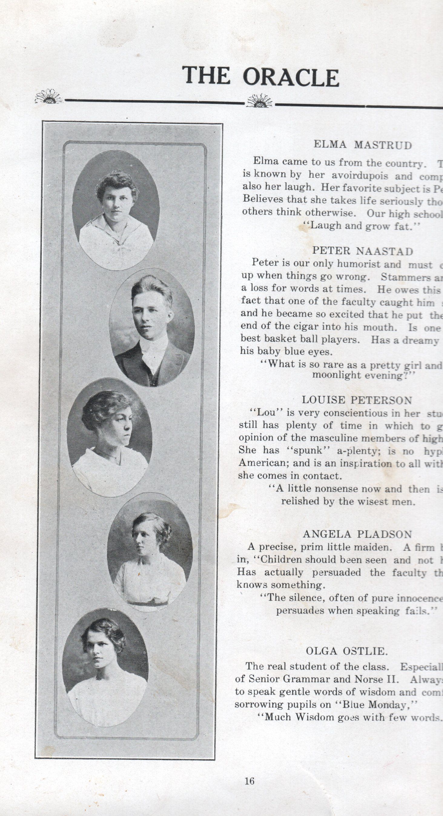 The 1916 yearbook includes three pages of Class of 1916 student photographs for: Marie Erickson, Olga Flesche, Cornelia Grimson, Clara Groven, Adolph Hegge, Alma Mastrud, Peder Naastad, Olga Ostlie, Louise Peterson, Angela Pladson, Martin Solberg, Mildred Thorson, Harvey Wambheim and Judith Welo.