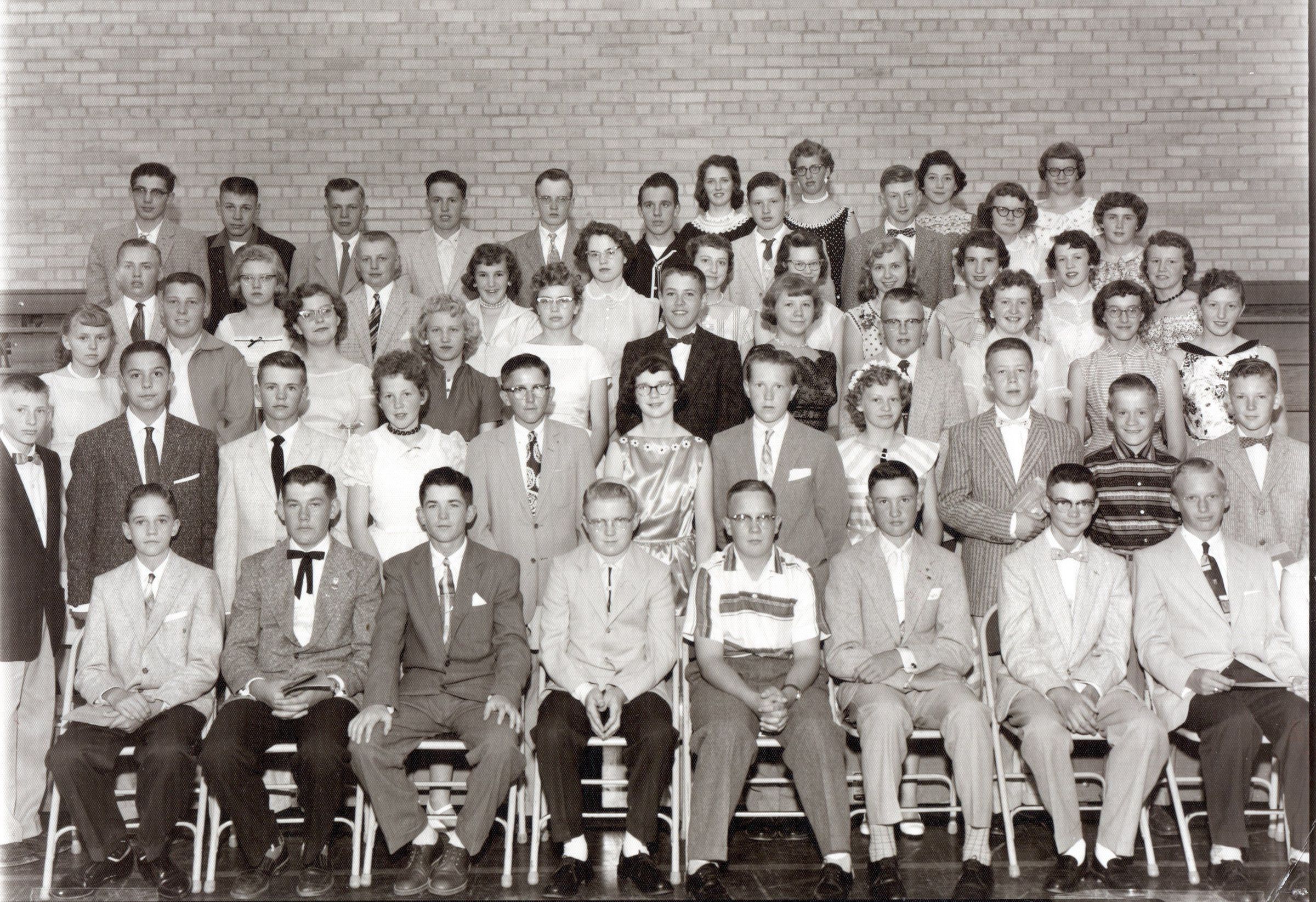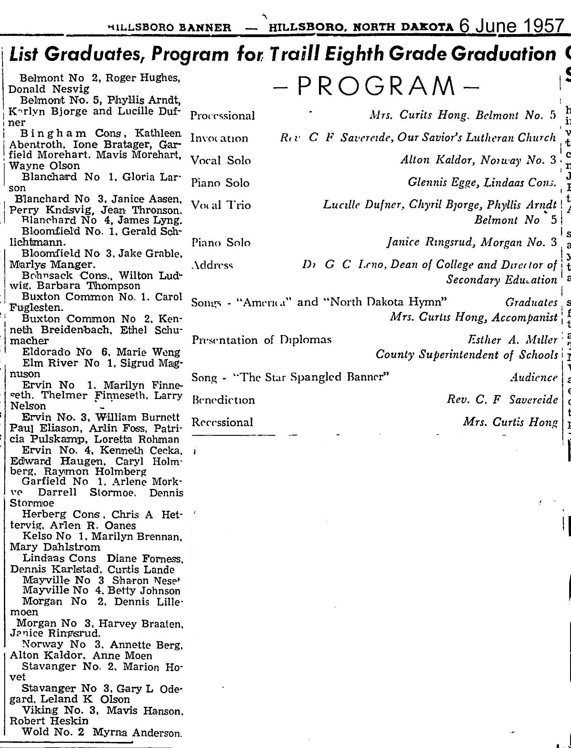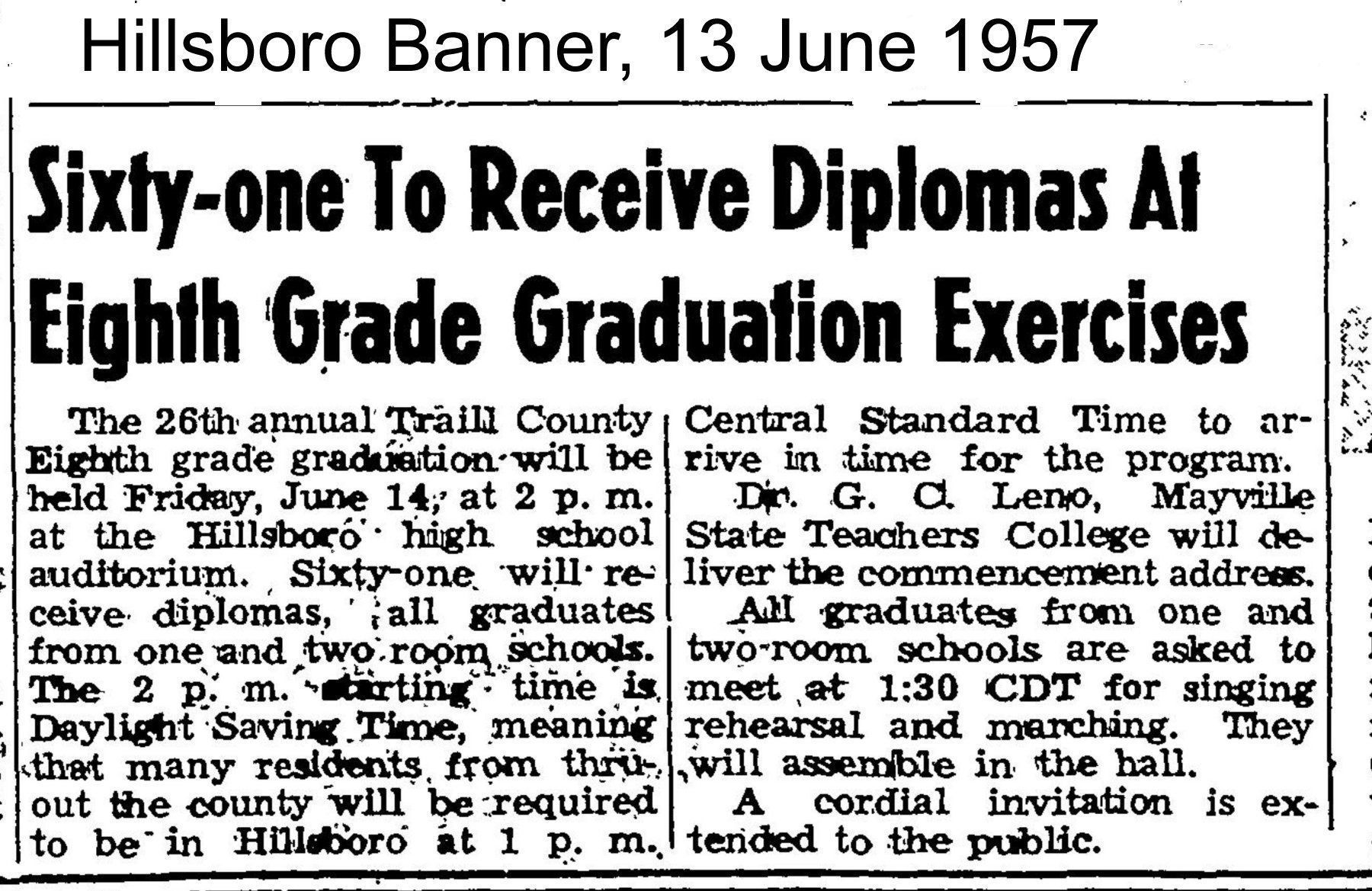 Sixty-one eighth grade students of rural one and two-room schools in Traill County, received their diplomas at a program held at the Hillsboro High School auditorium (Hillsboro Banner news, 13 June 1957).