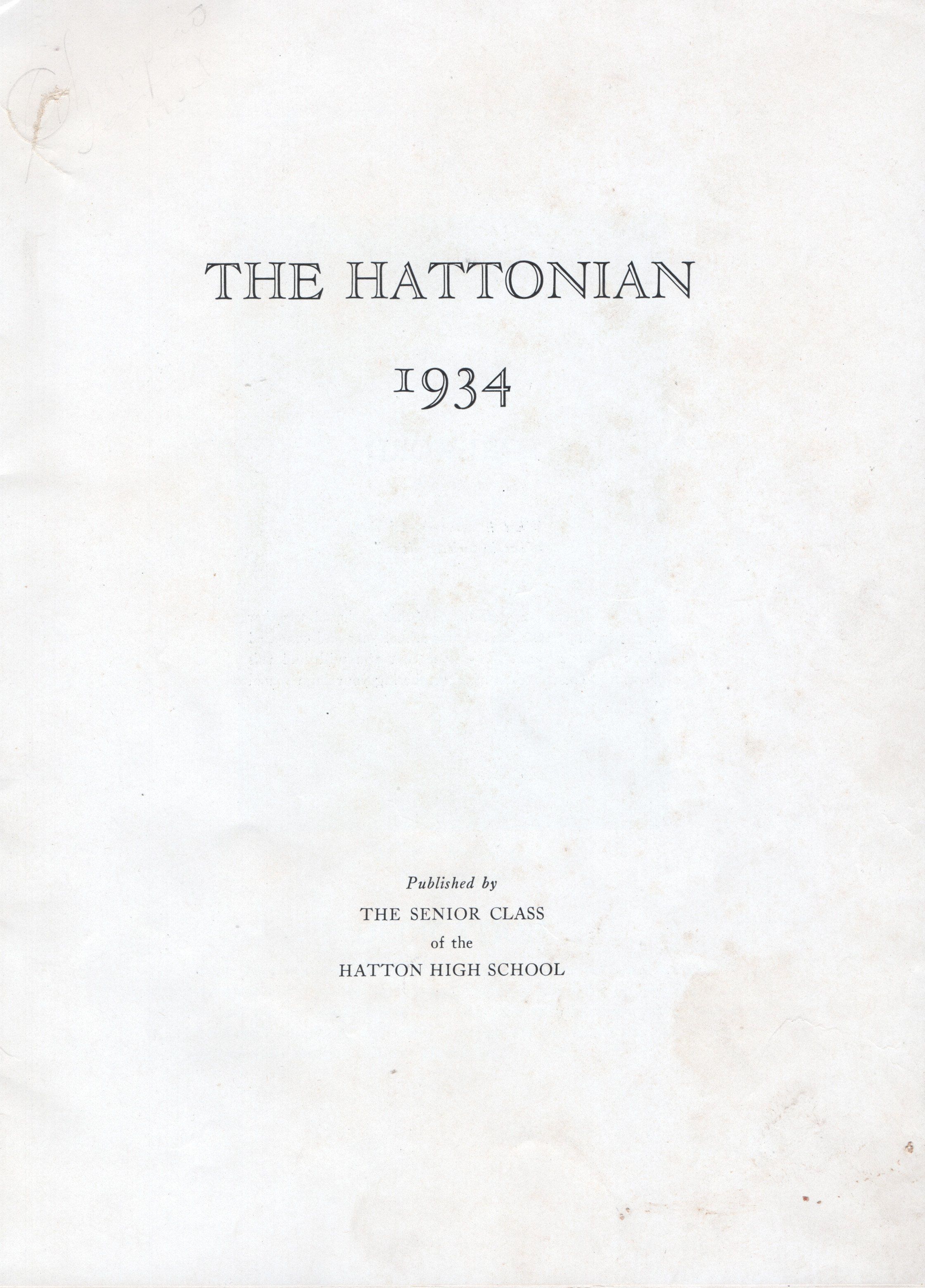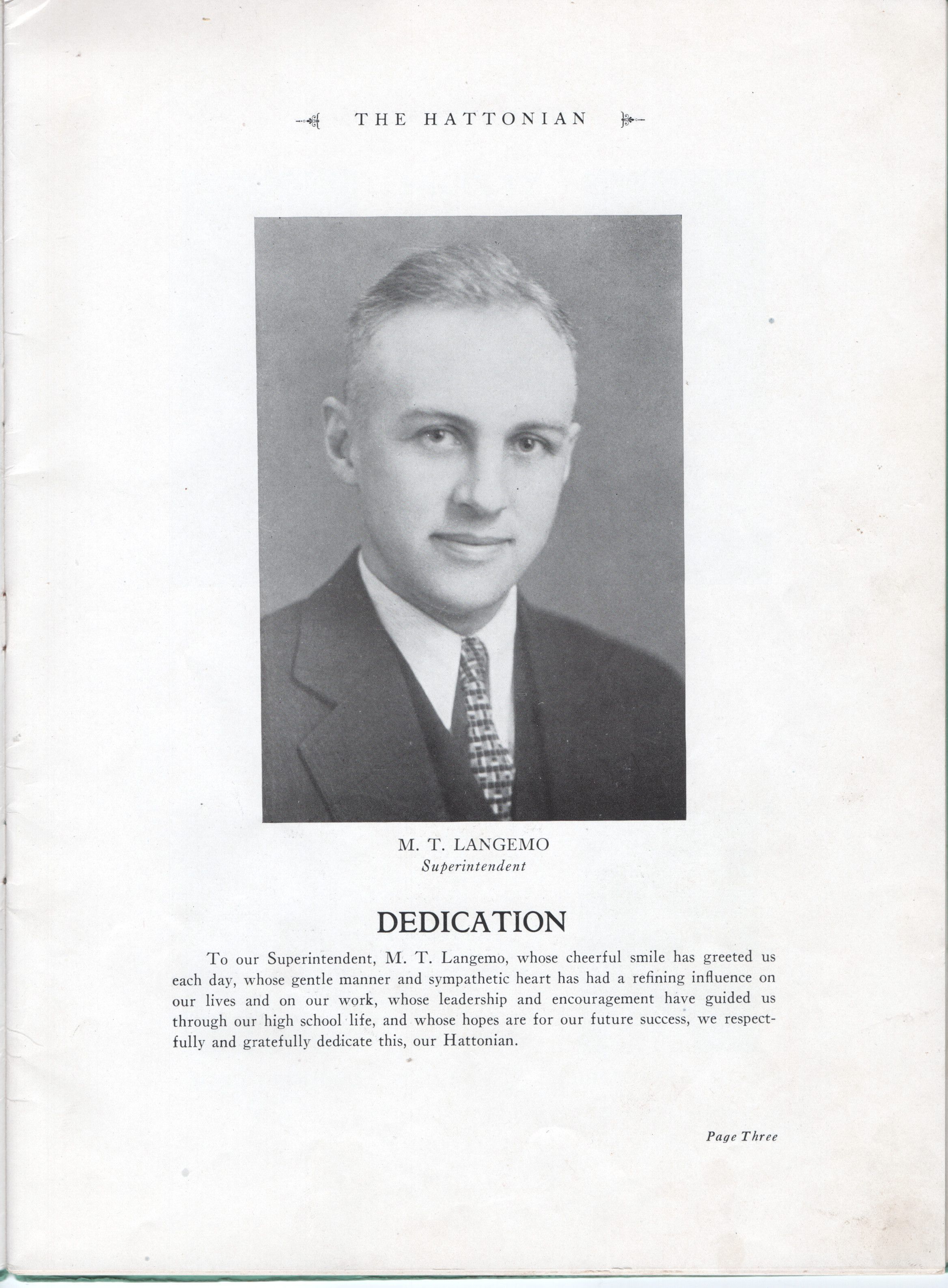 The Class of 1934 Hatton High School Yearbook, titled The Hattonian 1934, was dedicated to school Superintendent M. T. Langemo.