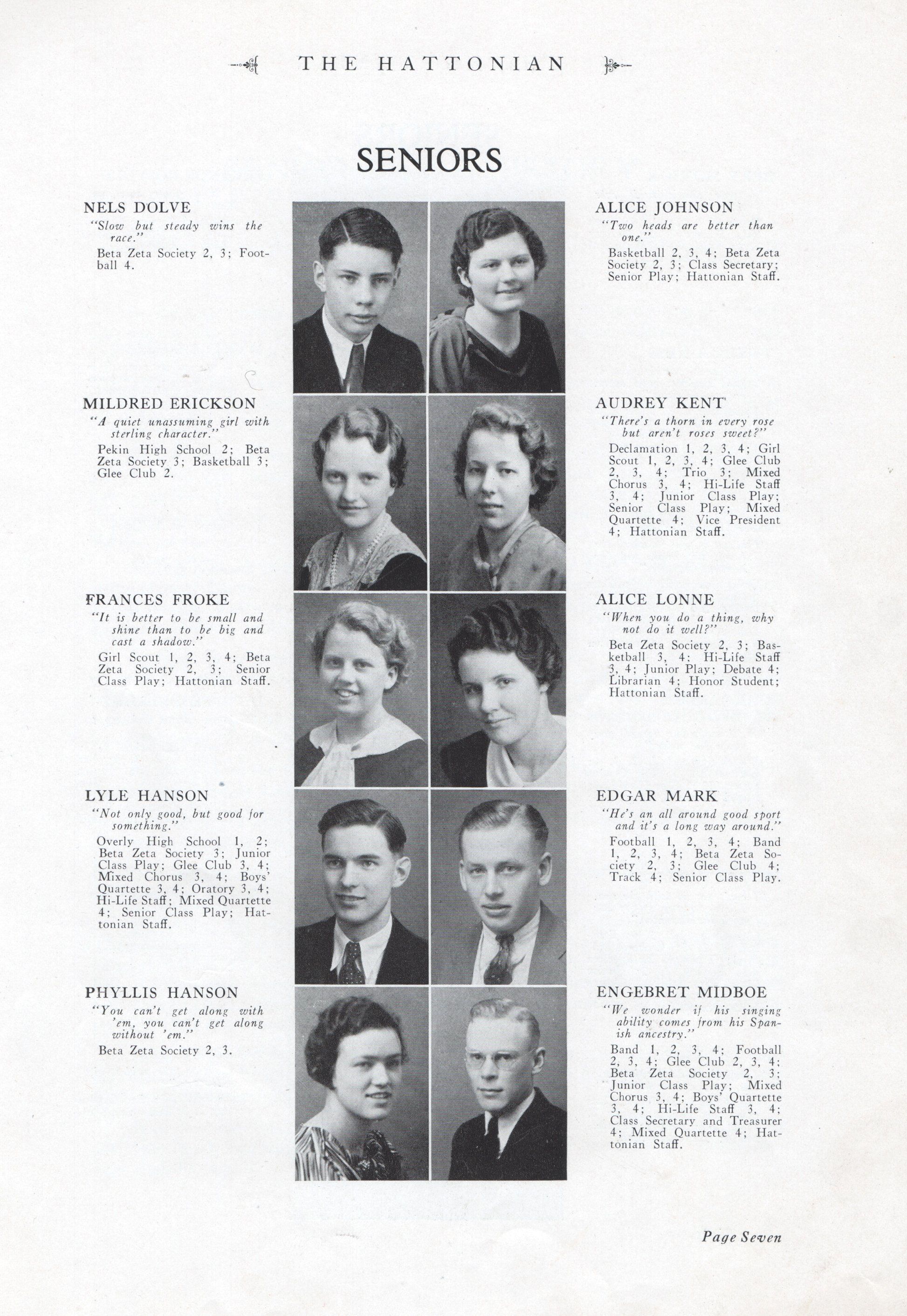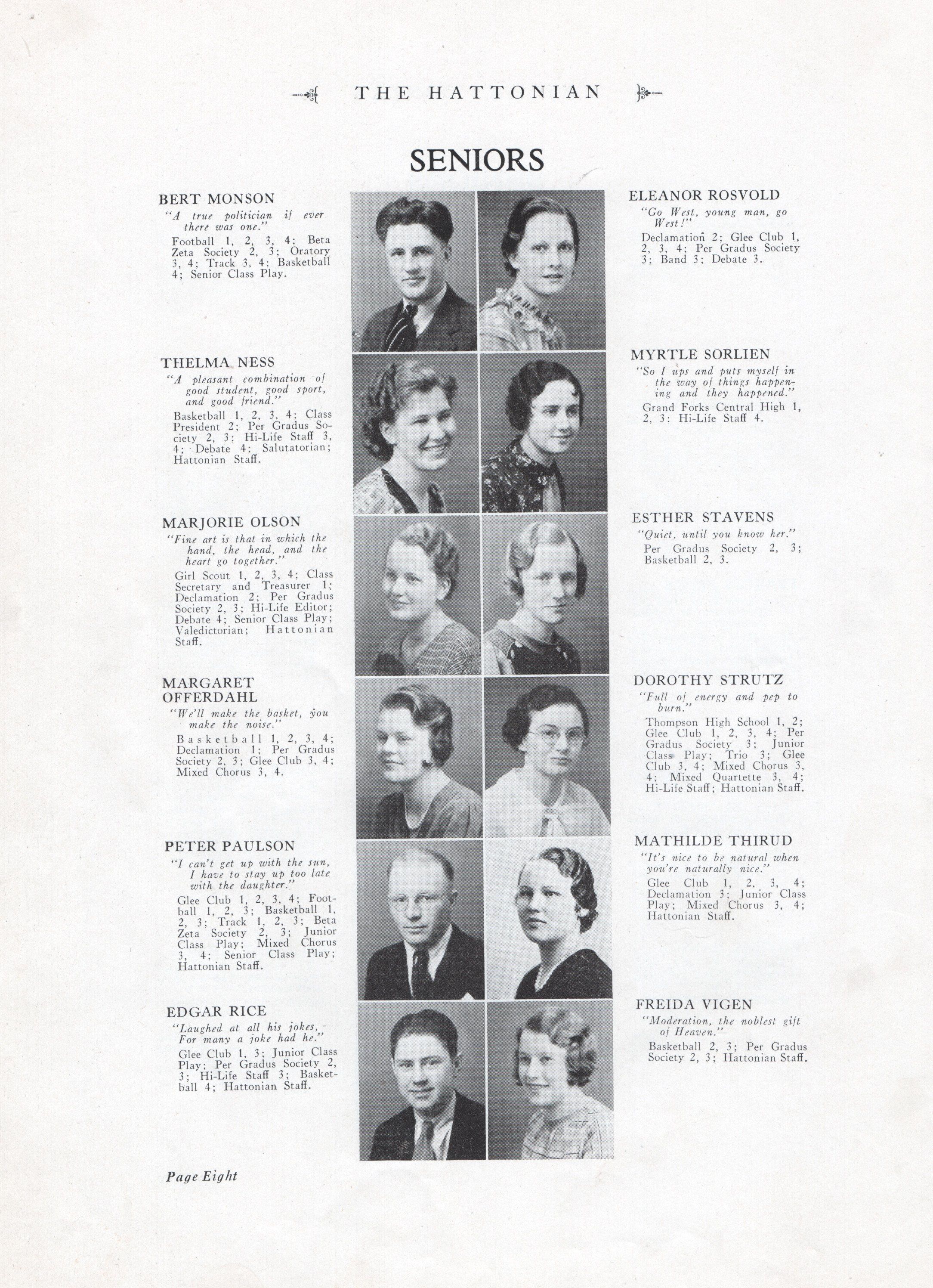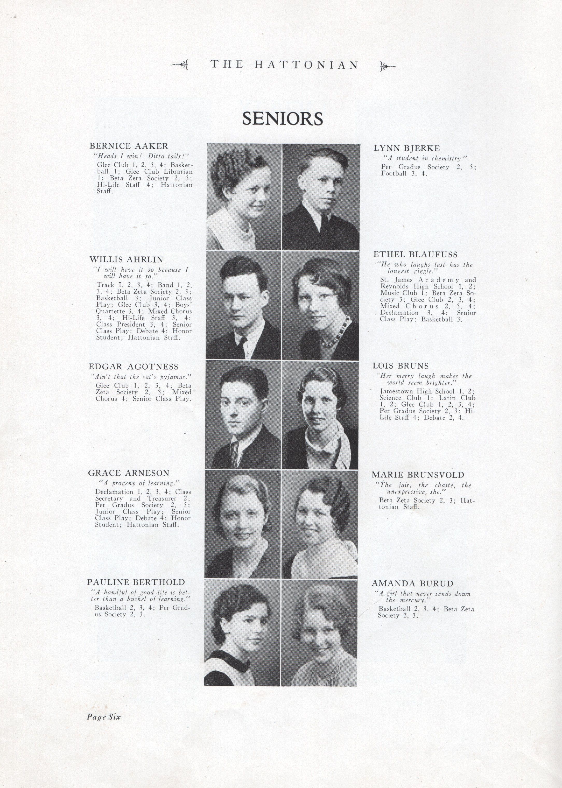 This 1934 yearbook includes three pages of Senior student photographs for: Bernice Aaker, Willis Ahrlin, Edgar Agotness, Grace Arneson, Pauline Berthold, Lynn Bjerke, Ethel Blaufuss, Lois Bruns, Marie Brunsvold, Amanda Burud, Nels Dolve, Mildred Erickson, Francis Froke, Lyle Hanson, Phyllis Hanson, Alice Johnson, Audrey Kent, Alice Lonne, Edgar Mark, Engebret Midboe, Bert Monson, Thelma Ness, Margaret Offerdahl, Marjorie Olson, Peter Paulson, Edgar Rice, Eleanor Rosvold, Myrtle Sorlien, Esther Stavens, Dorothy Strutz, Mathilde Thirud, and Freida Vigen.