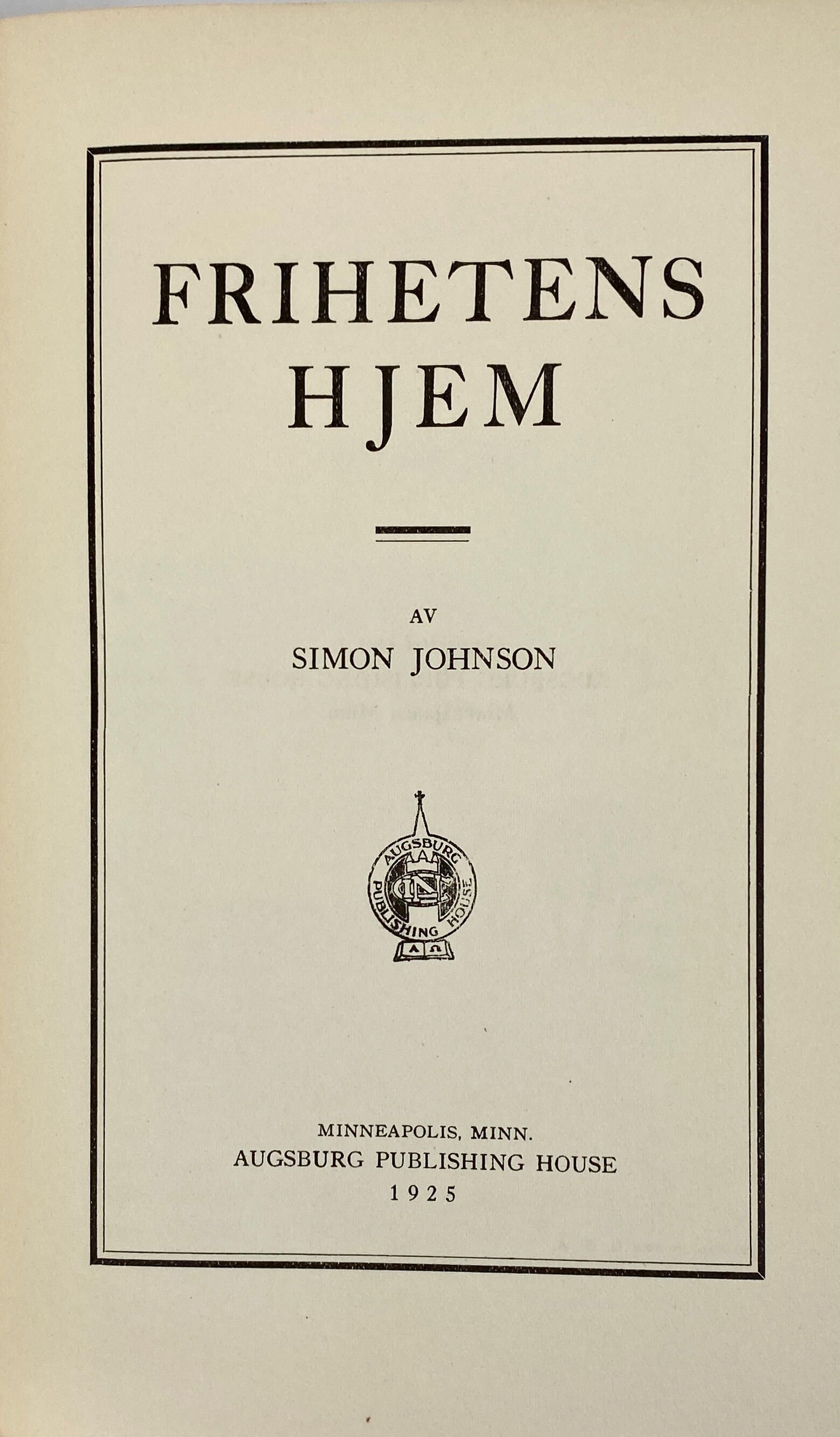 Freedoms Home by Simon Johnson, published in 1925 by Augsburg Publishing House, Minneapolis, Minnesota.Cataloged By