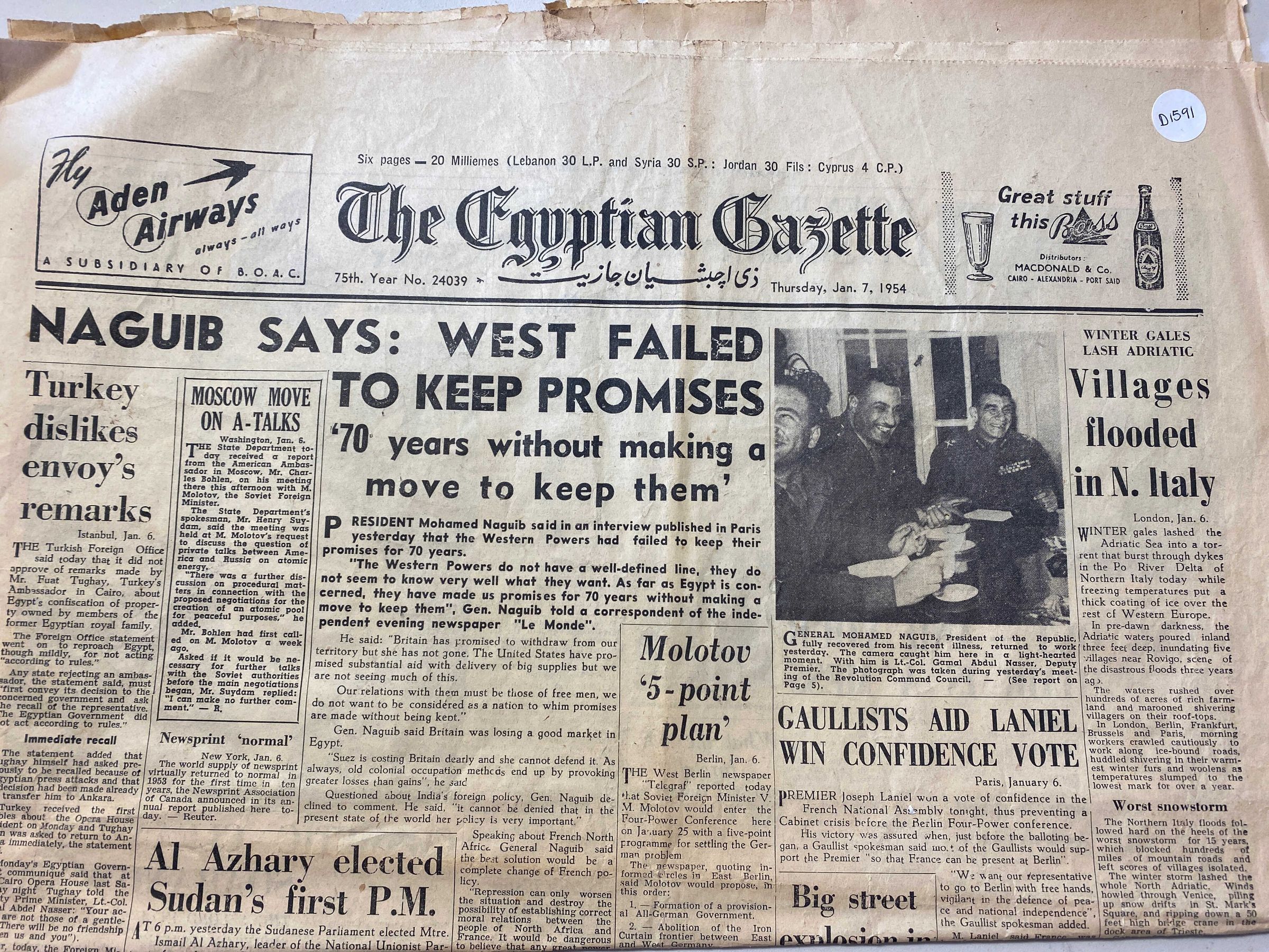 The Egyptian Gazette - January 7, 1954 - Naguib says: West Failed to Keep PromisesCataloged By