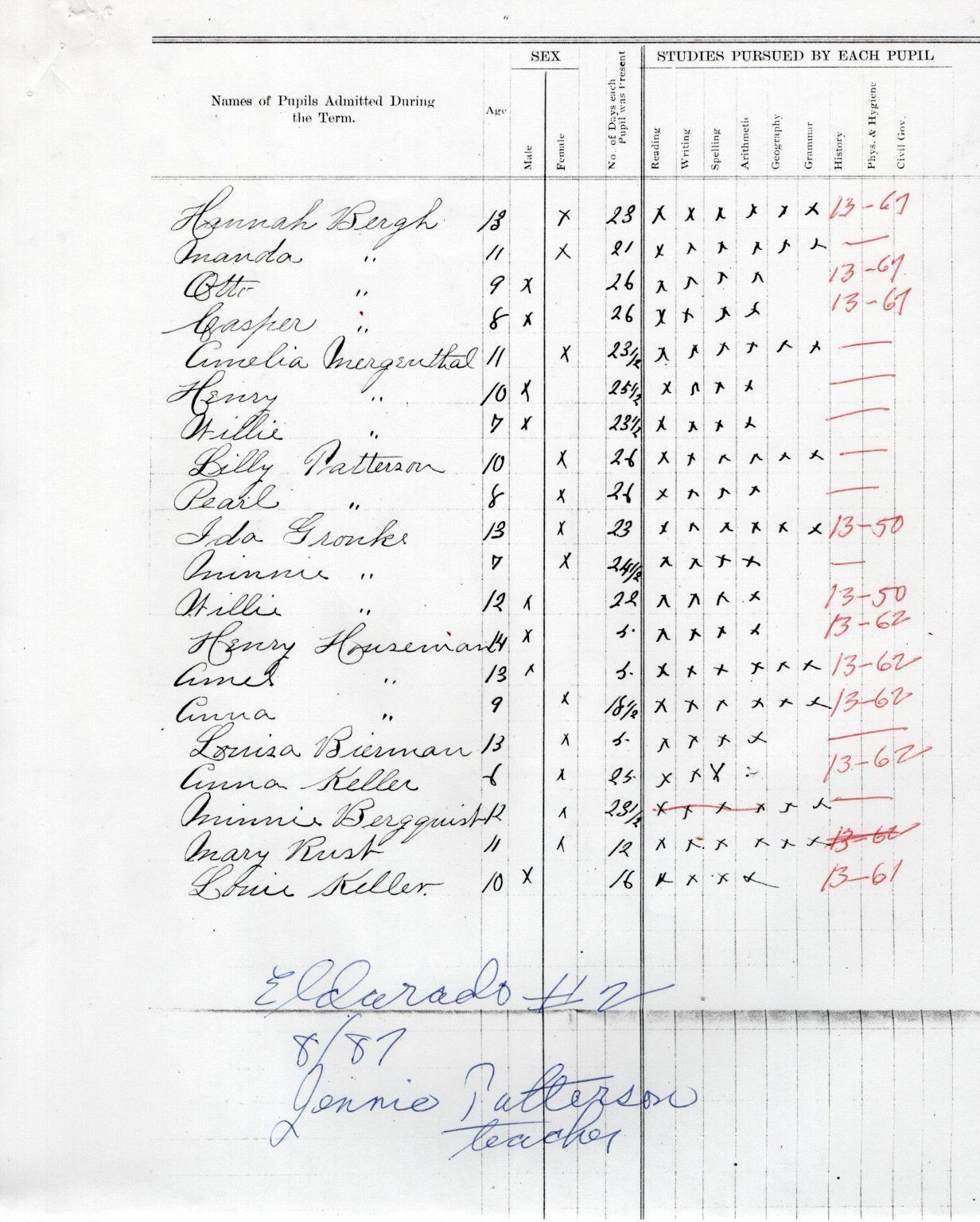 In August 1887, Eldorado School No. 2 Teacher Jennie Patterson reported attendances and studies pursued for 20 students, including: Casper Bergh, Hannah Bergh, Manda Bergh, Otto Bergh, Minnie Bergquist, Louisa Bierman, Ida Gronke, Minnie Gronke, Willie Gronke, Amel Houseman, Anna Housman, Henry Houseman, Anna Keller, Louie Keller, Amelia Mergenthal, Henry Mergenthal, Willie Mergenthal, Lillie Patterson, Pearl Patterson, and Mary Rust.