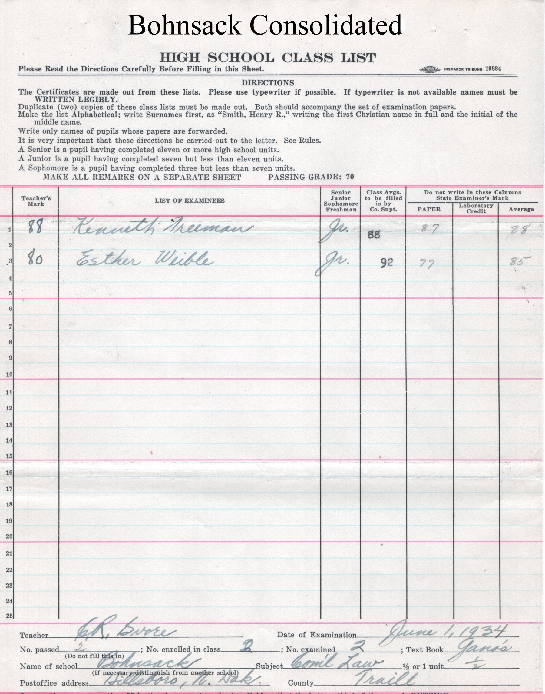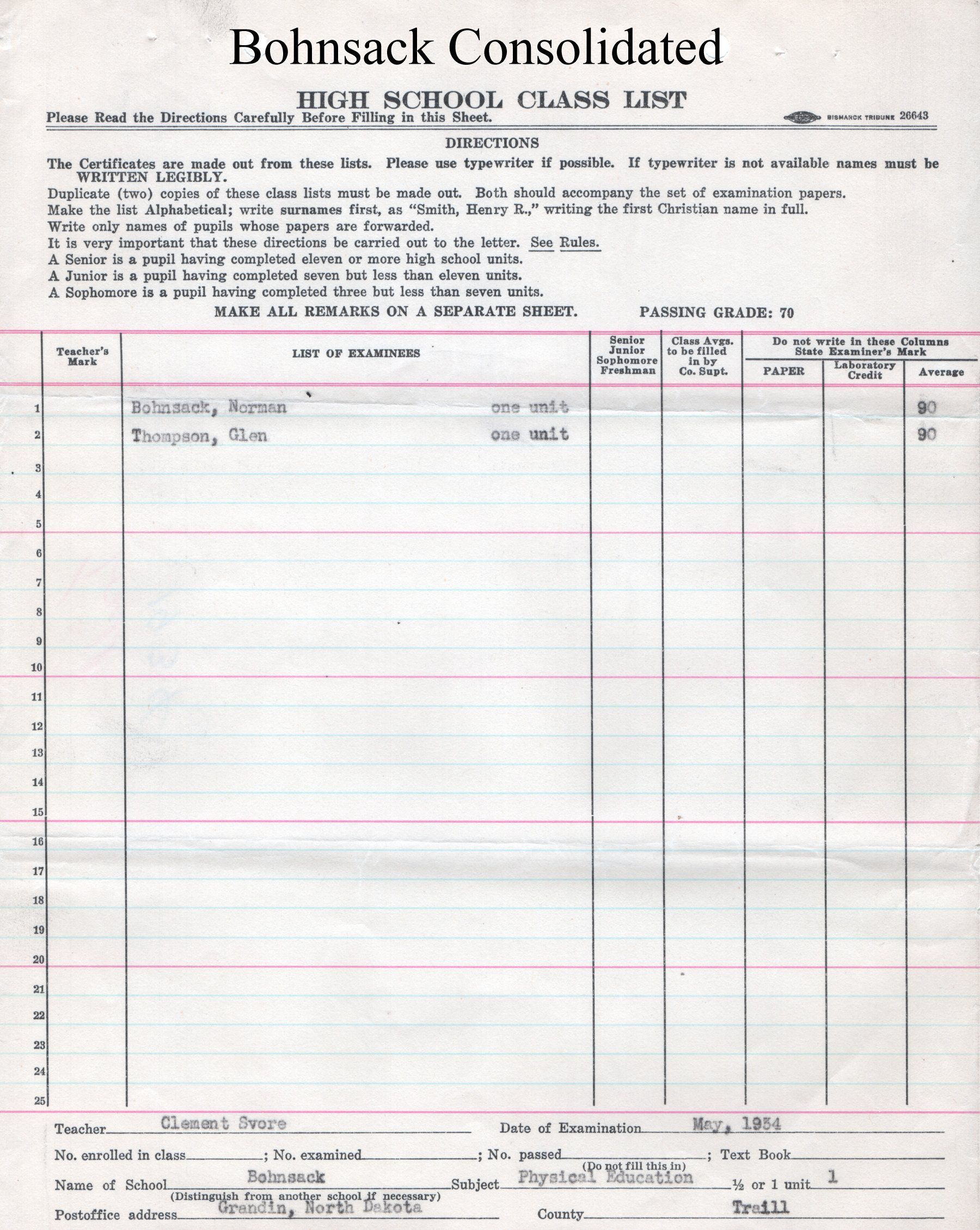 During the 1933-1934 Bohnsack Consolidated school year, High School teacher, Clement R. Svore (see photo), assessed and graded the students in two classes, Commercial Law and Physical Education, including Norman Bohnsack, Kenneth Freeman, Glen Thompson and Esther Weible. Unfortunately, pages for a number of other classes, such as English, are missing.