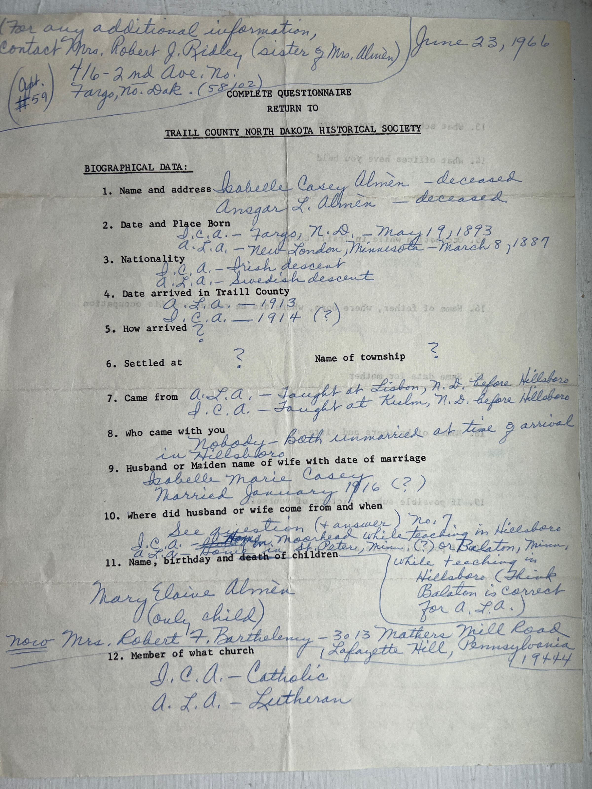 A completed questionnaire on the family of Ansgar and Isabelle (Casey) Almen, as completed by Mrs Robert J Ridley (sister to Isabelle) of FargoCataloged By