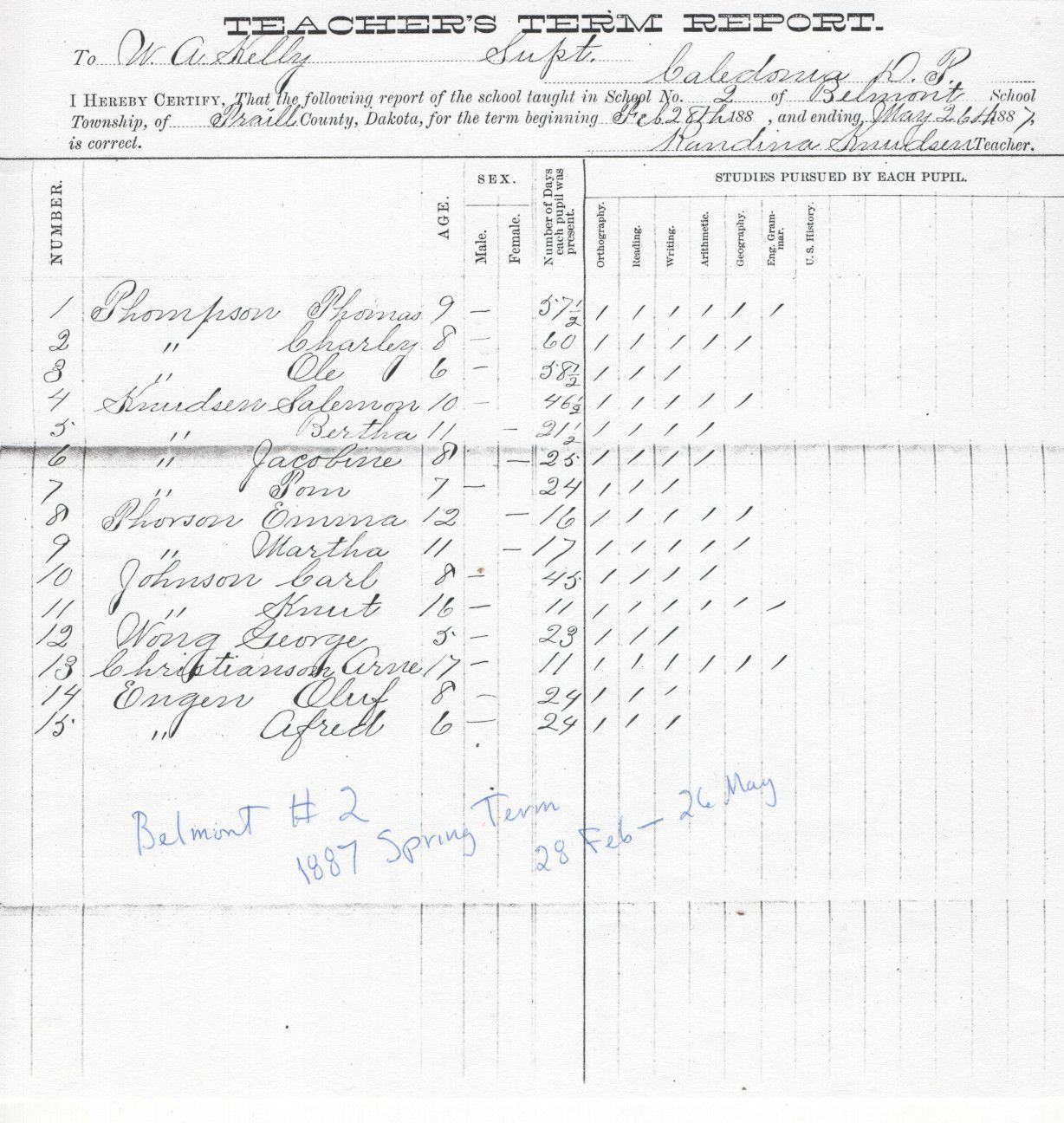 In the 1887 Spring Term (28 Feb-26 May) Belmont School No. 2 teacher Randina Knudsen reported attendances and studies pursued for 15 students, including Arne Christianson, Alfred Engen, Oluf Engen, Carl Johnson, Knut Johnson, Bertha Knudsen, Jacobine Knudsen, Salemon (Samuel) Knudsen, Thomas Knudsen, Charley Thompson, Ole Thompson, Thomas (Tom) Thompson, Emma Thorson, Martha Thorson and George Wang.