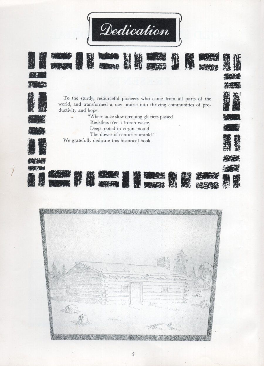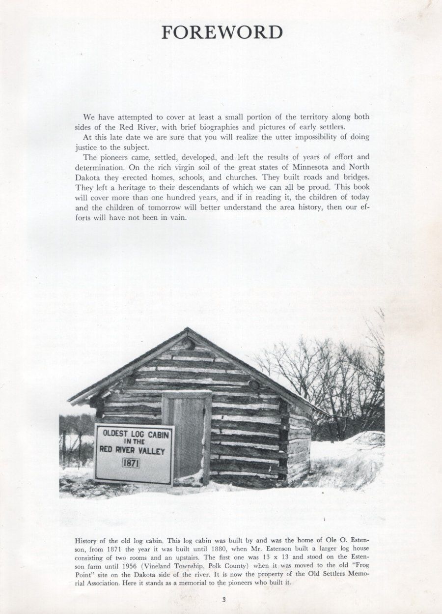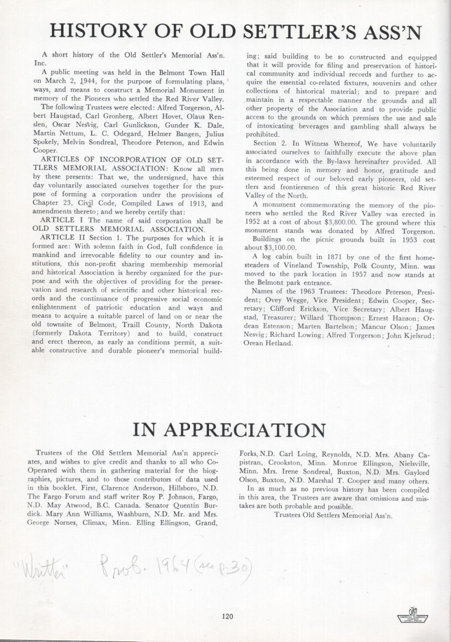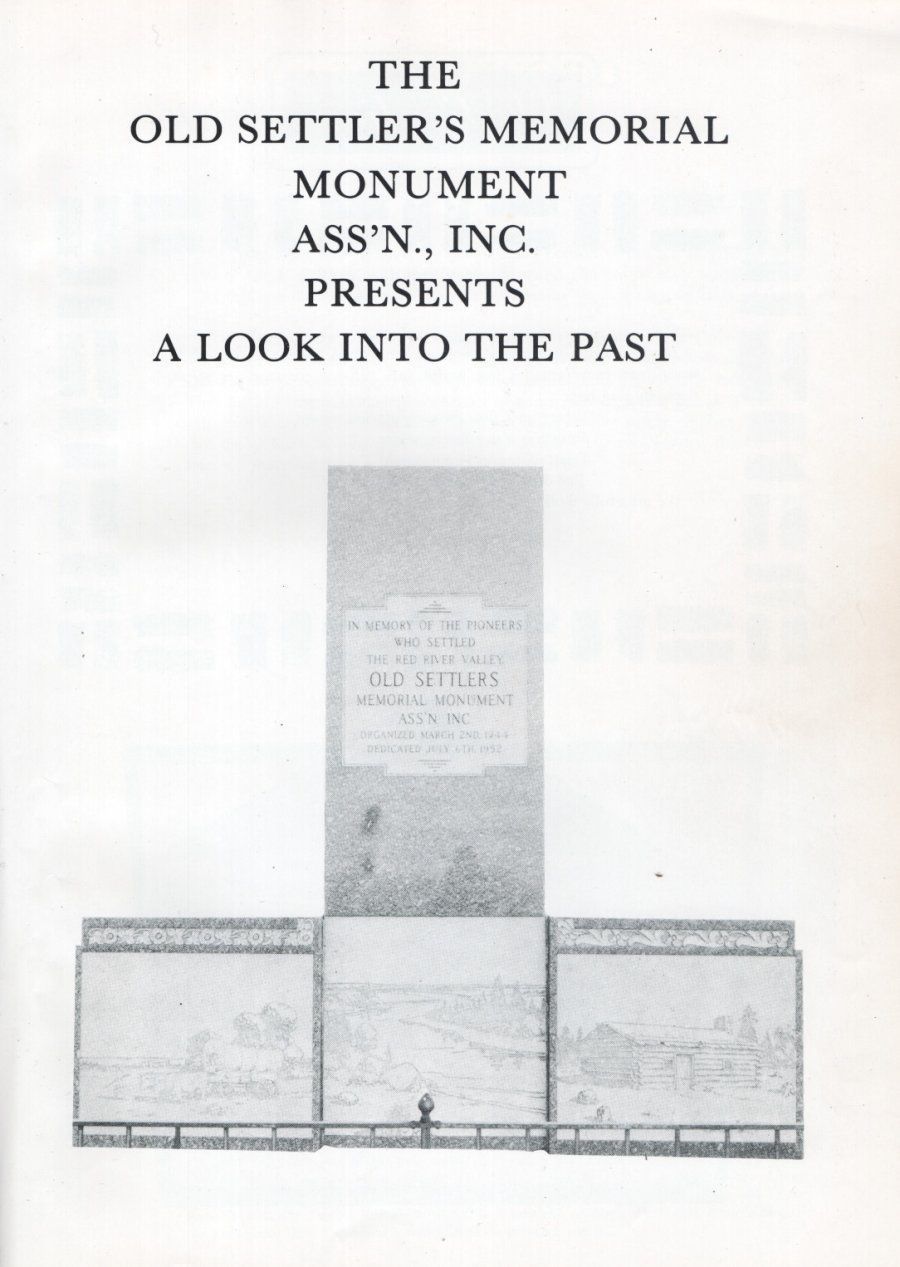 An 8" by 11" Green book published in 1964 by the Old Settlers Memorial Association containing 120 pages on "A Look into the Past" of families who settled in townships and towns in Traill County, and southern Grand Forks County in North Dakota, and townships and towns across the Red River in Minnesota. A Dedication page and Foreword page are included in this folder (below). The 120 pages also include brief histories and photographs of many of the earliest settlers, and of towns, churches and schools. The final page 120, provides a history of the Old Settler's Association and their Appreciation to contributors.