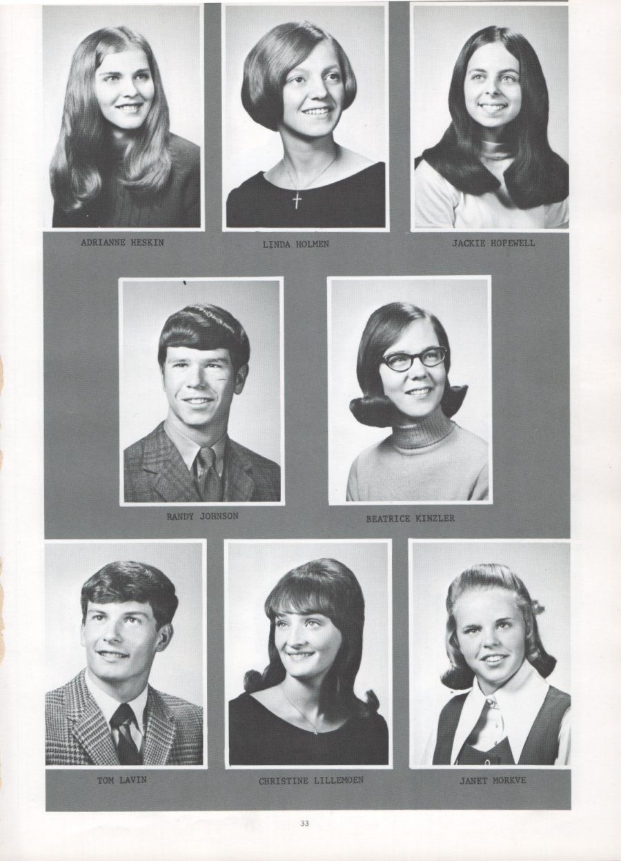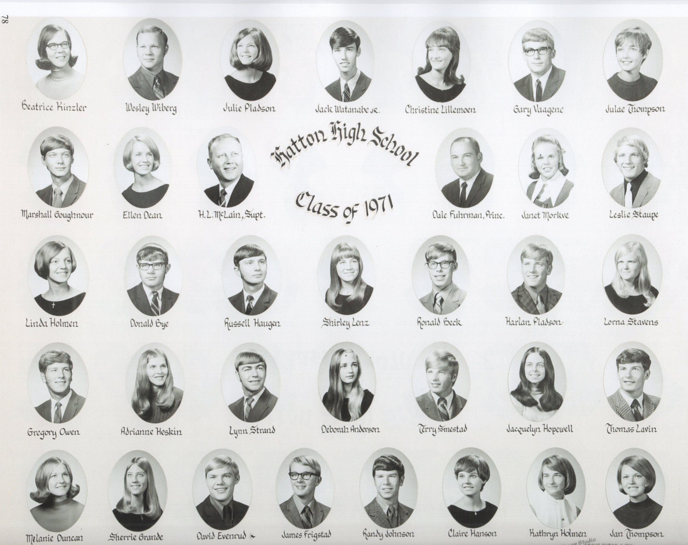 The 1971 yearbook includes four pages of Senior student photographs for: Deborah Anderson, Ronald Beck, Donald Bye, Ellen Dean, Melanie Duncan, David Evenrud, Sherrie Grande, Claire Hanson, Russell Haugen, Adrianne Heskin, Linda Holmen, Jackie Hopewell, Randy Johnson, Beatrice Kinzler, Tom Lavin, Christine Lillemoen, Janet Morkve, Greg Owen, Harlan Pladson, Julie Pladson, Terry Smestad, Leslie Staupe, Lorna Stavens, Lynn Strand, Jan Thompson, Julae Thompson, Gary Vaagene, Jack Watanabe, and Wesley Wiberg. Not pictured: James Frigstad, Marshall Goughnour, Kathy Holmen, Colleen Huus, and Shirley Lenz.