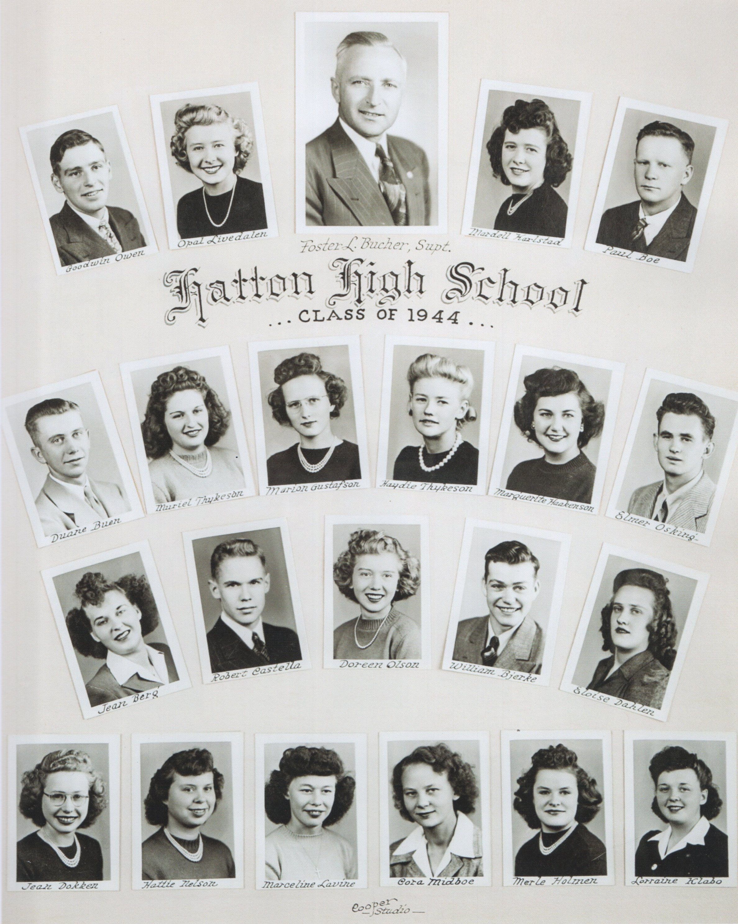 Hatton High School Class of 1944 seniors included: Jean Berg, William Bjerke, Paul Boe, Duane Buen, Robert Castella, Eloise Dahlen, Jean Dokken, Marion Gustafson, Marguerite Haakenson, Merle Holmen, Mardell Karlstad, Lorraine Klabo, Marceline Lavine, Opal Livedalen, Cora Midboe, Hattie Nelson, Doreen Olson, Elmer Osking, Goodwin Owen, Haydie Thykeson, and Muriel Thykeson.