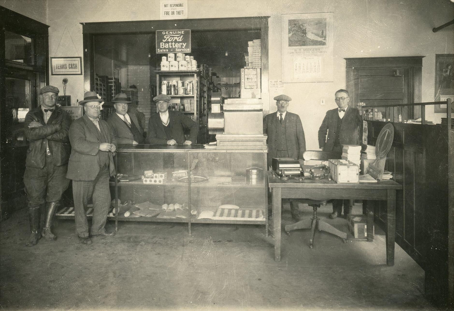 Left to Right - Ernest Johnson, County Engineer; Carl Berdahl, Salesman at Hillsboro Auto; E. Acker, Clothing Salesman; R. T. Jahr, Co-Partner of Hillsboro Auto; Theodore Jahr, Co-Partner of Hillsboro Auto; and Ole Dammen, Bookkeeper and Parts Man.Subject Person or Organization