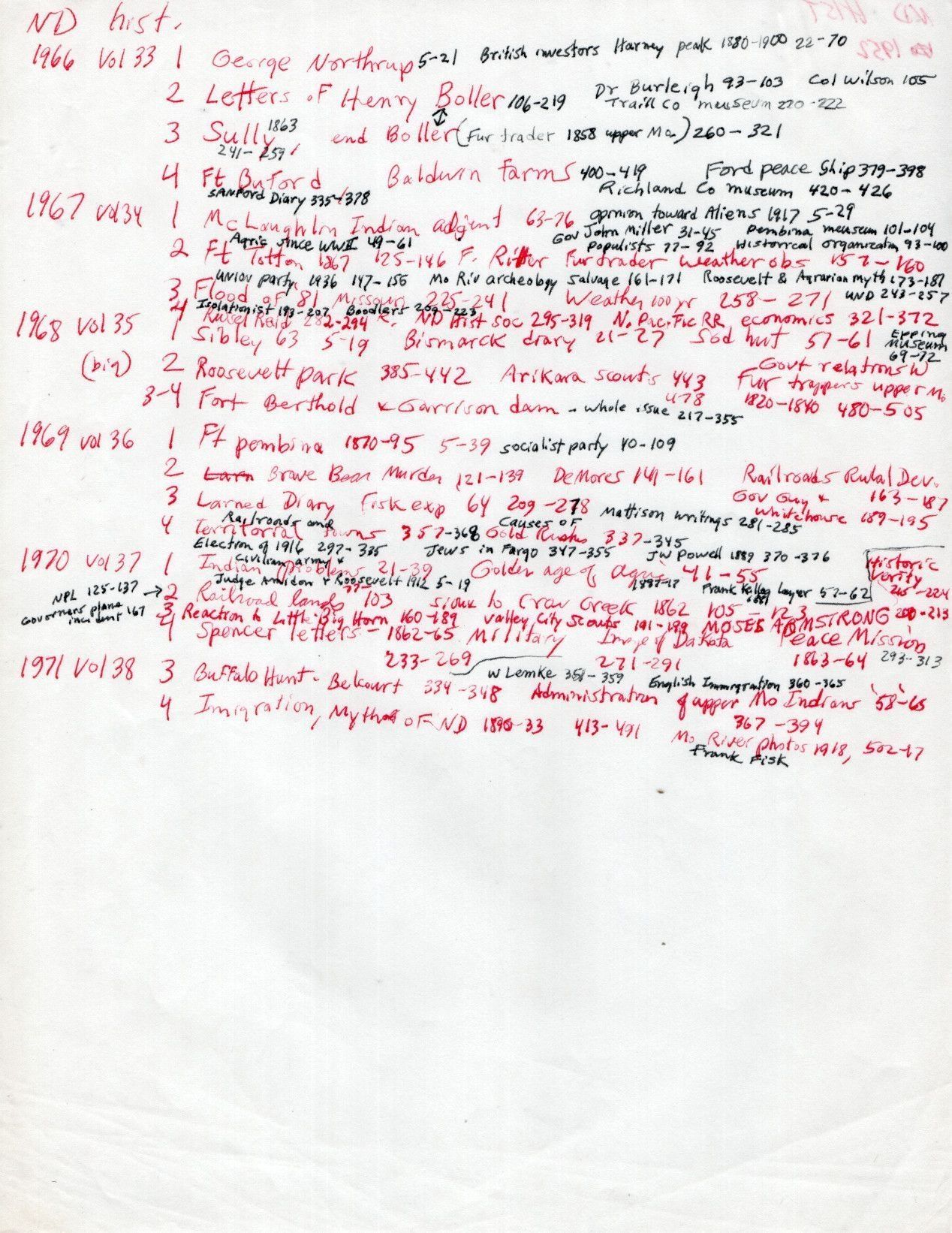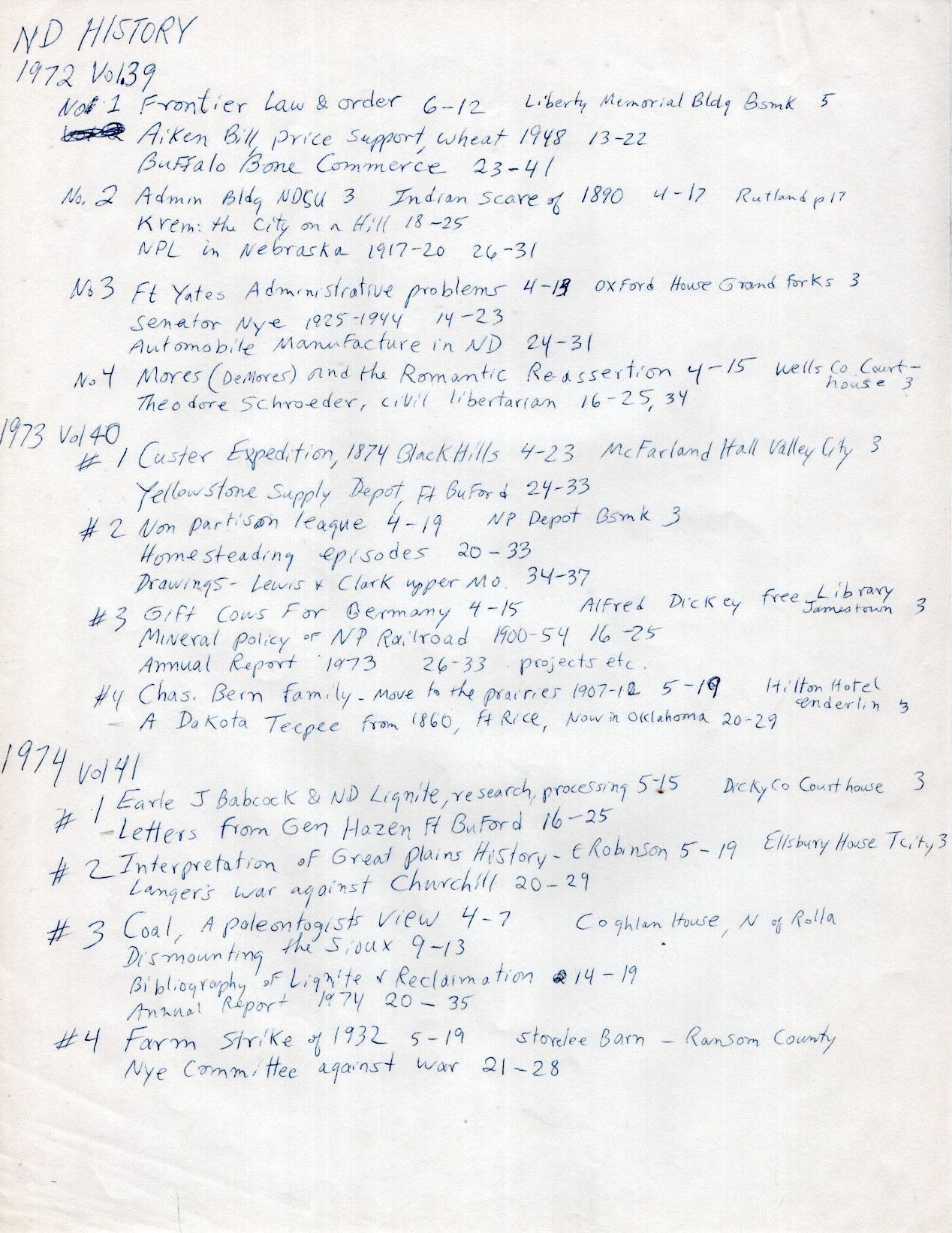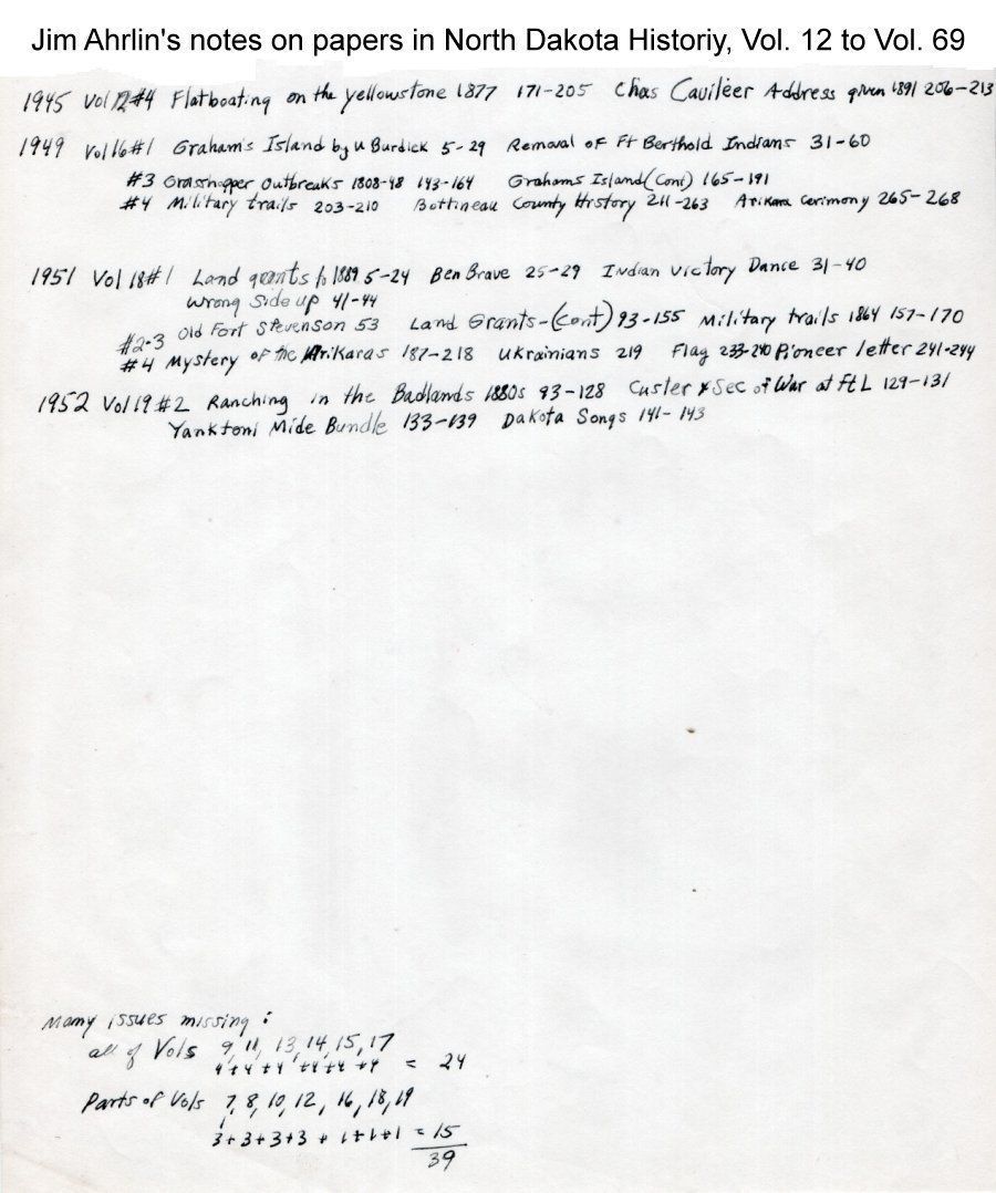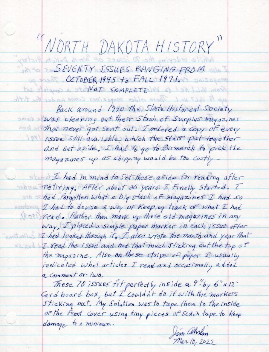 In addition, Jim Ahrlin has provided 7 pages of hand-written notes highlighting some of the papers in issues of the journal (see below). A notation at the bottom of page 1 lists which North Dakota History journal issues are missing, either completely or in part.Acquisition