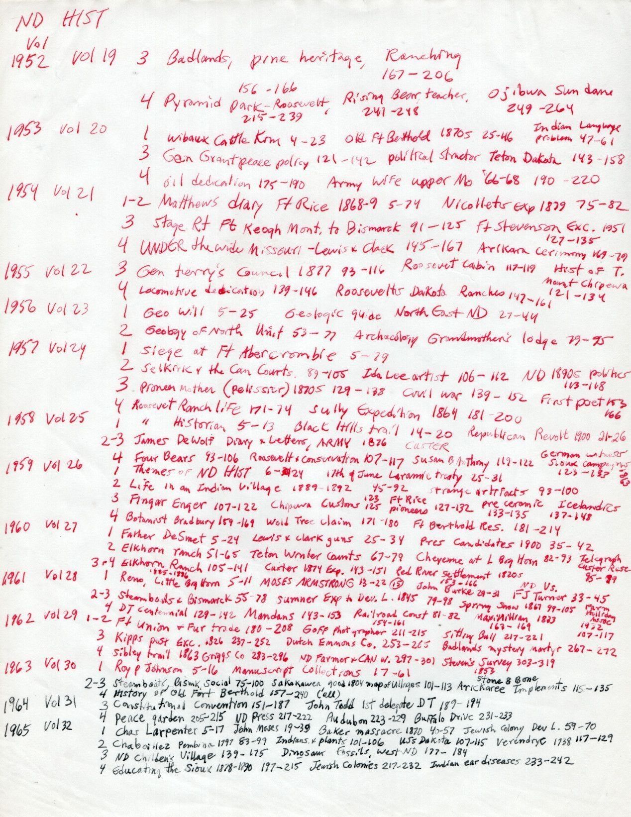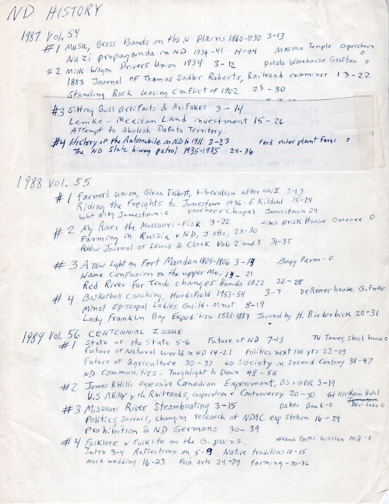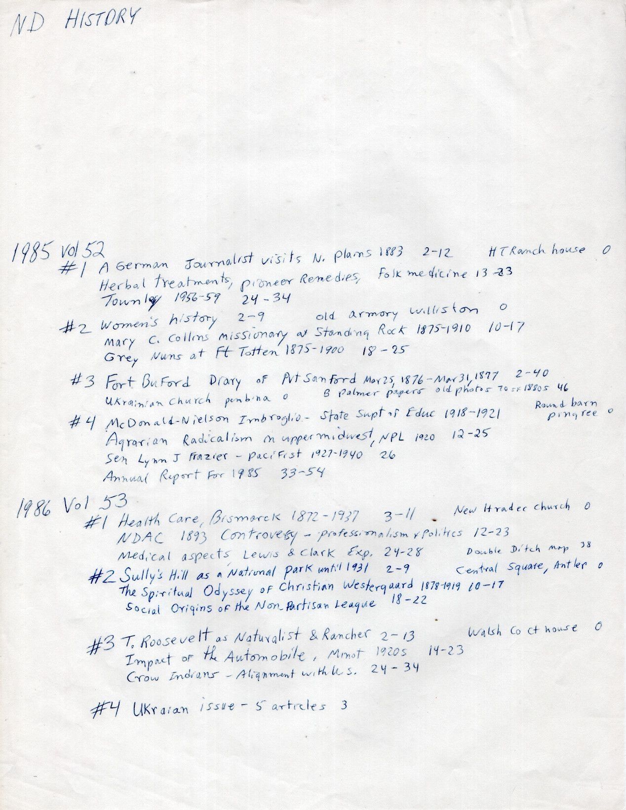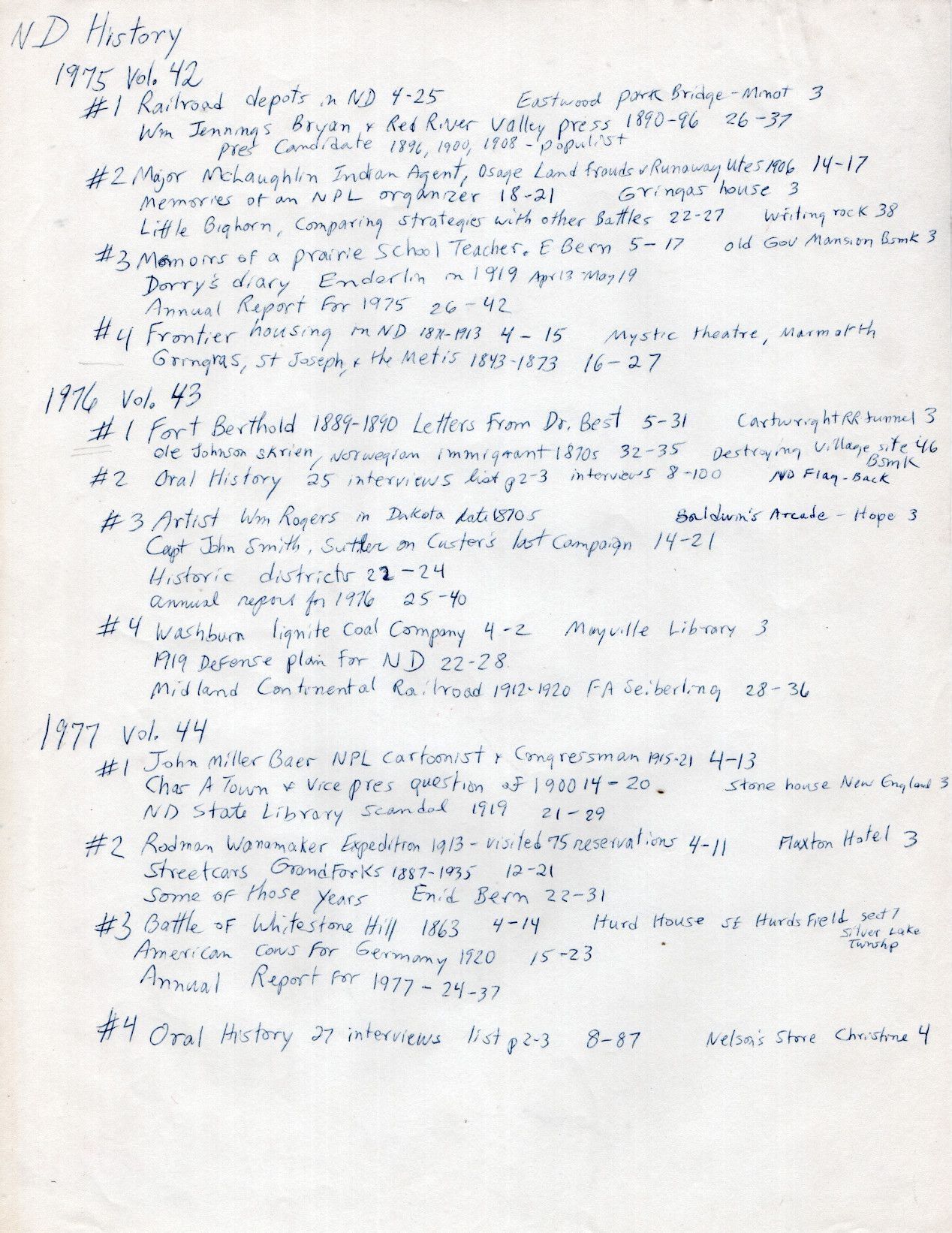 In addition, Jim Ahrlin has provided 7 pages of hand-written notes highlighting some of the papers in issues of the journal (see below). A notation at the bottom of page 1 lists which North Dakota History journal issues are missing, either completely or in part.Acquisition