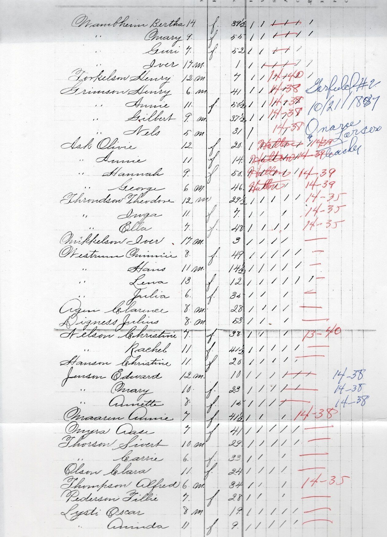0n 21 October 1887, Garfield School No. 1 teacher Marce Larson reported attendances and studies pursued for 38 students: Annie Ask, George Ask, Hannah Ask, Olivie Ask, Julius Digness, Clarence Eggen, Annie Grimson, Gilbert Grimson, Henry Grimson, Nels Grimson, Christine Hanson, Annette Jenson, Edward Jenson, Mary Jenson, Aminda Lysti, Oscar Lysti, Annie Maaren, Iver Mikkelson, Aase Myra, Christine Nelson, Rachel Nelson, Clara Olson, Tillie Pederson, Alfred Thompson, Carrie Thorson, Sivert Thorson, Ella Throndson, Inga Throndson, Theodore Throndson, Henry Torkelson, Bertha Wambheim, Guri Wambheim, Iver Wambheim, Mary Wambheim, Hans Westrum, Julia Westrum, Lena Westrum, Minnie Westrum.