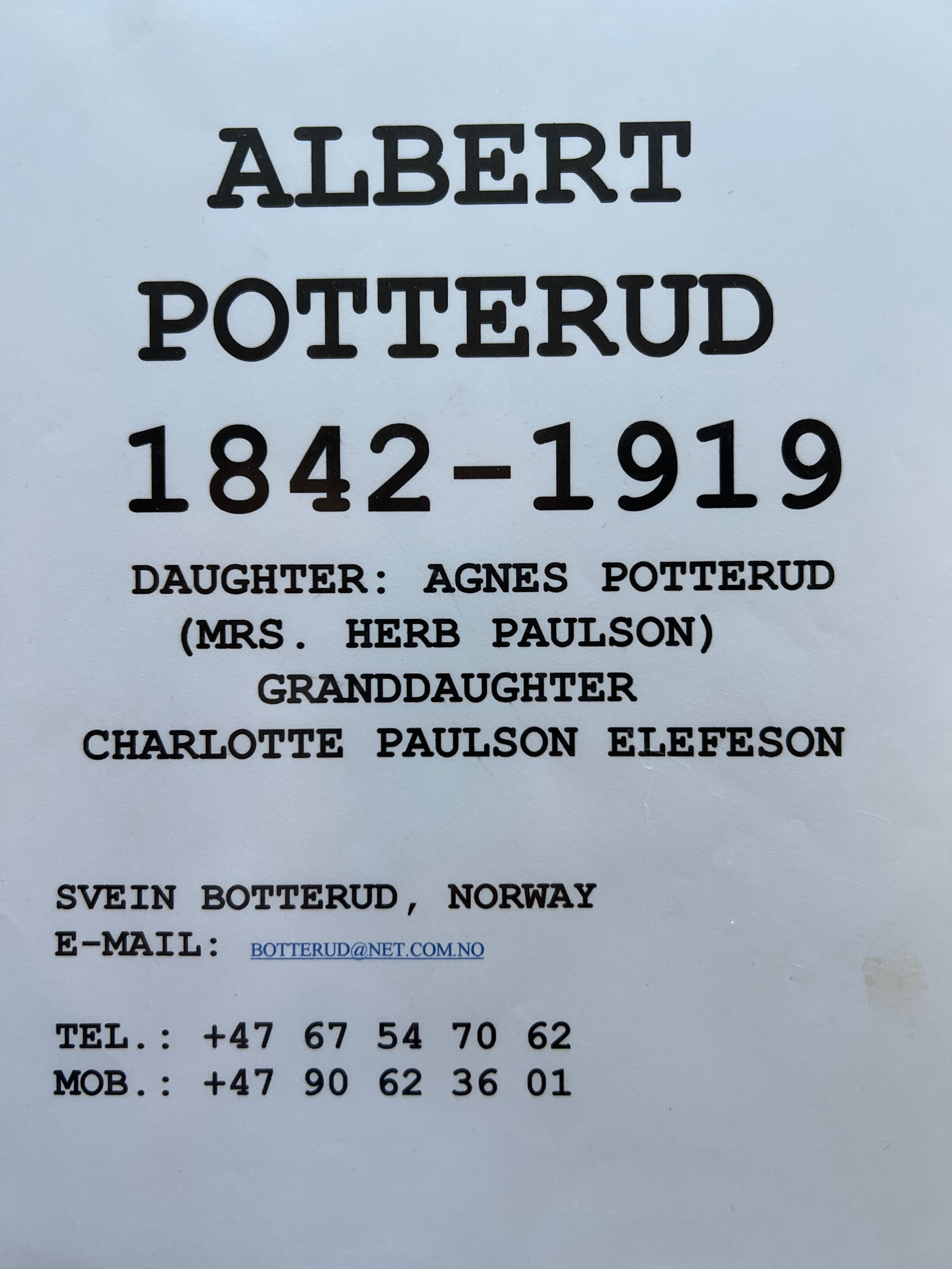 This folder has reports on the ancestors (back to 1185) and descendants of Albert Potterud (1842 - 1919) and his wife Charlotte Floberg (1864 - 1933).Cataloged By