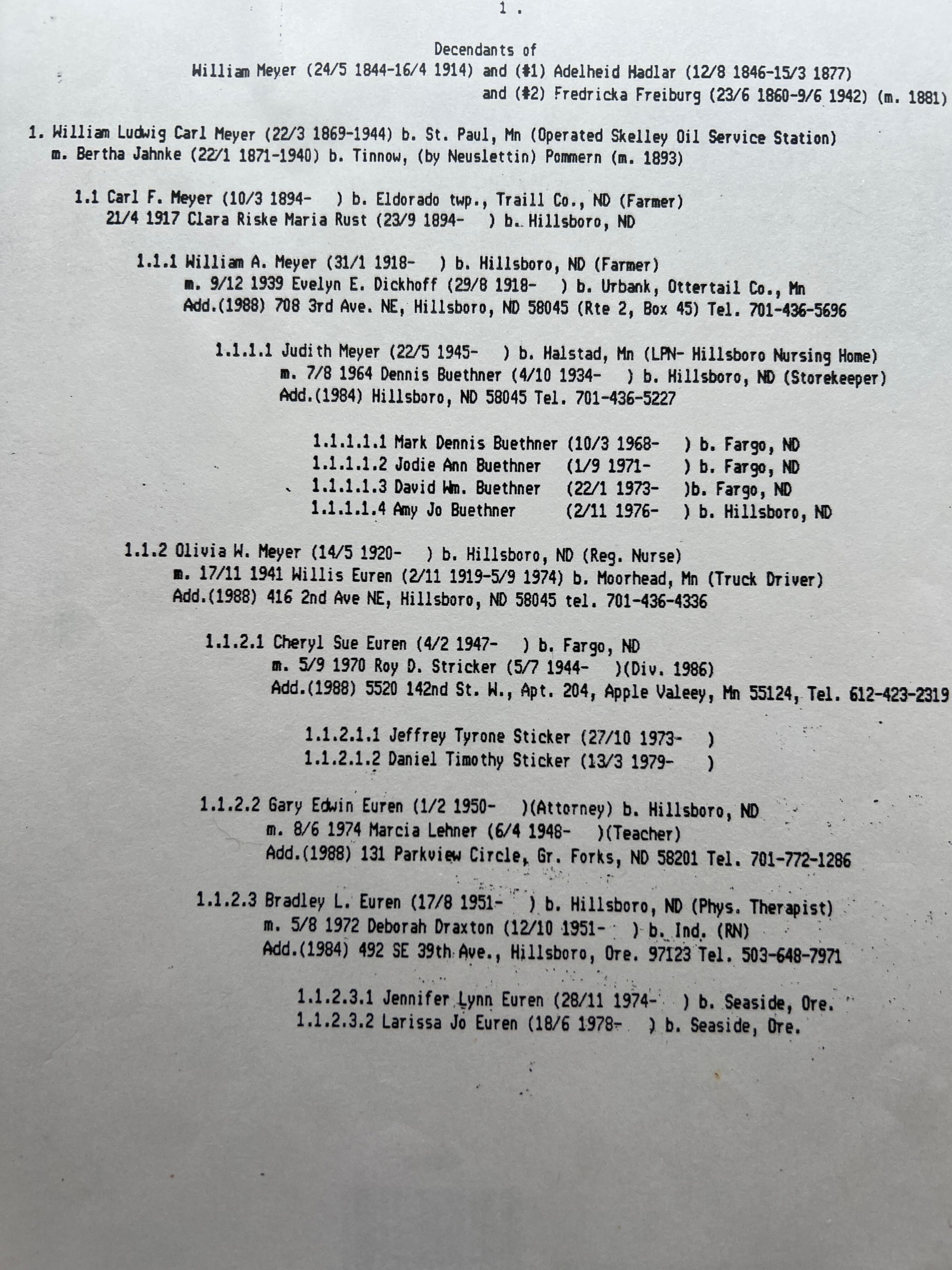 A folder with a blue ring-binder of an outline report of descendants of William and Adelheid (Hardtler) Meyer, early settlers in Traill County. This Meyer family history was a gift to the TCHS from Norma Schultz in 1992 (first TCHS accession card D 493).Cataloged By