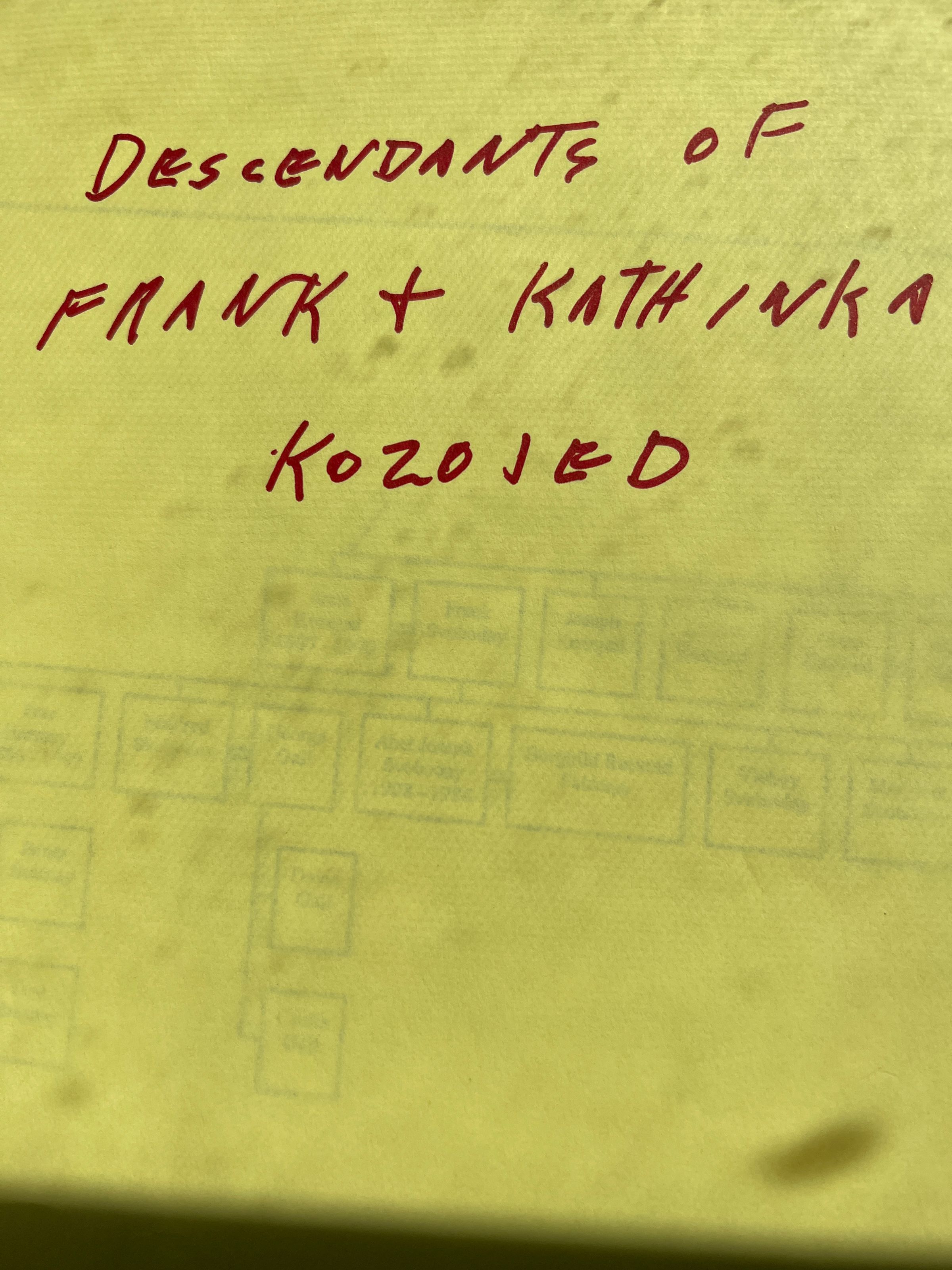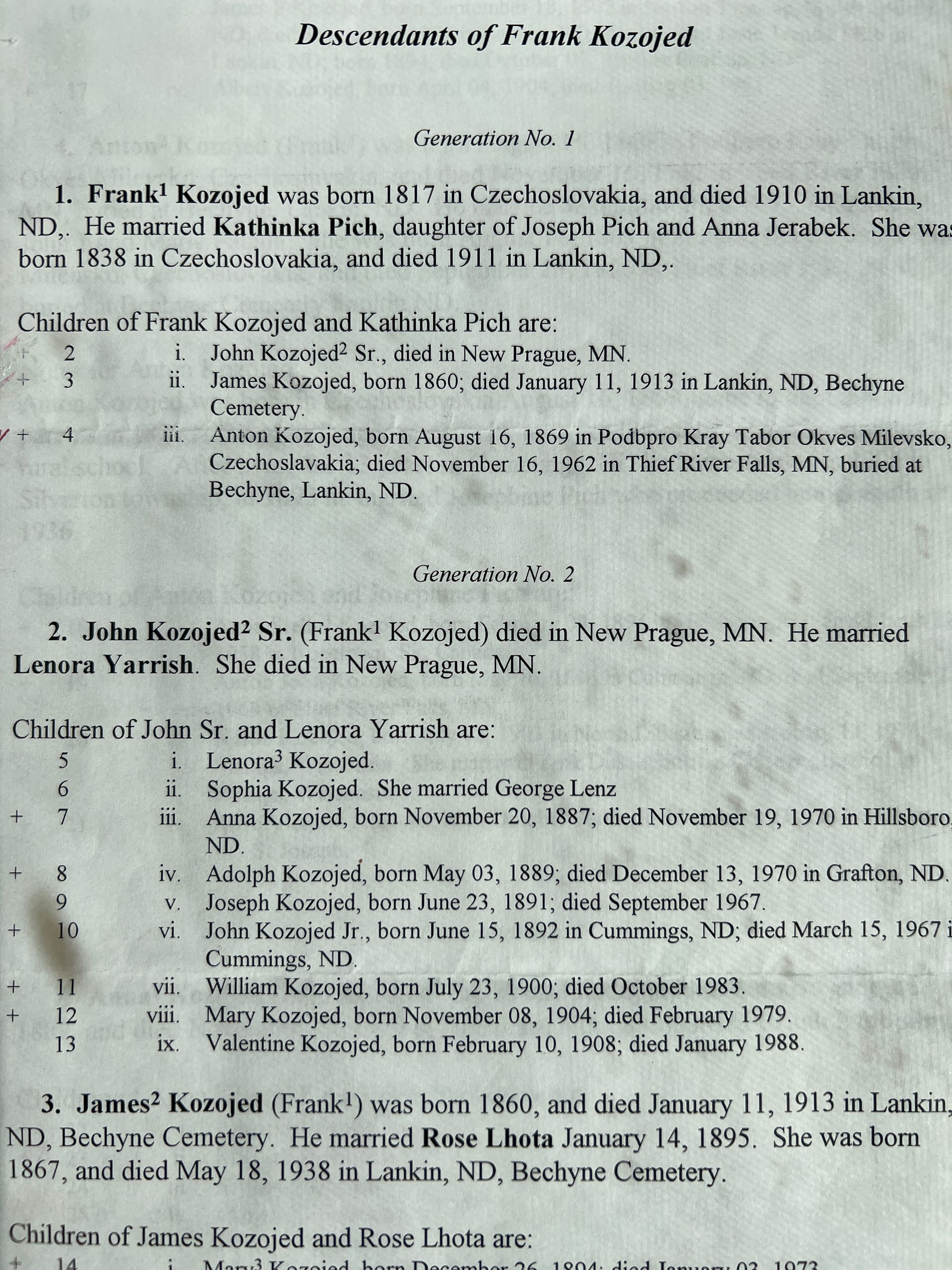 This folder has a multi-page document on the lives and descendants of Frank (1817 - 1910) and Kathinka (Pich) (1838 - 1911) Kozojed compiled by Lois (Henn) Kozojed. The document includes a family tree and generation information summaries; obituaries for Garfield Kozojed (1889 - 1956), James Bruce Kozojed (1932 - 1995), John Kozojed (1892 - 1967), Anna (Kozojed) Svobodny (1887 - 1970), William Kozojed (1900 - !983), Esther Kozojed (1900 - 1999); and an article of unknown origin about Anton and Josephine (Pich) Kozojed.Cataloged By