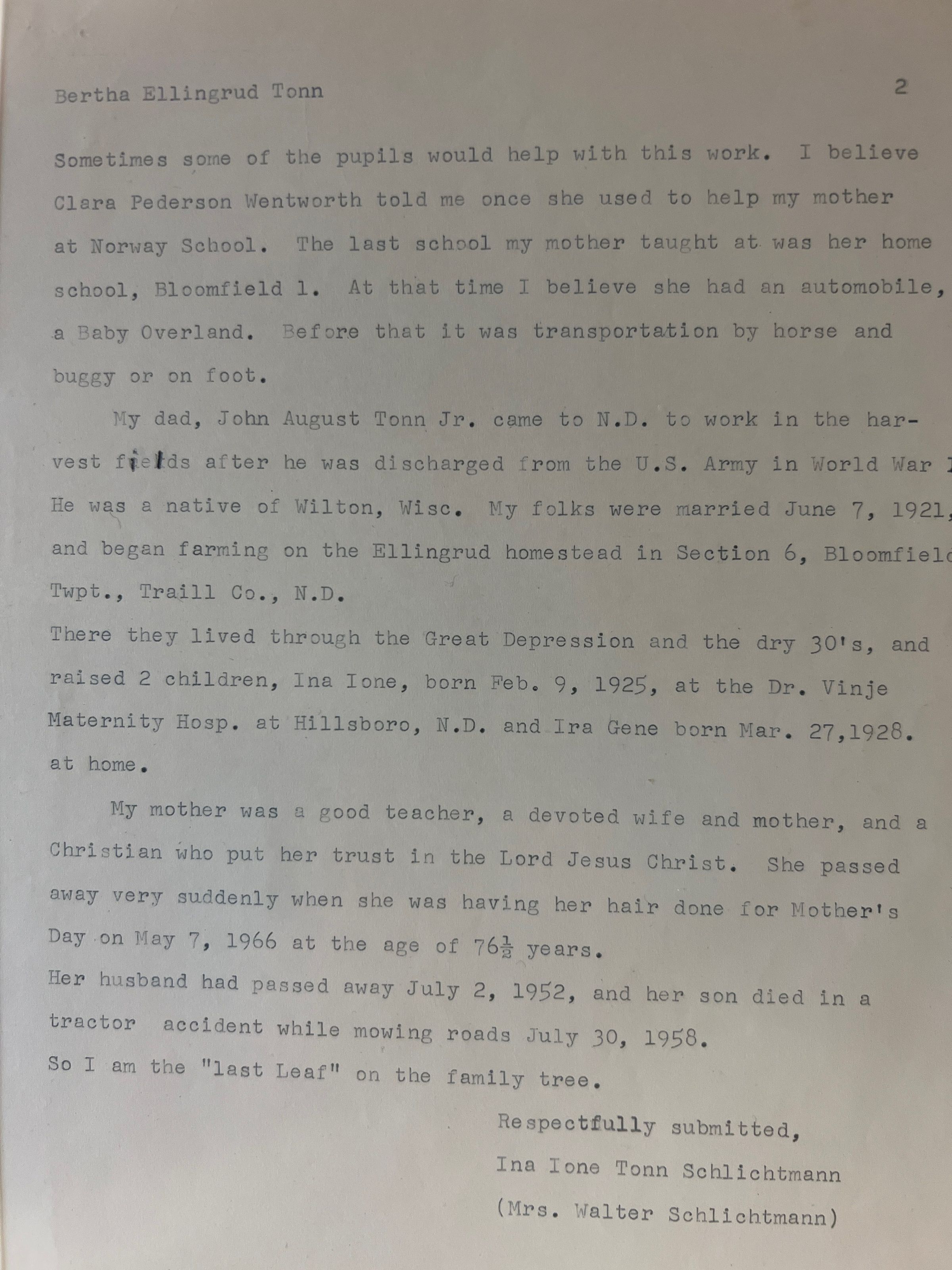 After graduating, she taught schools by Portland, Cummins and Norway Township School #3 for about 10 years. Bertha Ellingrud married John Tonn in 1921, after he was discharged from the US Army after WWI. After marrying, John and Bertha farmed the original Ellingrud farm in Section 6 in Bloomfield Township. Bertha (Ellingrud) and John Tonn had two children, Ina Tonn (b. 1925) and Ira Tonn (b. 1928). Ira was killed in a tractor accident in 1958. John Tonn passed away in 1952 and Bertha (Ellingrud) Tonn died, age 76, in 1966.