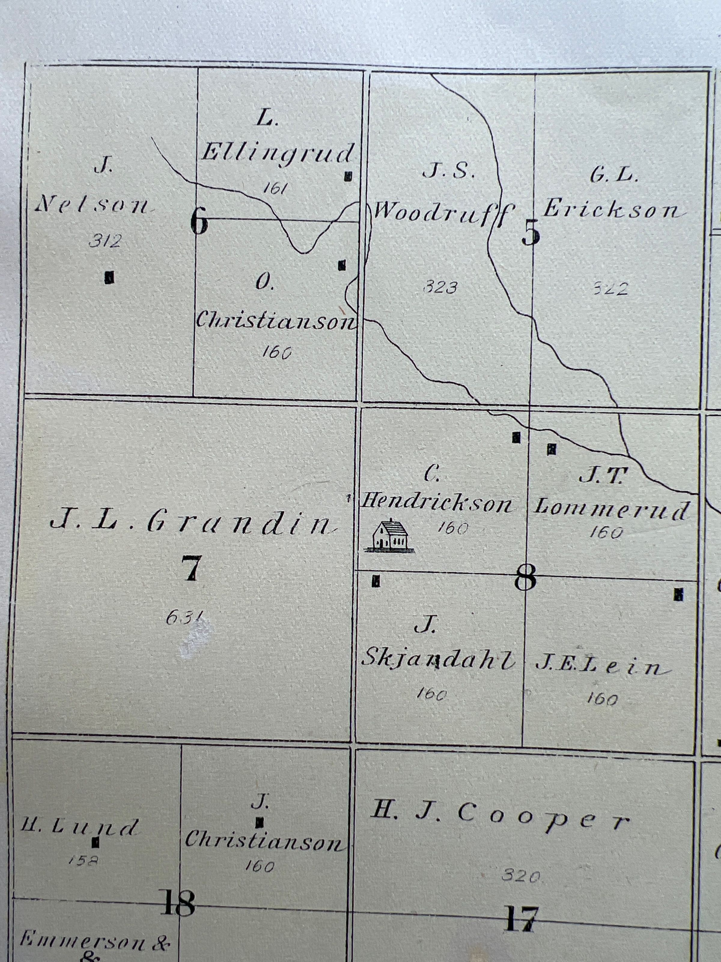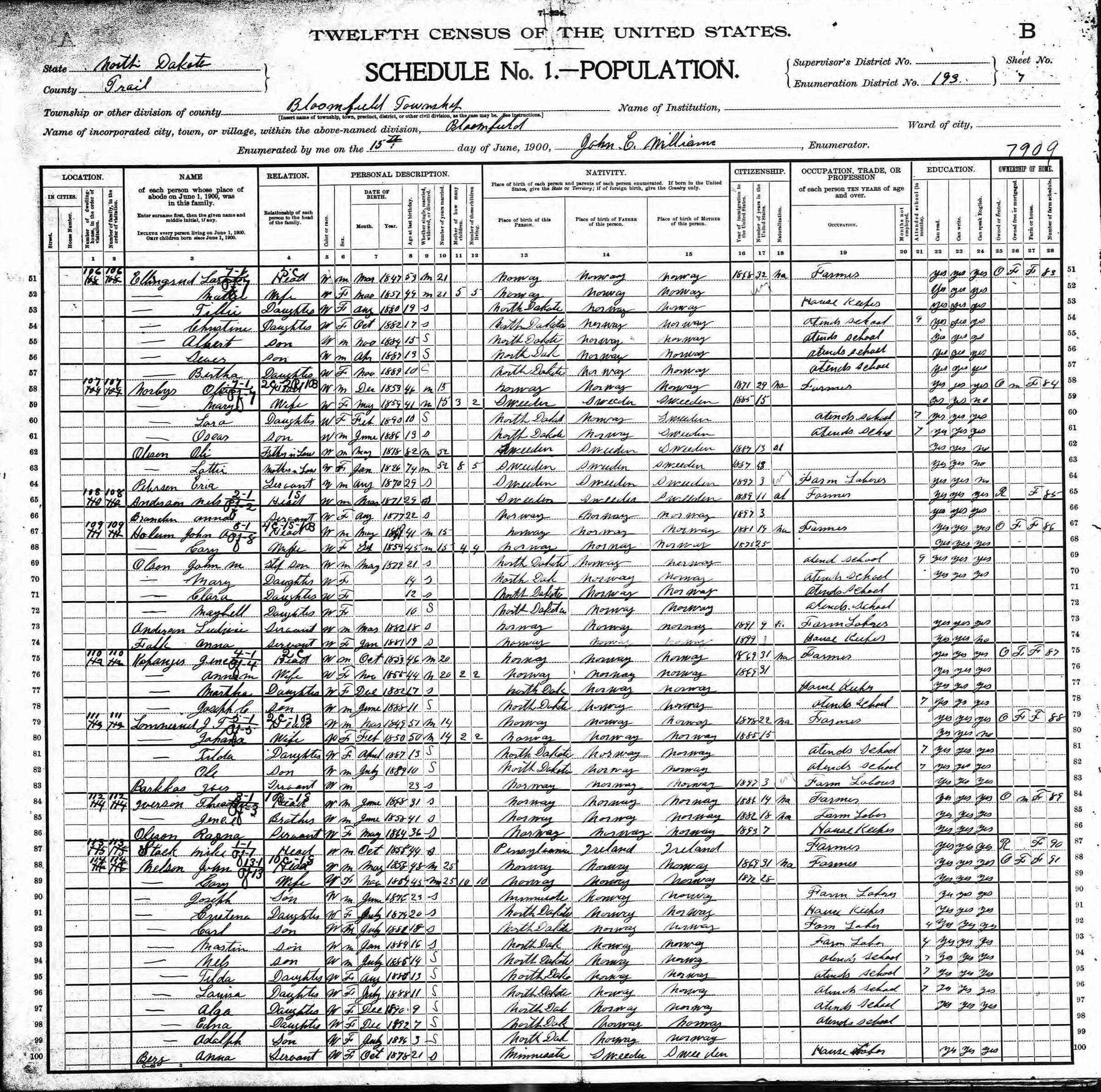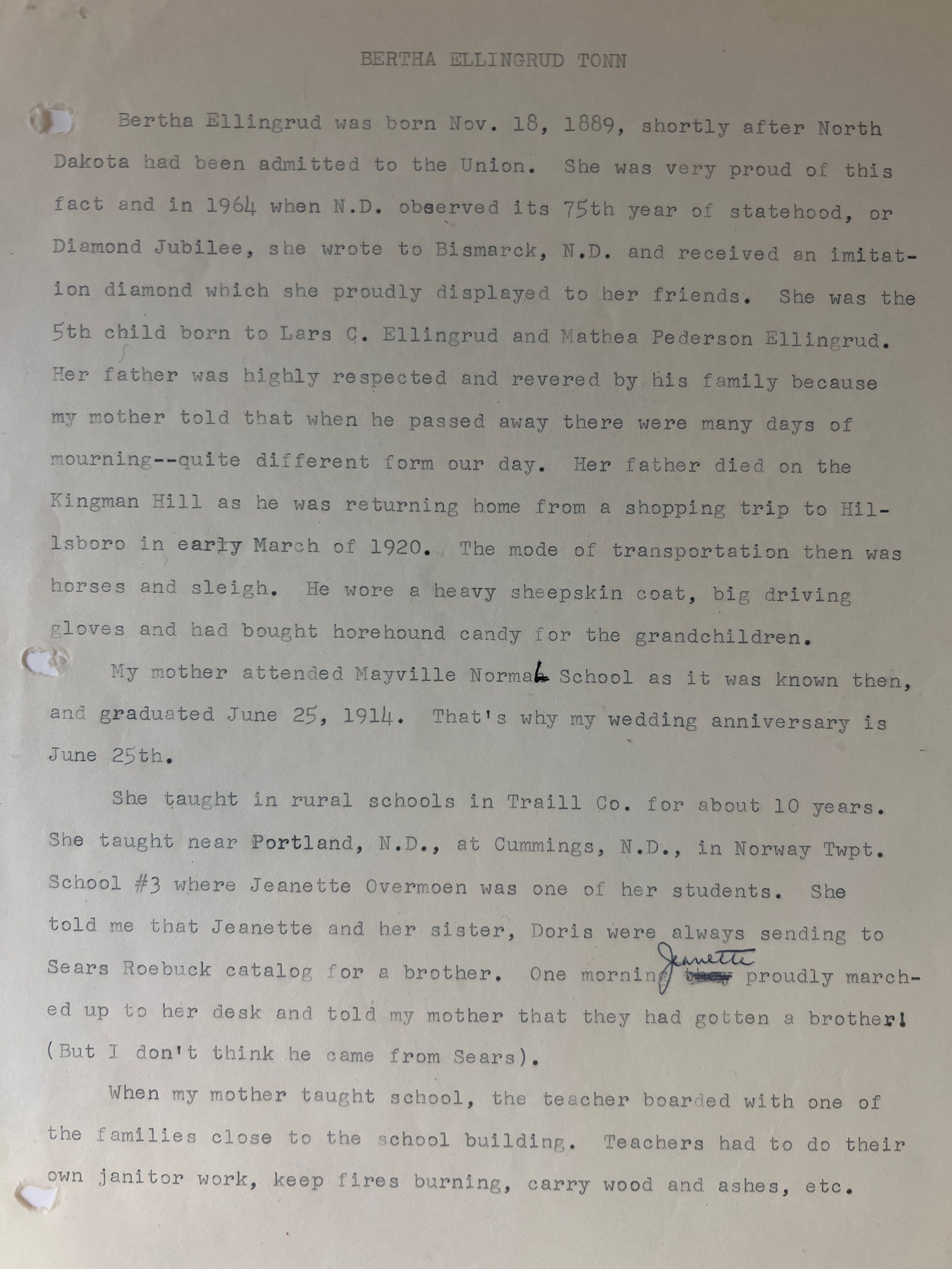 This family history folder contains a two-page document (below) written by Ina (Tonn) Schlichtmann about her mother, Bertha (Ellingrud) Tonn. Bertha was born in 1889, the 5th child of Lars (photo) and Mathea (Pederson) Ellingrud (see 1900 US Census, below). Lars and Mathea (Martha) were pioneers in the NE Qtr. of Section 6 in Bloomfield Township, Traill County, DT (see 1892 plat map). Bertha Ellingrud was raised on the original Ellingrud farm in Bloomfield Township and attended Bloomfield School #1, which is now on display at the Traill County Historical Society Museum's Pioneer site in Hillsboro. Bertha also attended Mayville Normal School (now Mayville State University) to become a teacher.